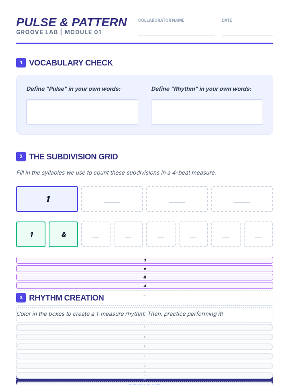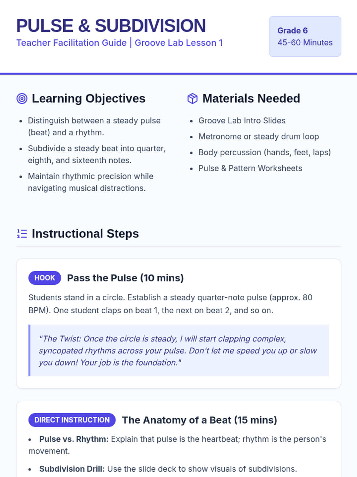 This sequence guides 7th-grade instrumentalists through the complexities of rhythmic subdivision, compound meter (6/8), and syncopation. Students move from basic pulse stability to performing interlocking chamber music with rhythmic independence.