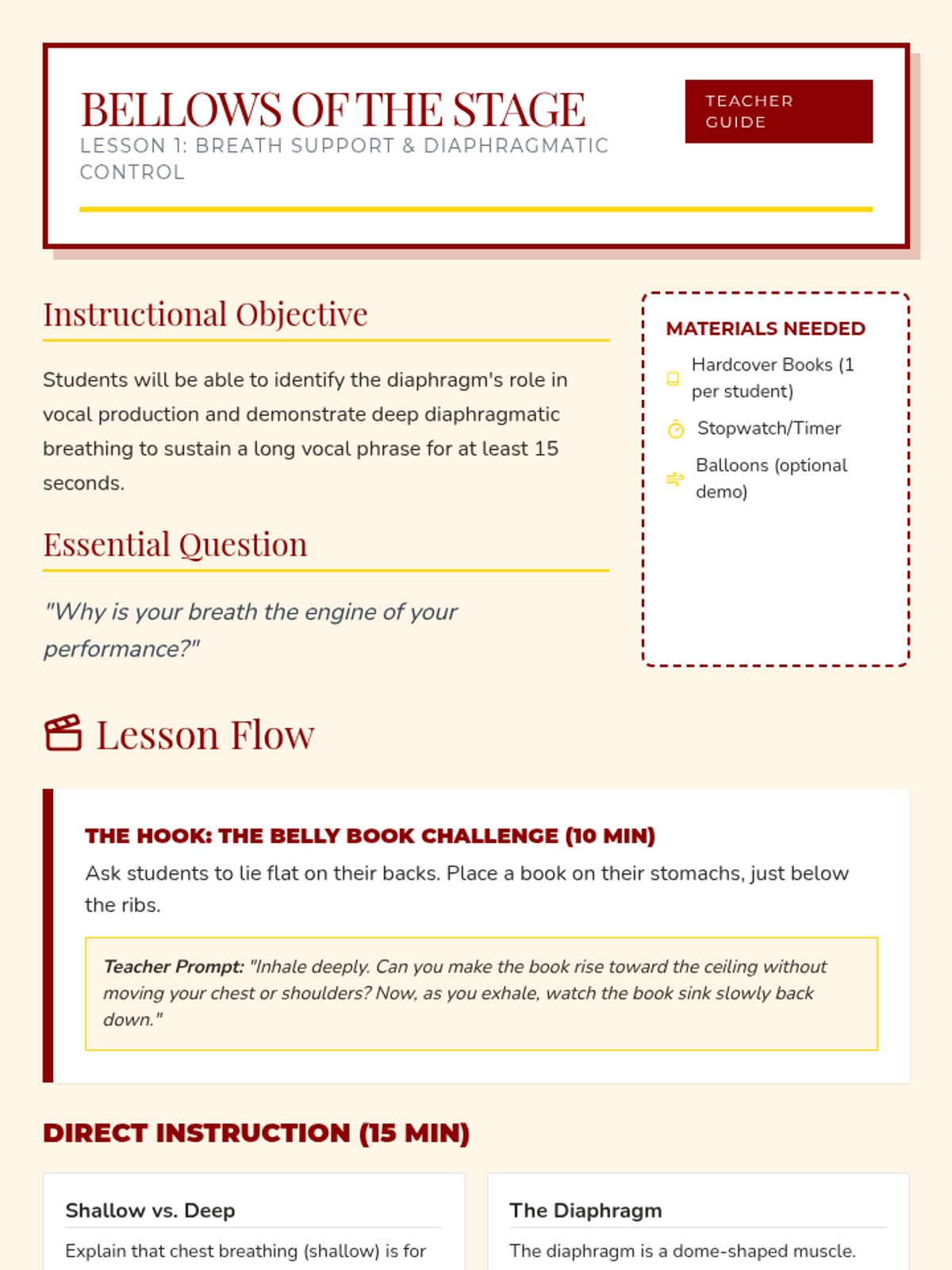 A comprehensive unit for 6th-grade theater students focusing on breath support, articulation, projection, and vocal variety. Students learn to use their voices as powerful tools for storytelling through technical exercises and a final reader's theater performance.