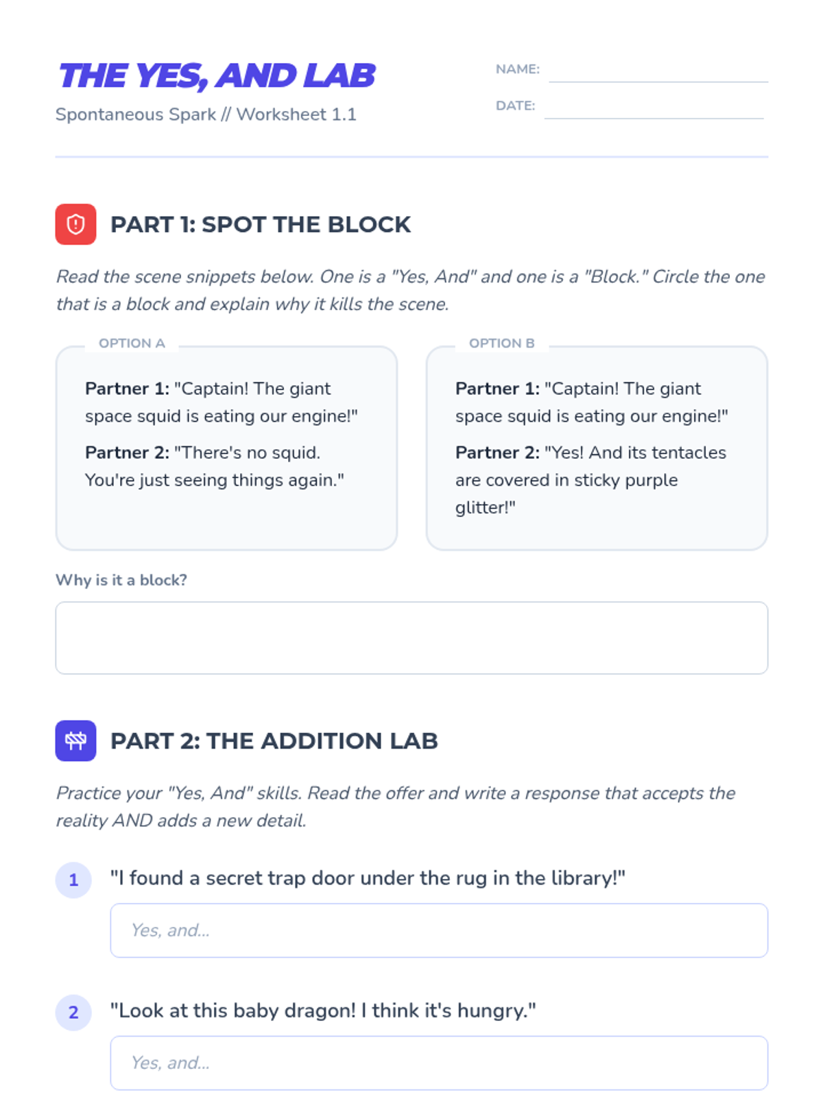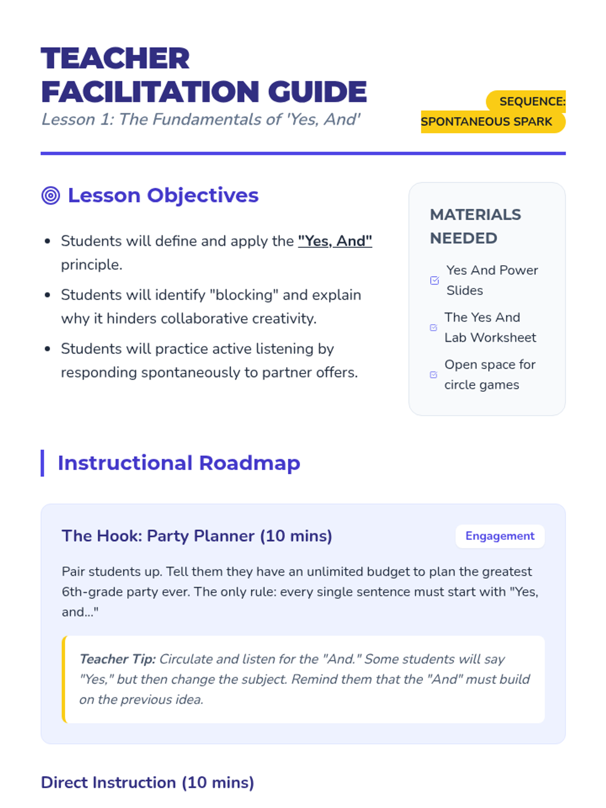 This sequence develops improvisation skills and ensemble collaboration, teaching students to react authentically in the moment. Students build trust and creative confidence by practicing 'Yes, And,' establishing environments, and solving narrative problems as a team.