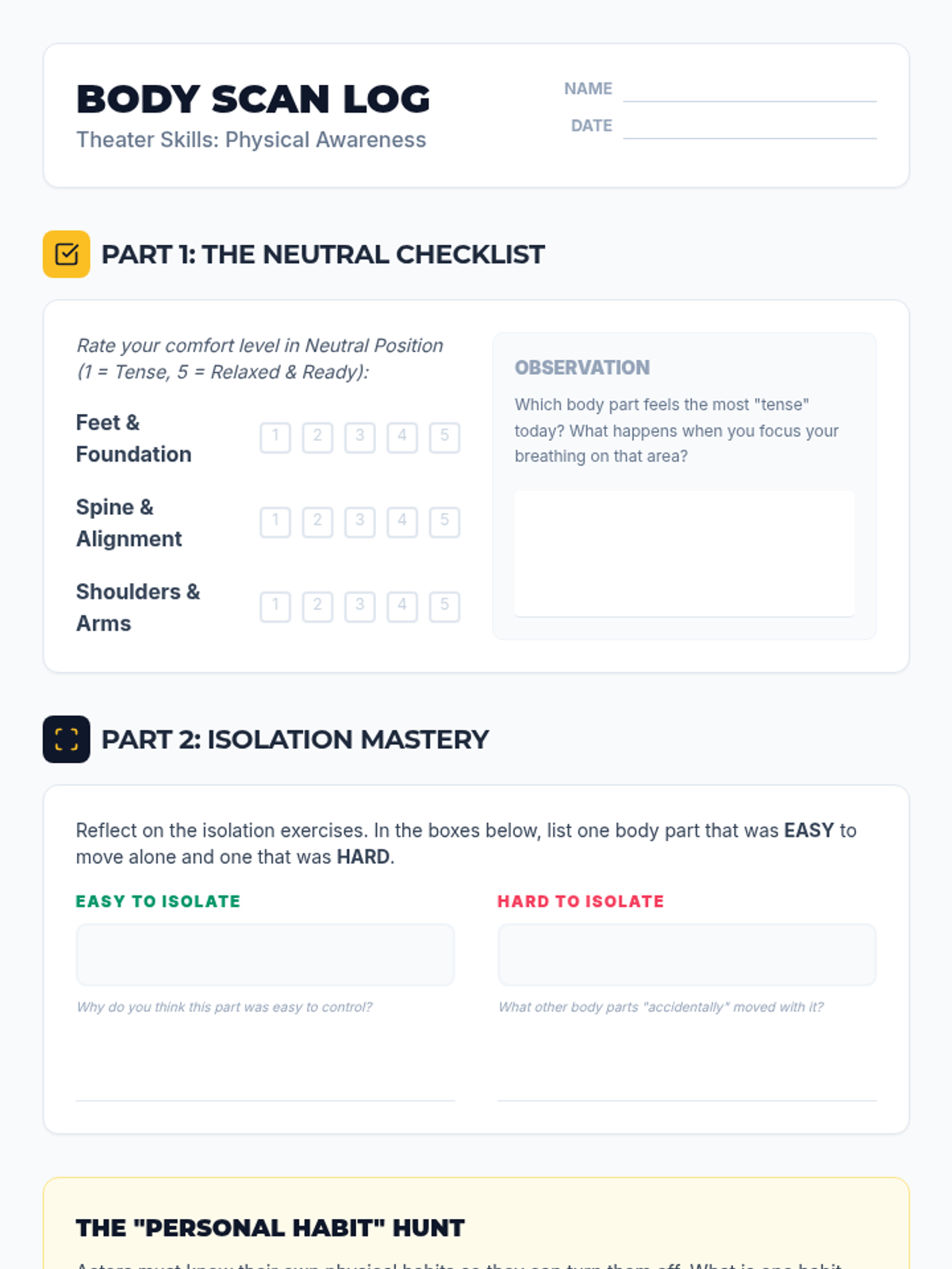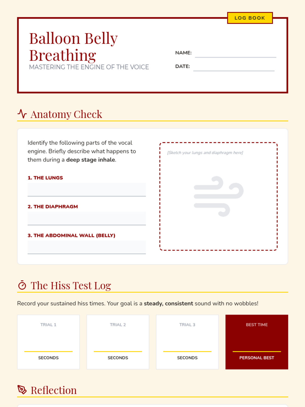 This sequence targets the vocal mechanics necessary for stage acting, emphasizing clarity, volume, and emotional resonance. Students move through a mastery-based progression of breathing techniques, articulation drills, and tonal variation exercises.