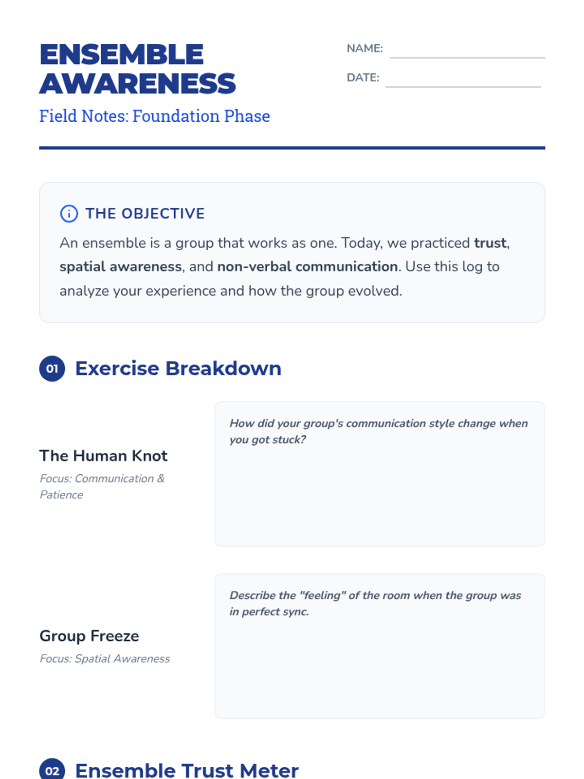 A middle school theater and creative thinking unit focused on building trust, active listening, and collaborative agility through improvisational techniques. Students progress from basic focus exercises to devising and performing original ensemble pieces.