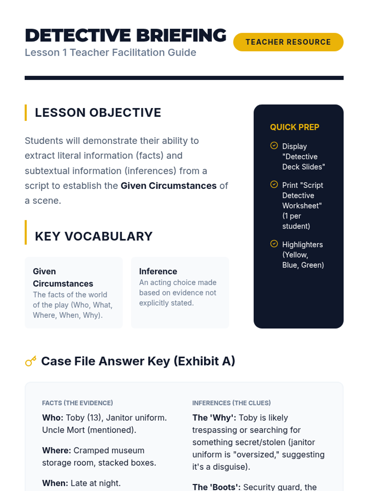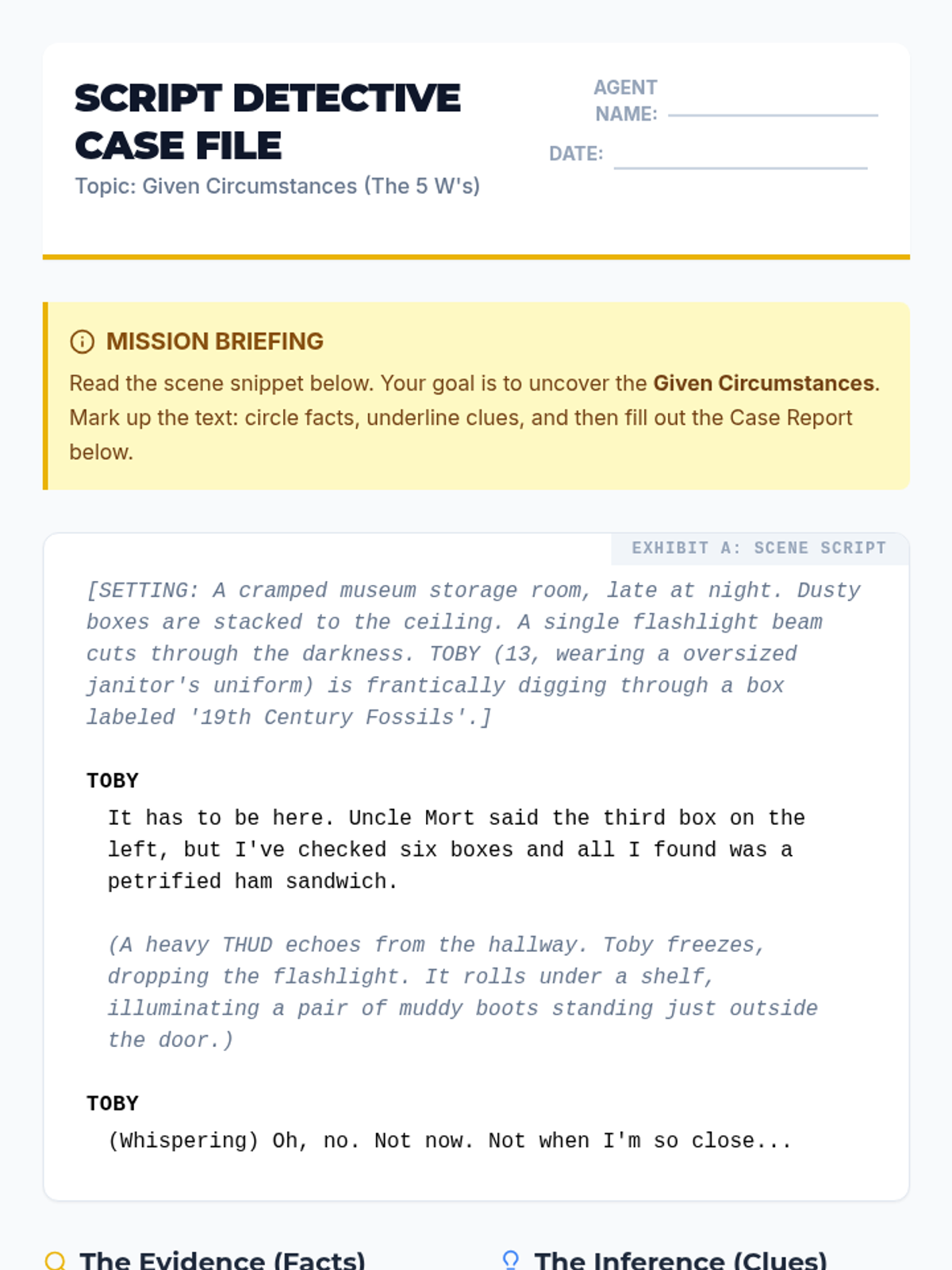 This sequence moves students into the analytical side of acting, teaching them how to interpret a script to build a believable character. Students learn to be 'text detectives,' identifying given circumstances and objectives within a scene to bring a script to life.