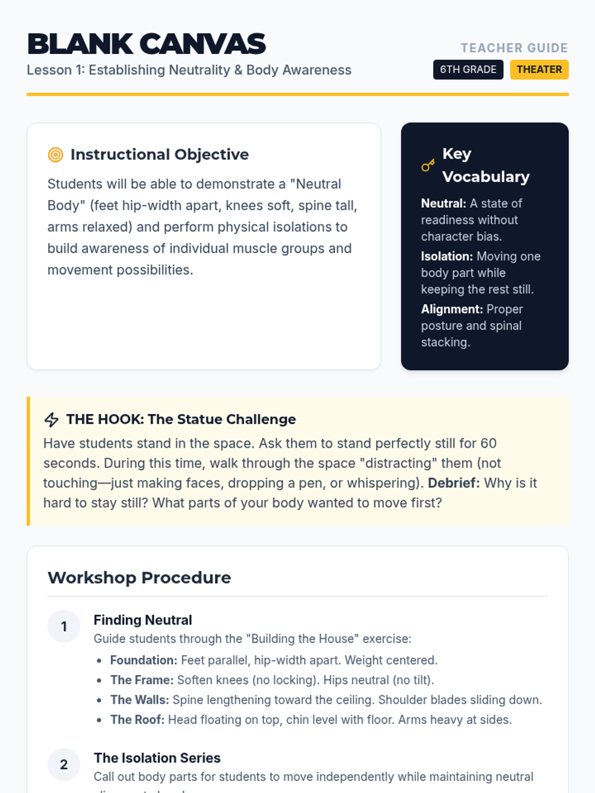 This sequence explores the actor's body as a storytelling tool through neutrality, physical centers, pantomime, and tableau. Students develop non-verbal communication skills culminating in a silent narrative performance.