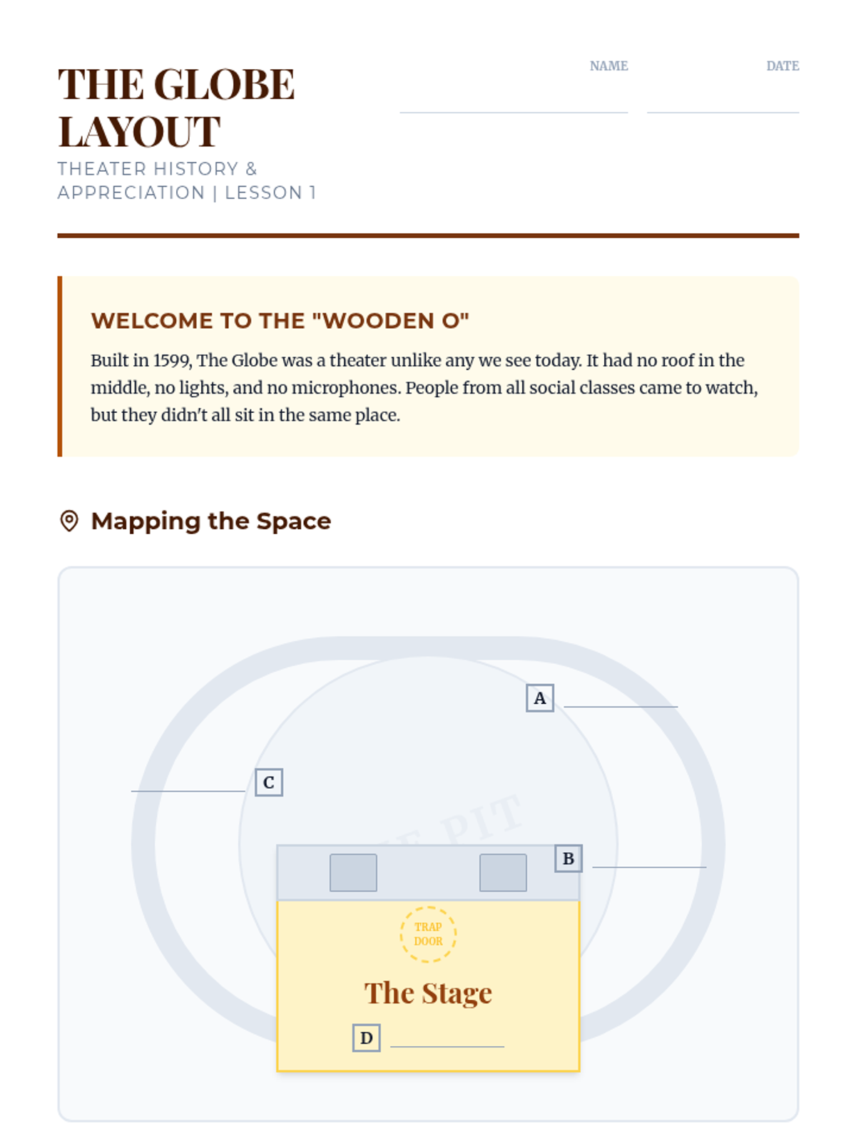 A 5-lesson sequence for 6th-grade students exploring the relationship between Elizabethan stage architecture and Shakespeare's use of language. Students journey from the physical structure of the Globe Theatre to the rhythmic beats of iambic pentameter and the illusions of stage combat.
