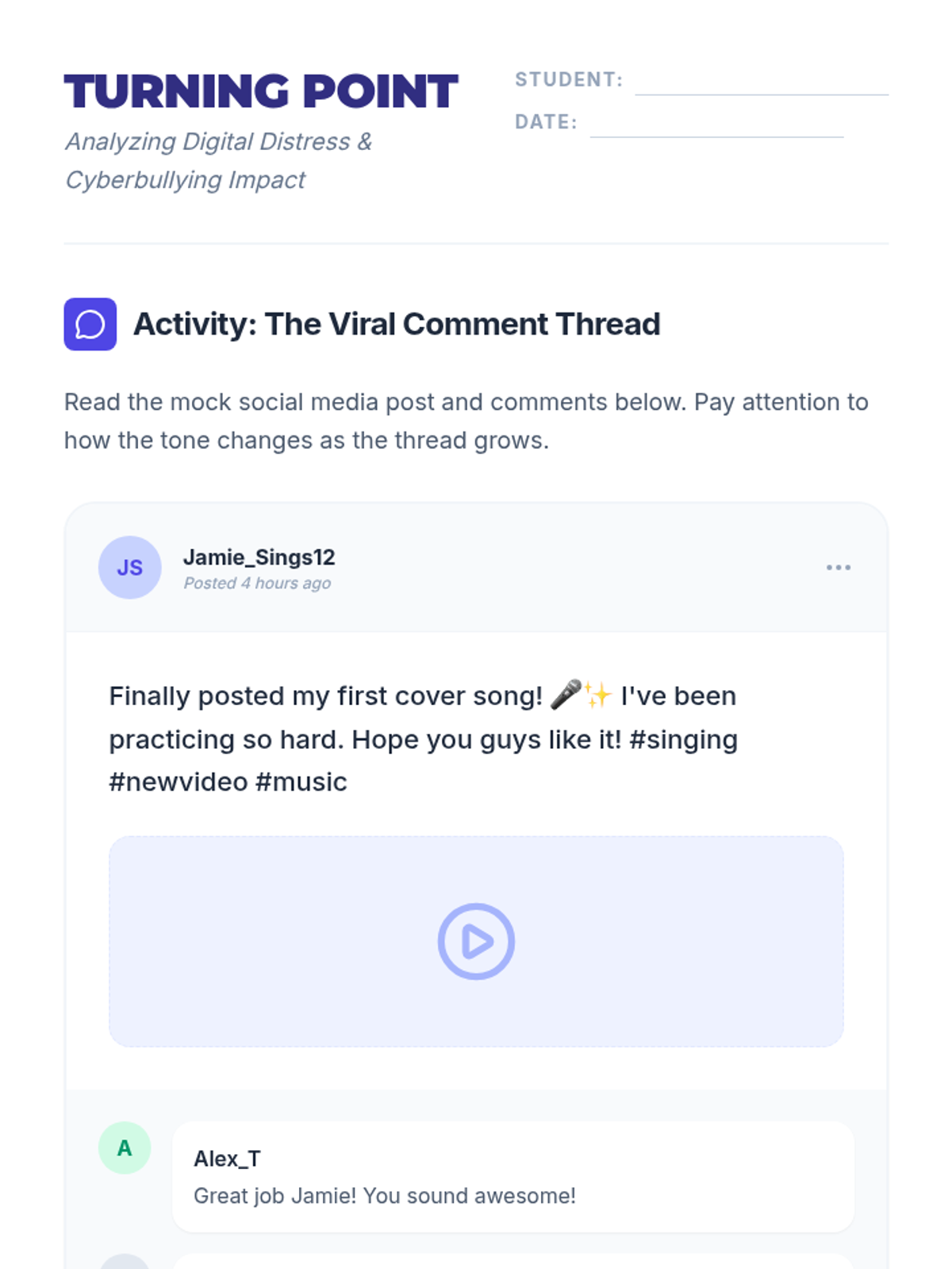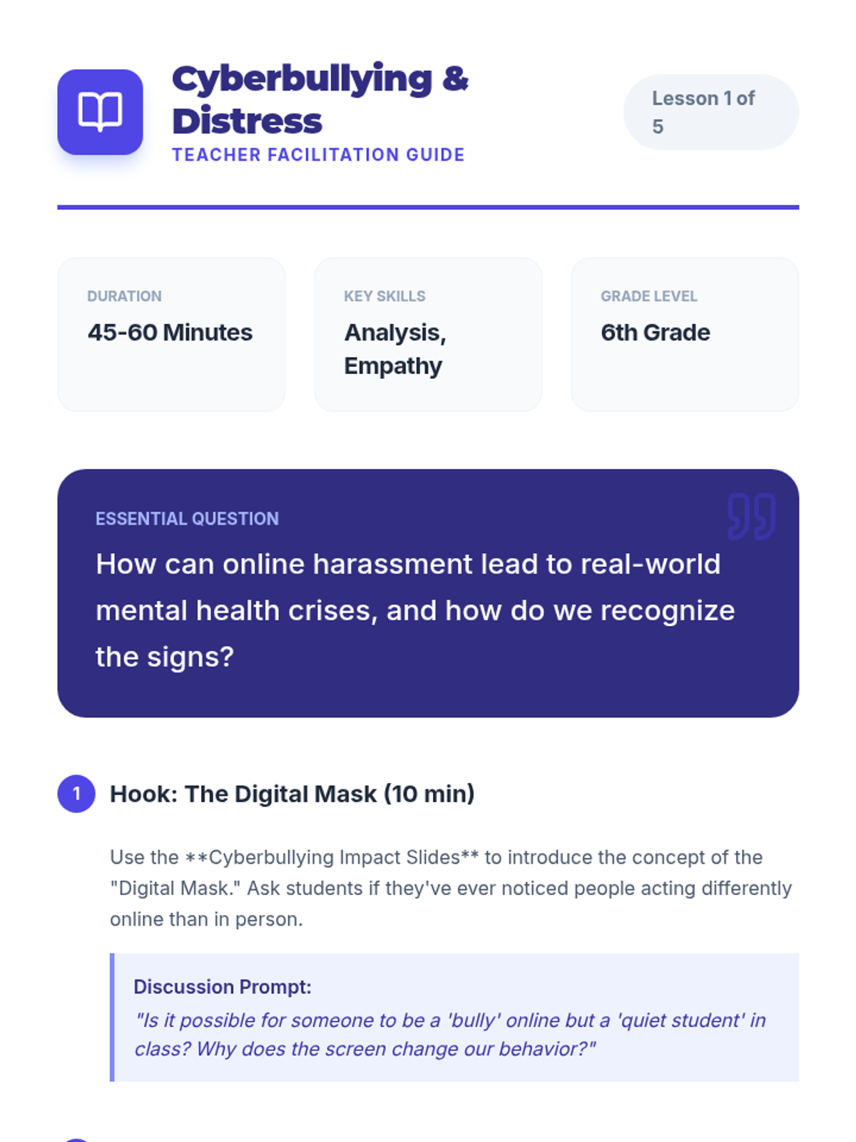 A comprehensive unit for 6th graders on identifying signs of mental health distress in online spaces, understanding the impact of cyberbullying, and learning how to report safety concerns on digital platforms.
