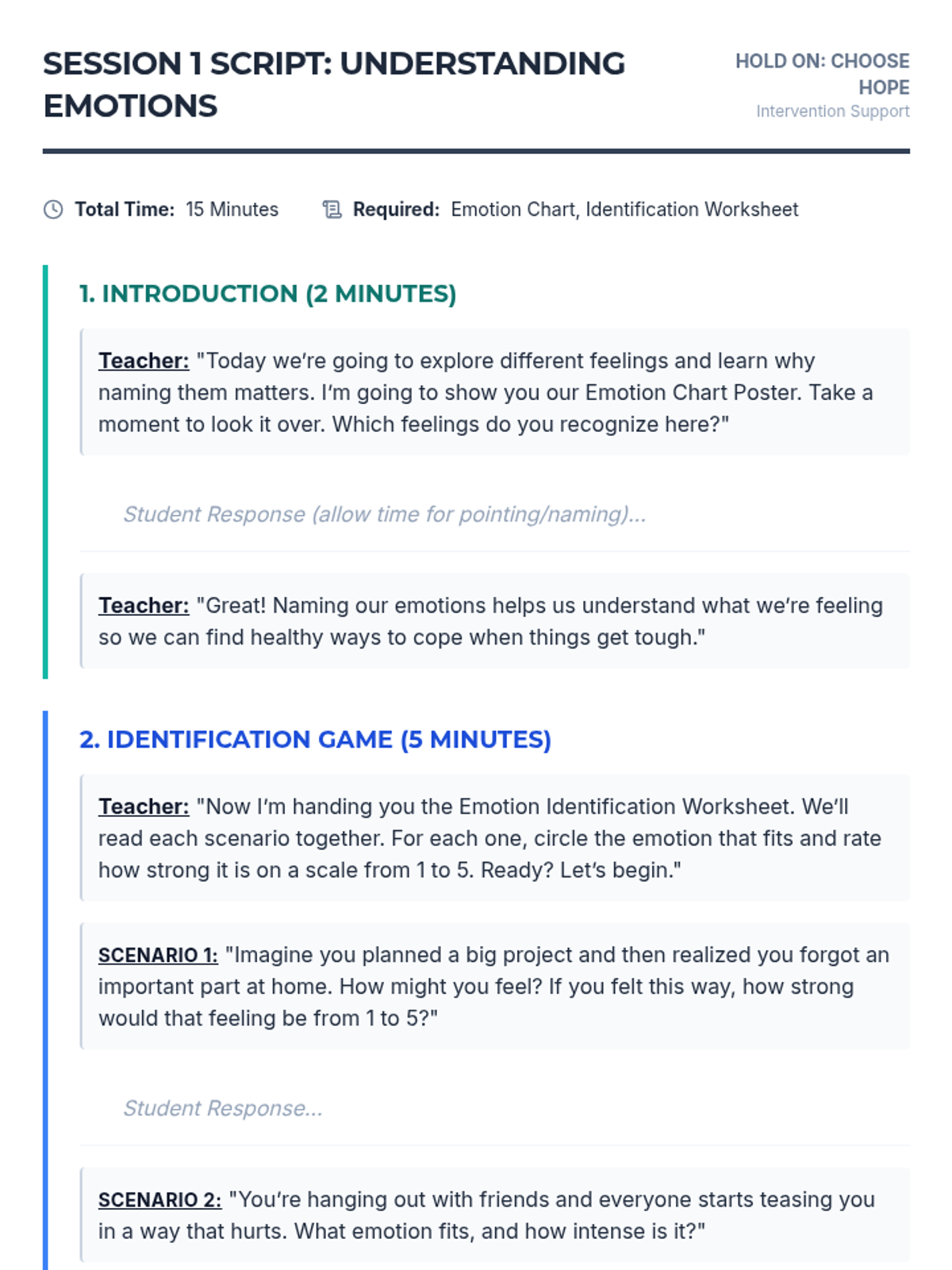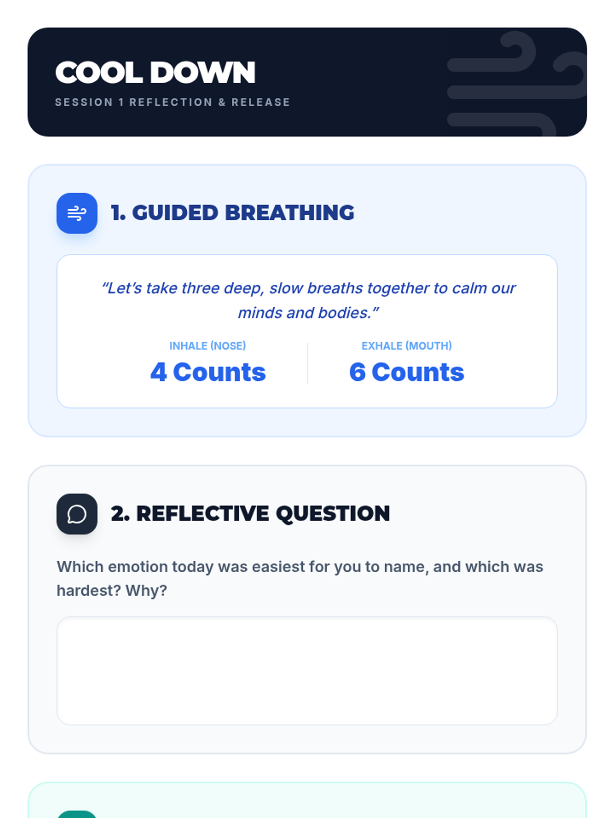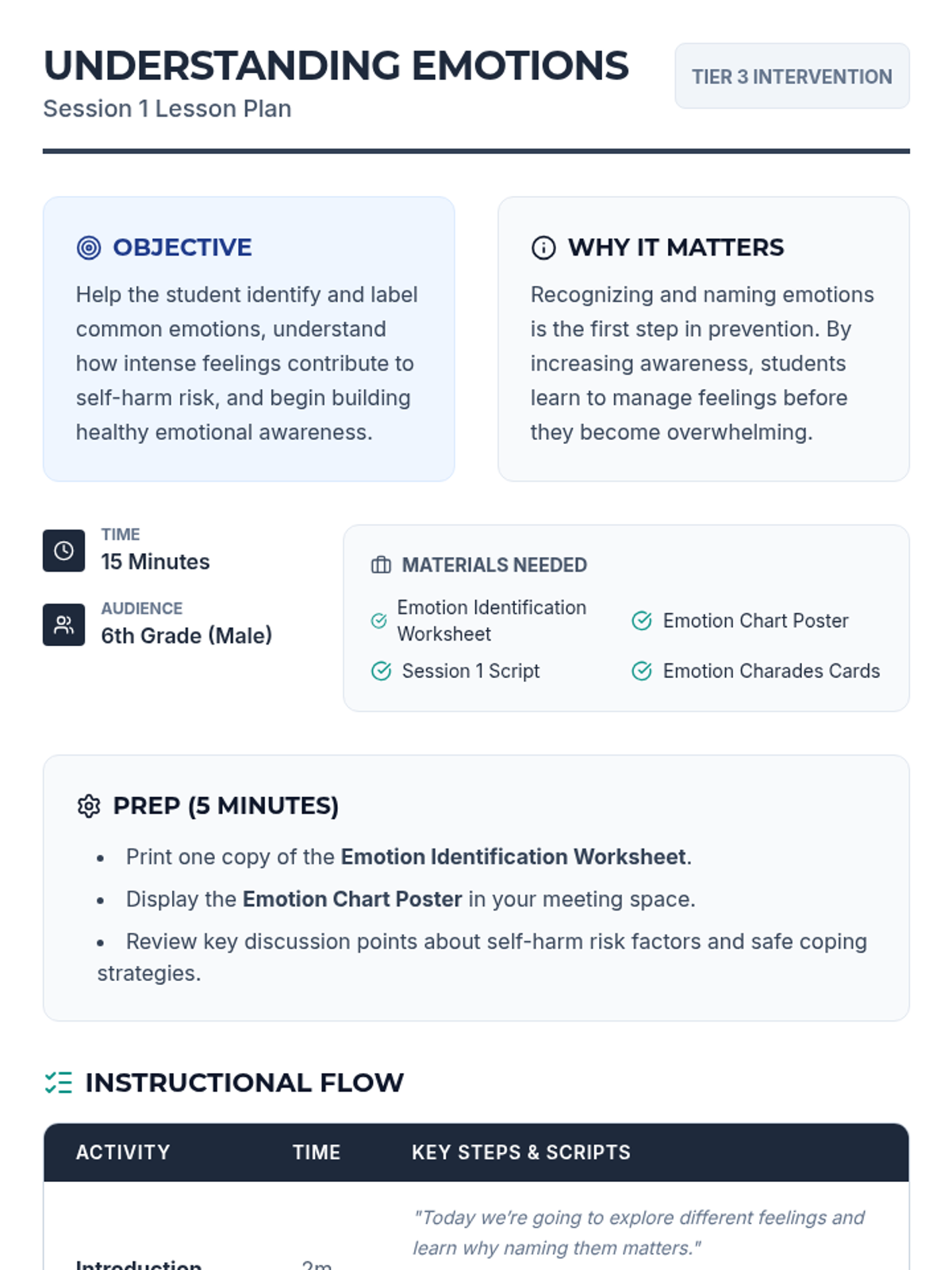 A 4-session Tier 3 individual intervention for 6th-grade students focusing on emotional awareness, coping strategies, support networks, and safety planning for self-harm prevention.