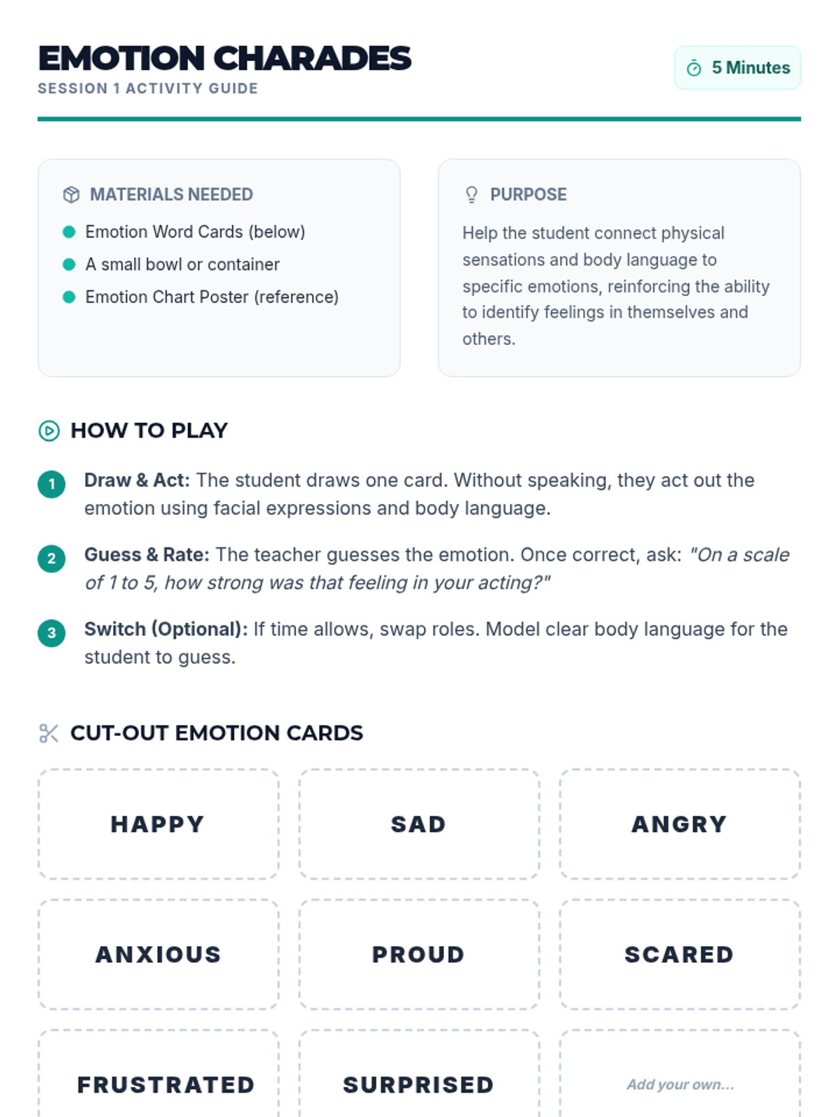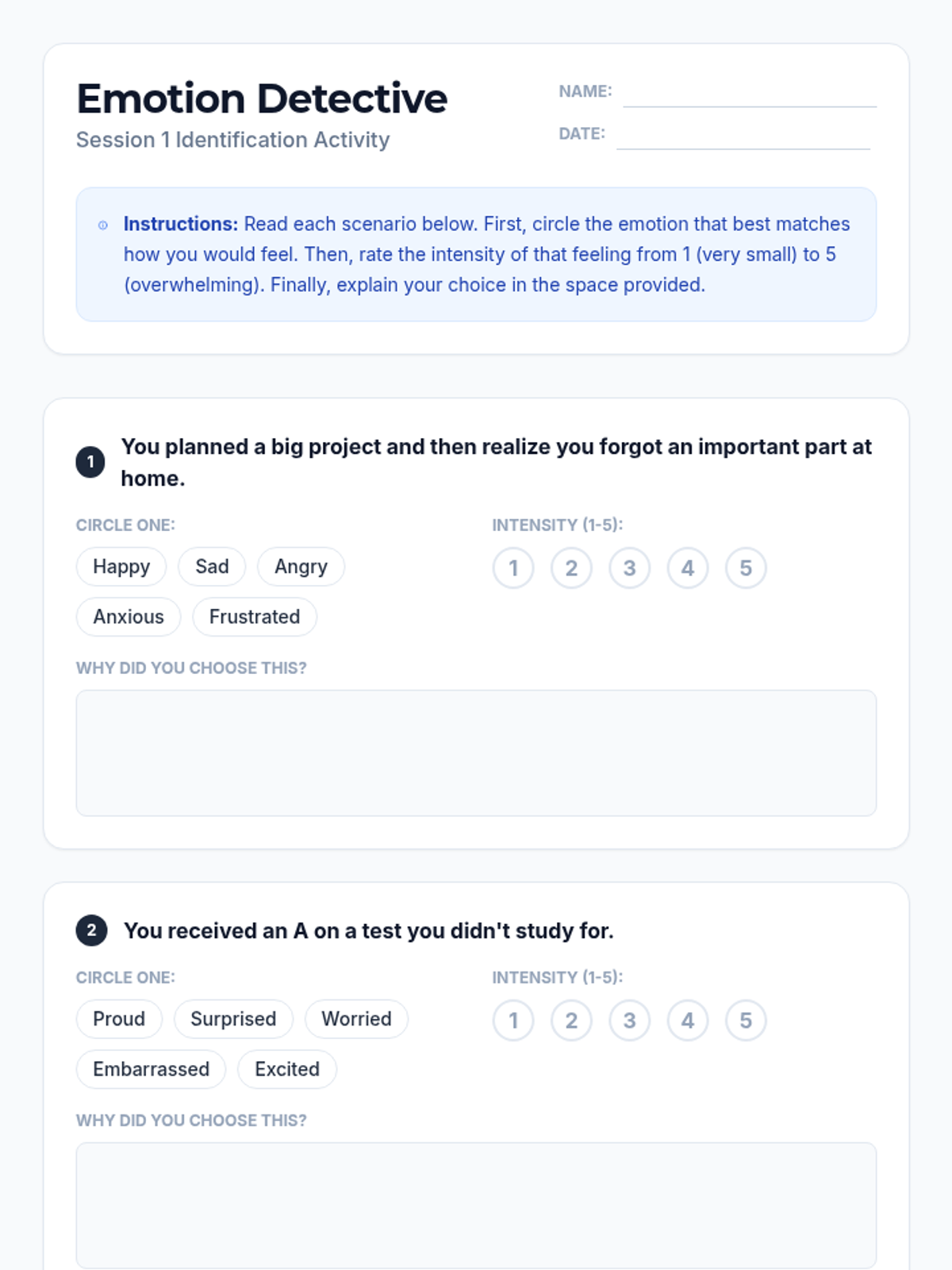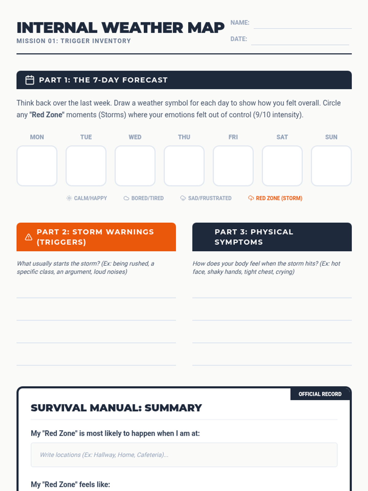 A comprehensive toolkit designed for a 6th-grade student to navigate emotional dysregulation. This sequence focuses on identifying internal triggers, building a personalized strategy toolkit, and establishing a clear safety protocol for crisis moments, providing stability in both school and home environments.