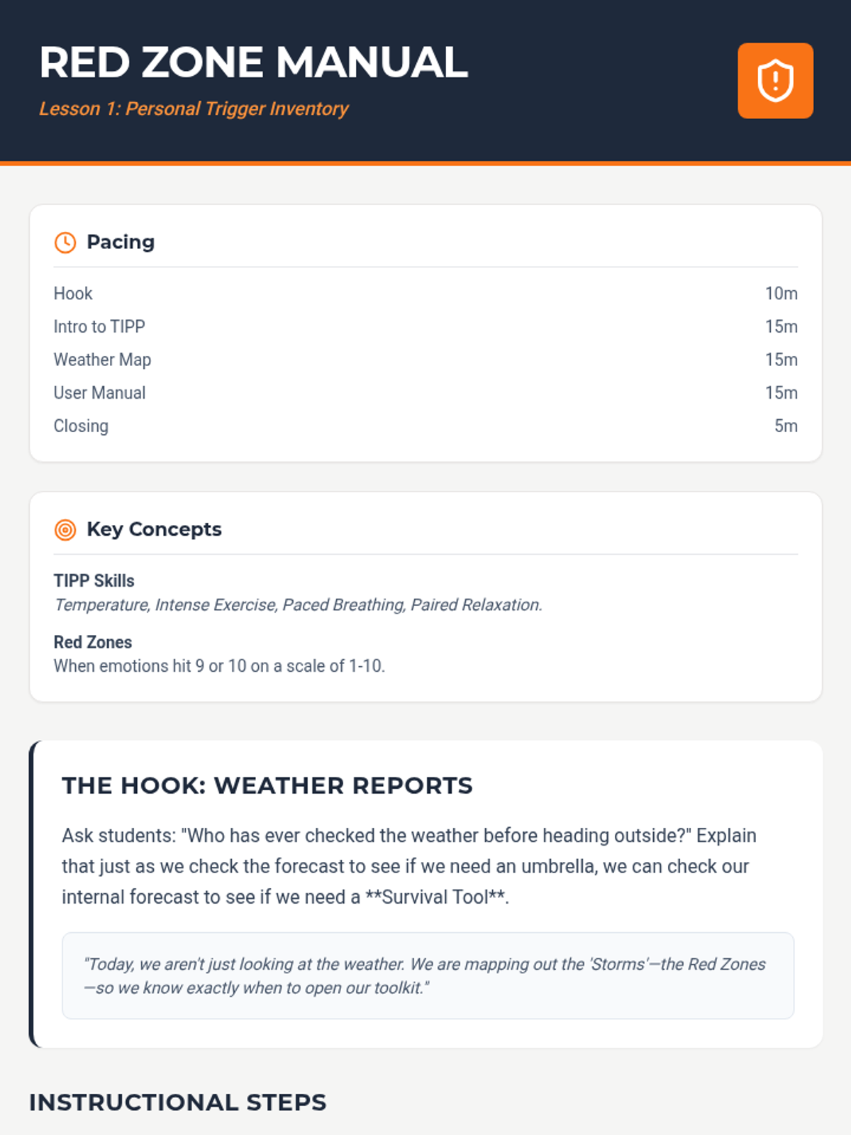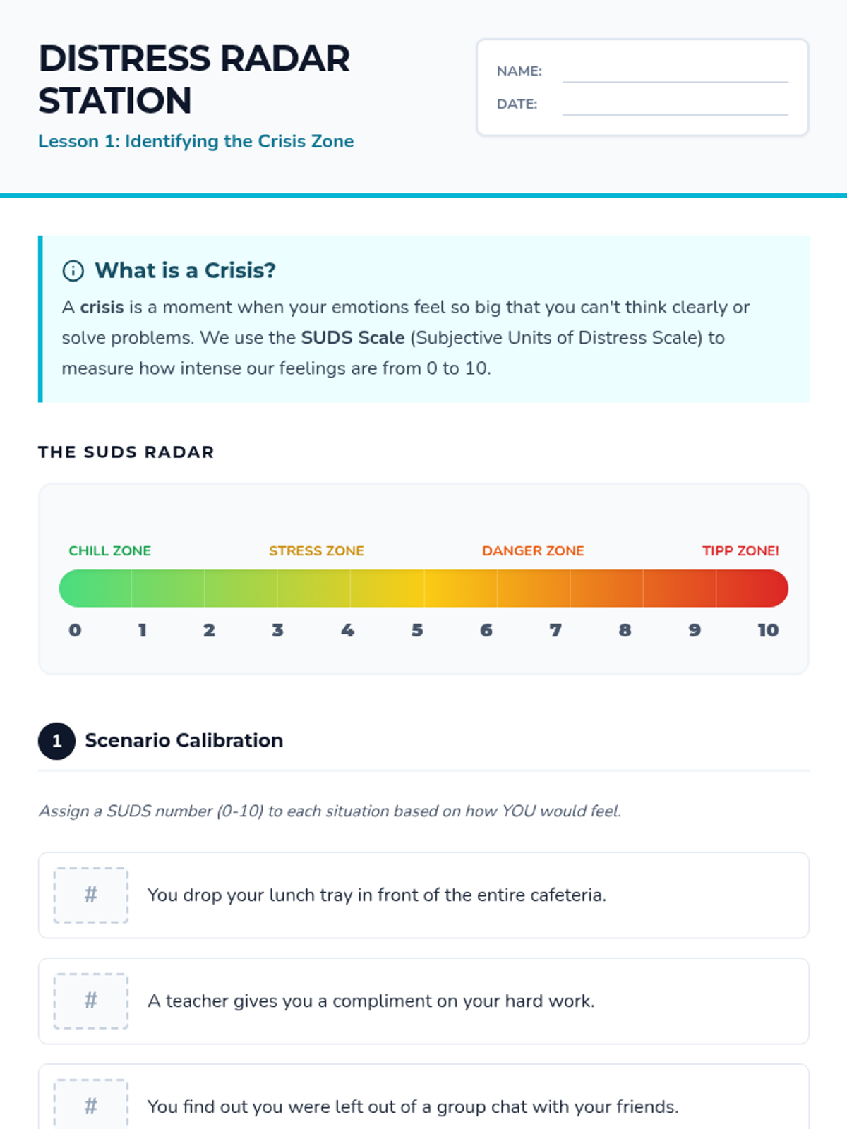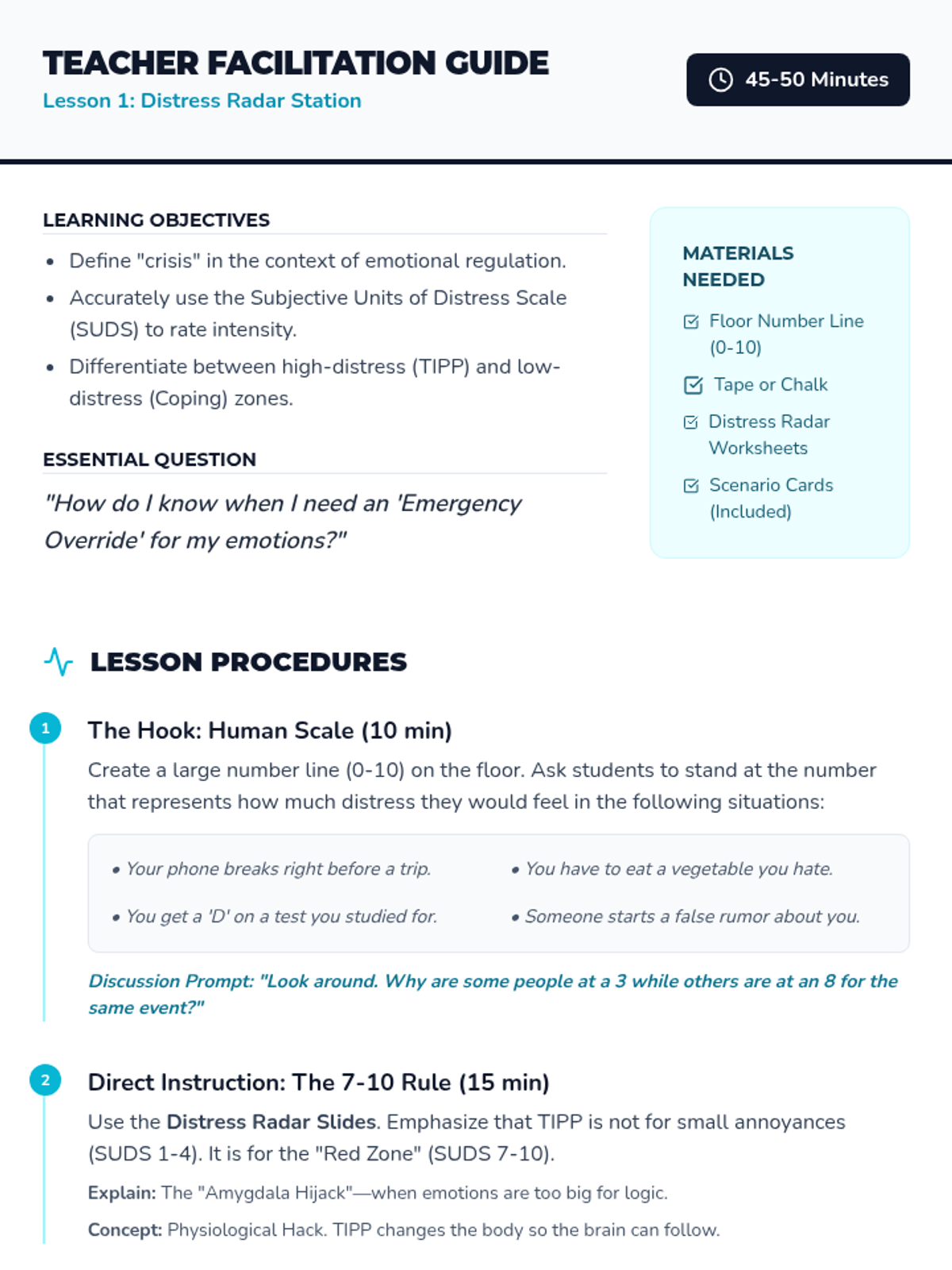 A comprehensive 5th-grade unit introducing the TIPP protocol for crisis survival. Students learn to distinguish between general stress and emotional crises, building a practical toolkit of physiological regulation strategies including temperature change, intense exercise, paced breathing, and paired muscle relaxation.