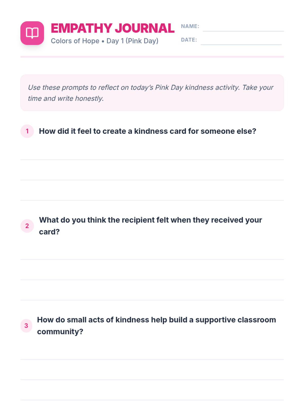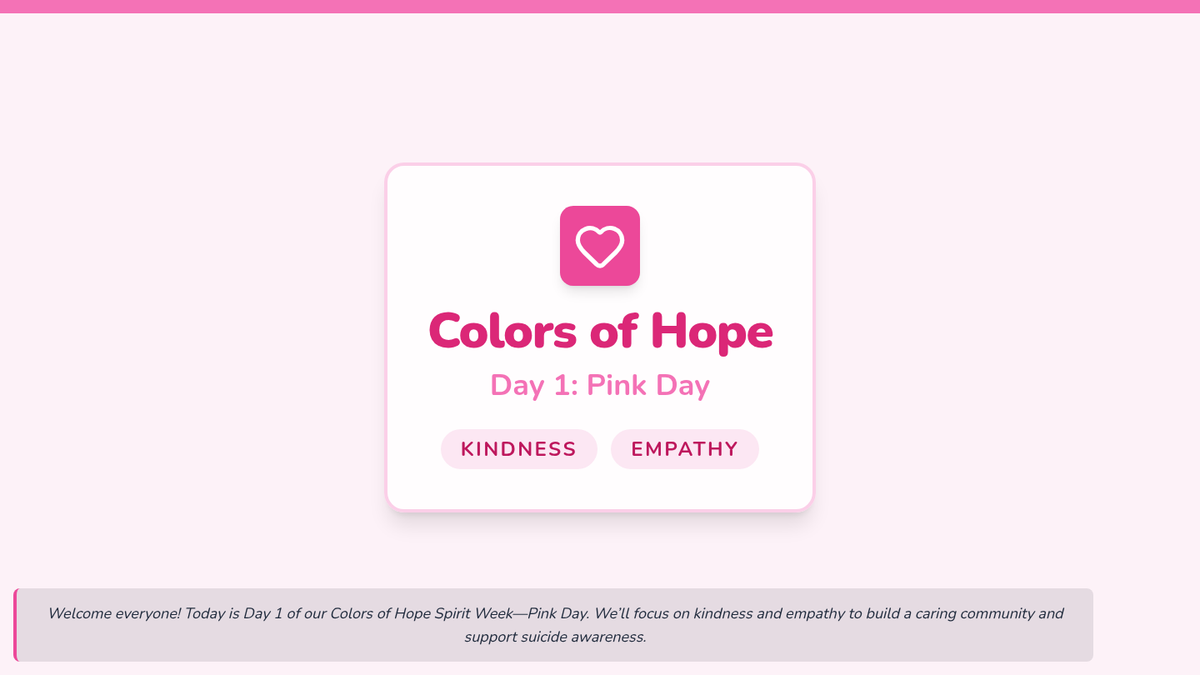 A five-day Spirit Week program for 6th graders designed to foster suicide awareness and prevention through daily themes of kindness, self-expression, coping, connection, and hope.