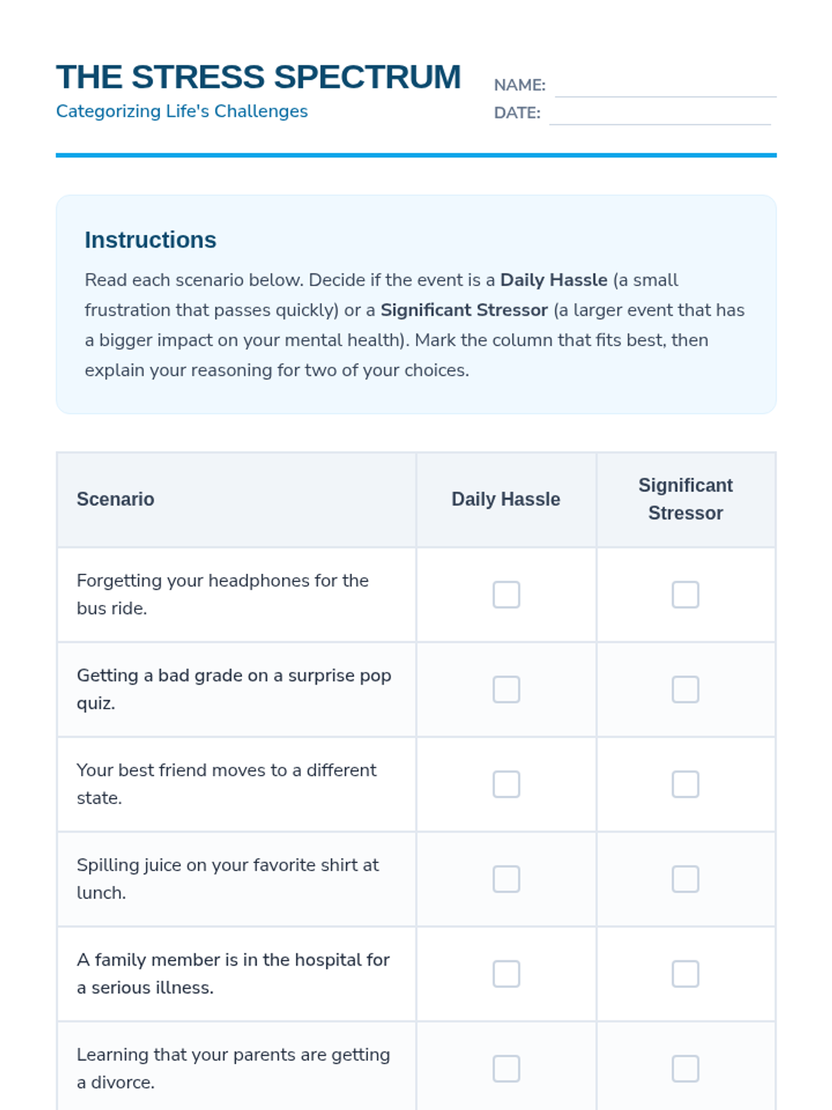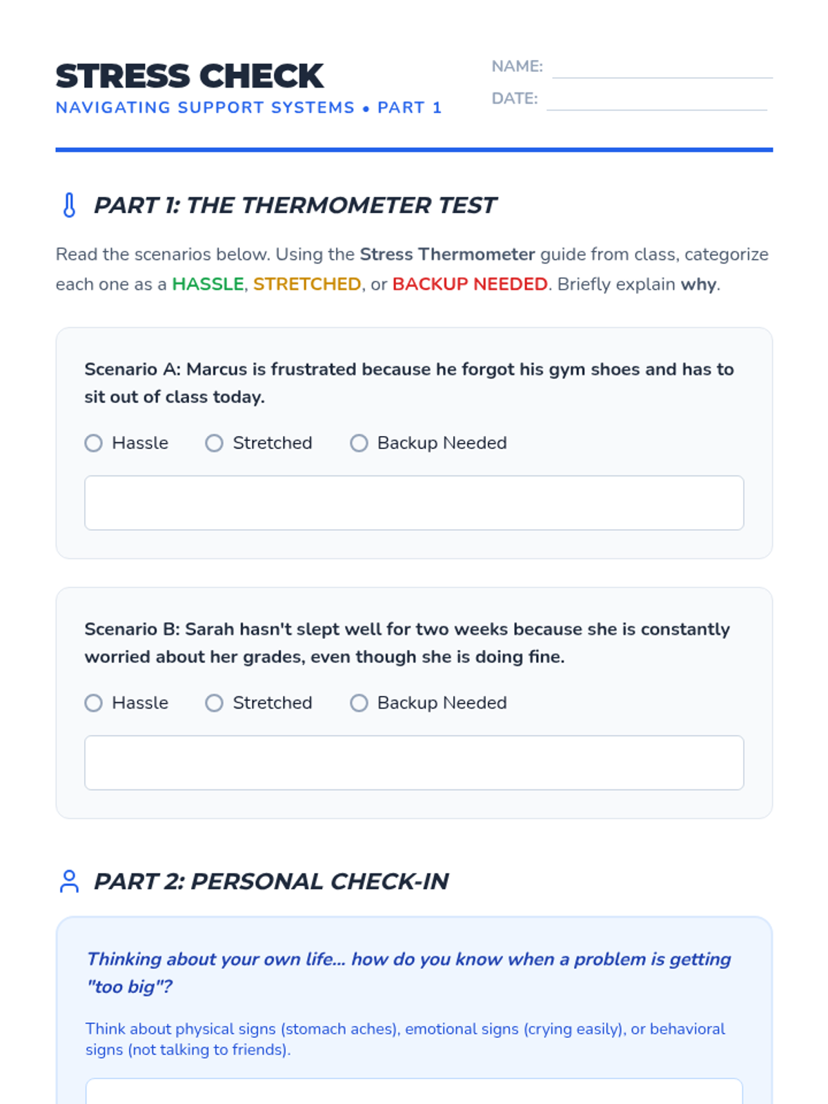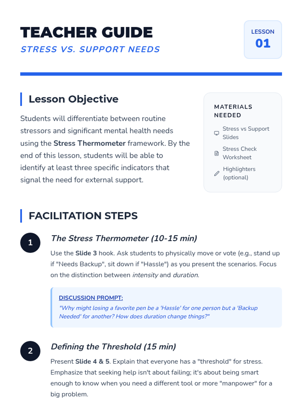 This unit empowers sixth-grade students to navigate the complexities of seeking help for mental health. Students learn to distinguish between daily stress and significant needs, map their support networks, identify barriers to help-seeking, and practice the specific communication skills required to disclose feelings to trusted adults.