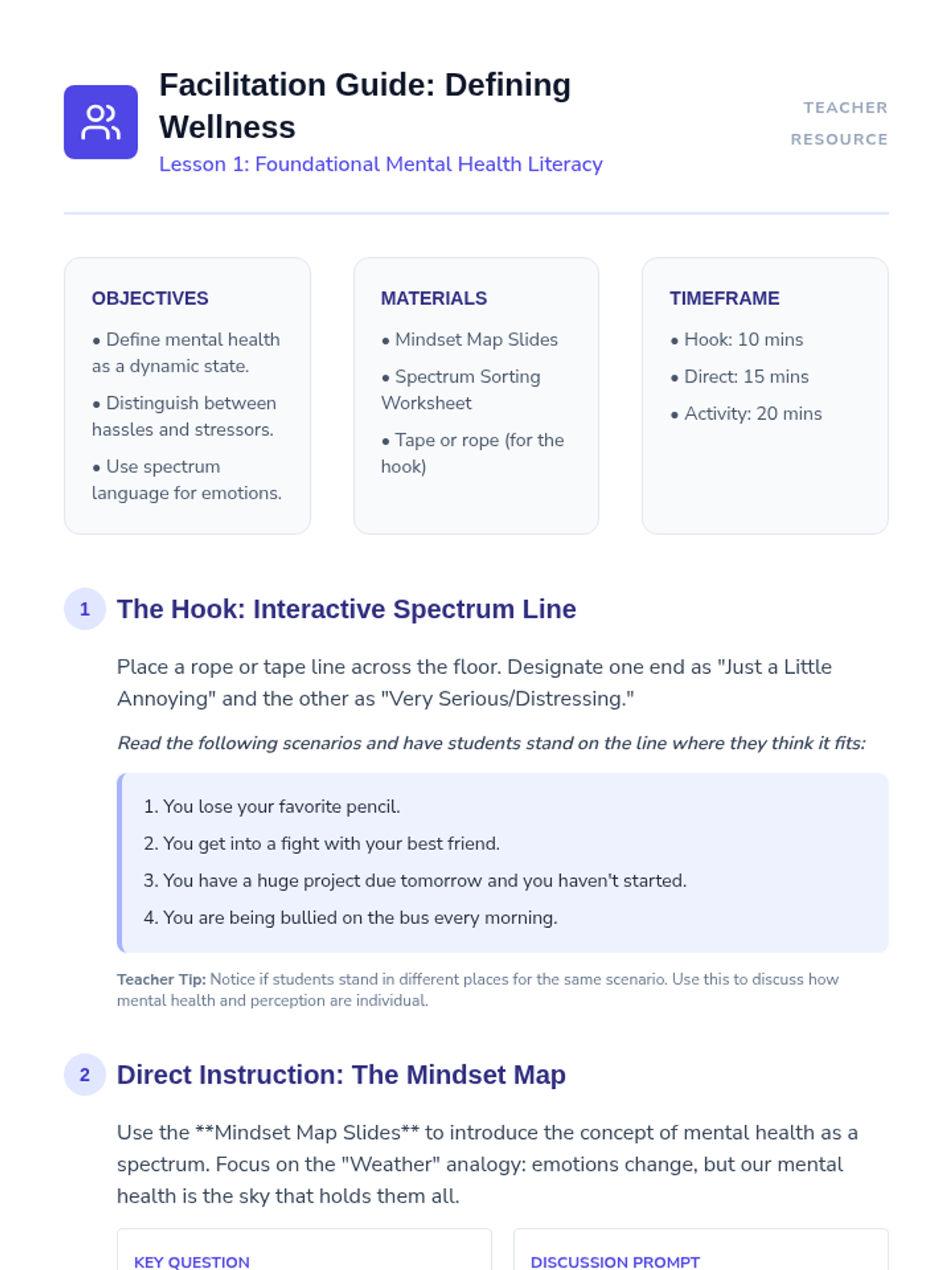 A multi-lesson unit designed to build mental health literacy, identify internal system alerts (Anxiety, Depression, Anger), and develop a sustainable toolkit of coping strategies. Students explore the 'Wellness Spectrum', 'Neuroplasticity', and the deceptive nature of 'System Bypasses' like substances.