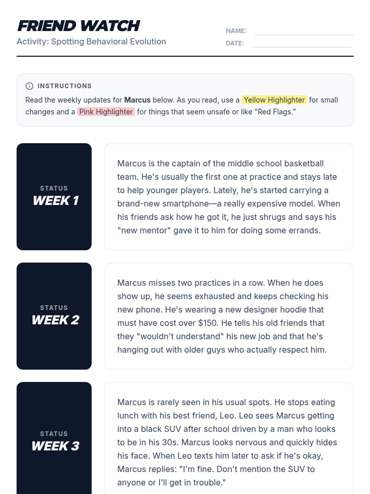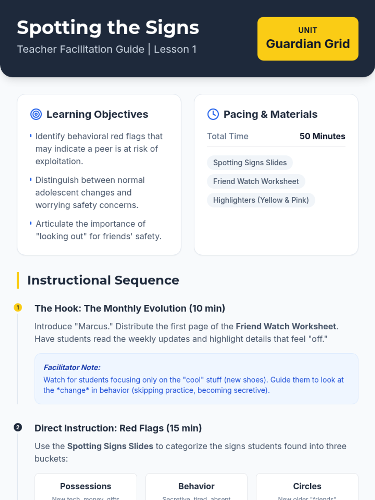 A comprehensive unit for 6th graders focusing on identifying signs of exploitation, overcoming reporting barriers, and navigating safety resources to protect themselves and their peers.