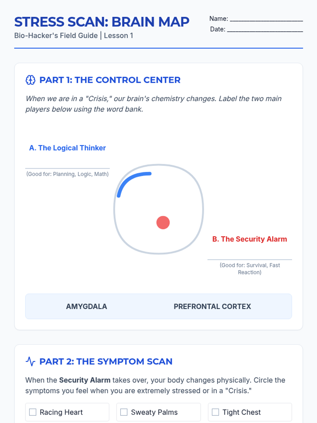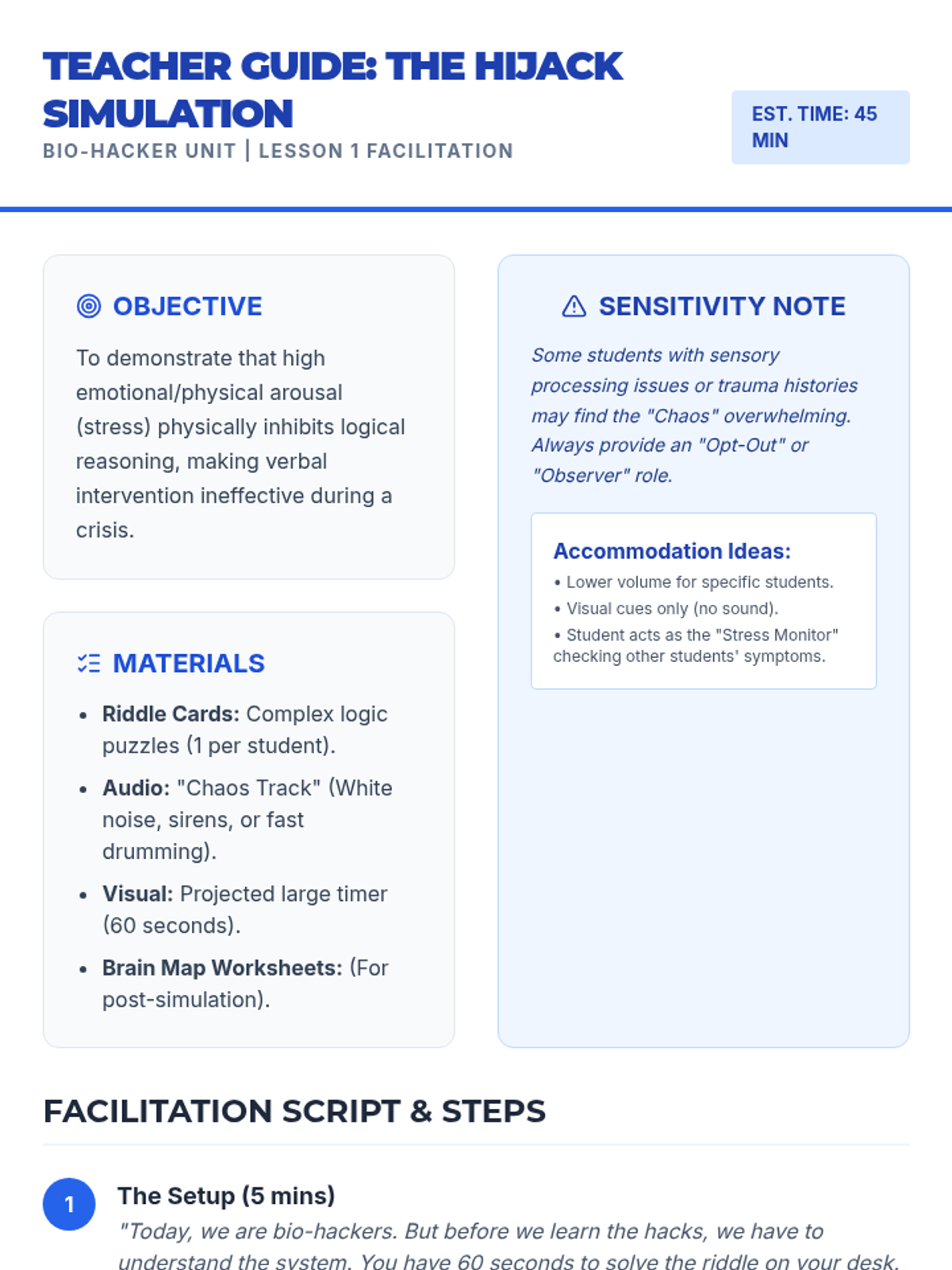 This inquiry-based sequence explores the biological 'why' behind TIPP skills, reframing them as 'bio-hacks' for the nervous system. Students investigate the autonomic nervous system, the Mammalian Dive Reflex, and the chemistry of stress to understand how physical interventions can regulate emotional states.