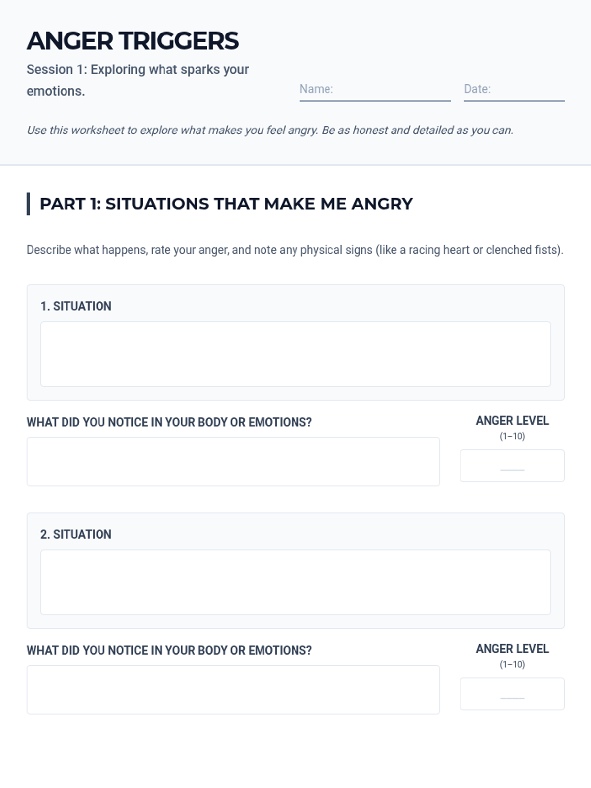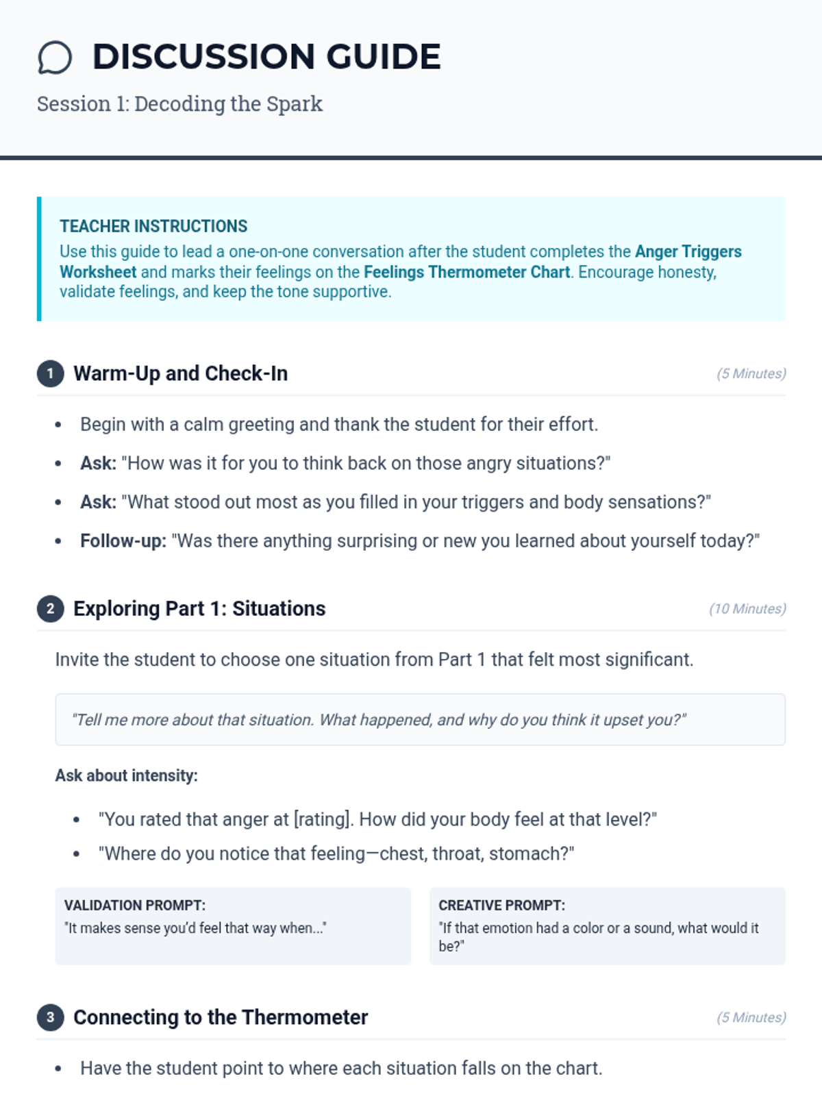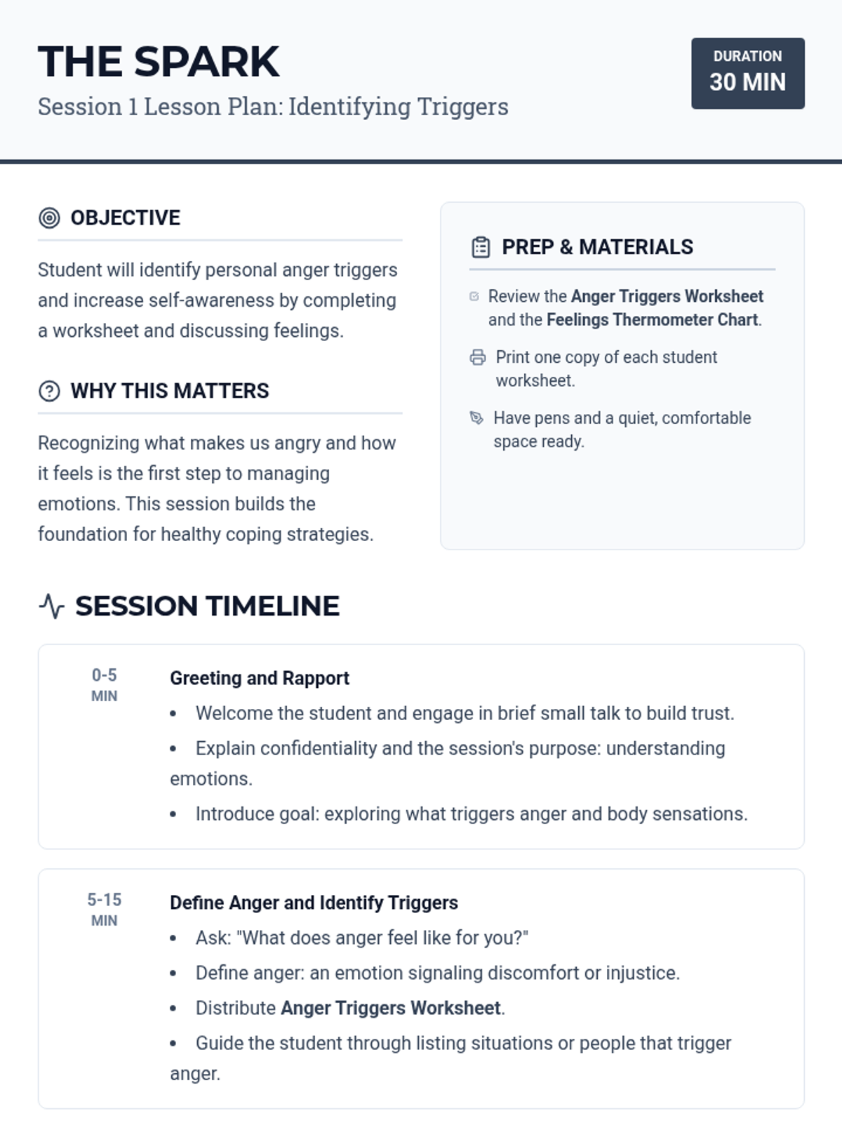 A structured six-session individual counseling curriculum for middle schoolers to manage anger. Through identifying triggers, physical calming techniques, cognitive reframing, and assertive communication, students build a personalized toolkit for emotional regulation.