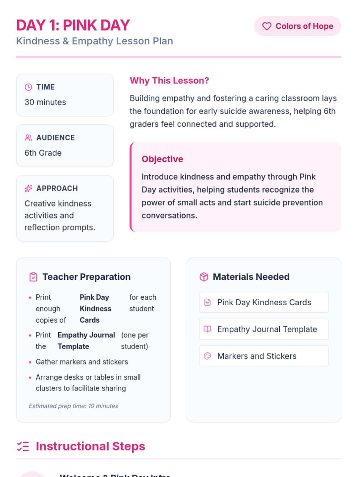 A 5-day spirit week program for 6th graders focused on building empathy, resilience, and connection to support suicide awareness and prevention. Each day uses a specific color theme to explore topics like kindness, self-affirmation, coping skills, peer support, and future hope.
