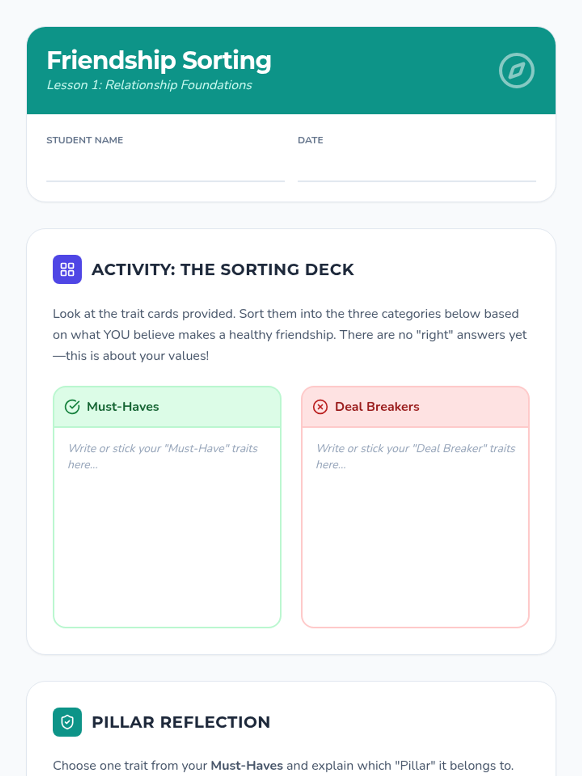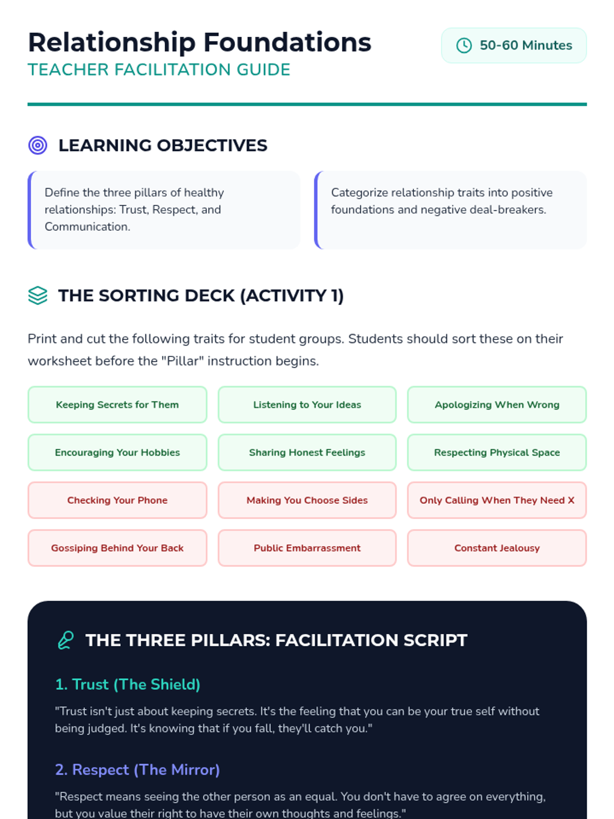 A comprehensive 5-lesson sequence for 6th graders exploring the dynamics of healthy vs. unhealthy relationships, conflict resolution strategies, and support systems. Students learn to identify red flags, use 'I-statements', and build personal resource maps.