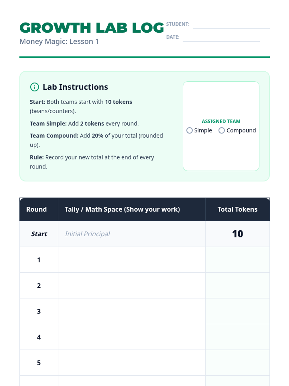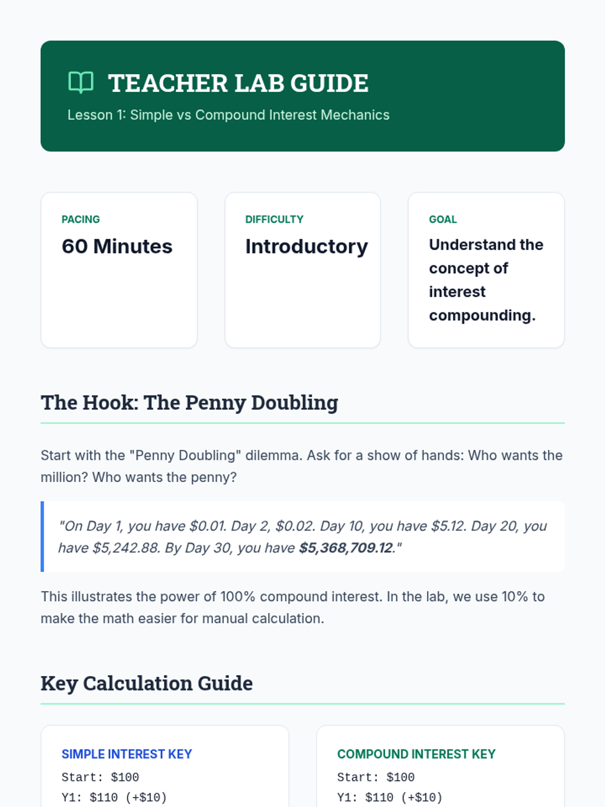 This 5-lesson sequence demystifies compound interest for 6th graders, moving from manual calculations to future wealth projections using the Rule of 72 and the Time Value of Money.
