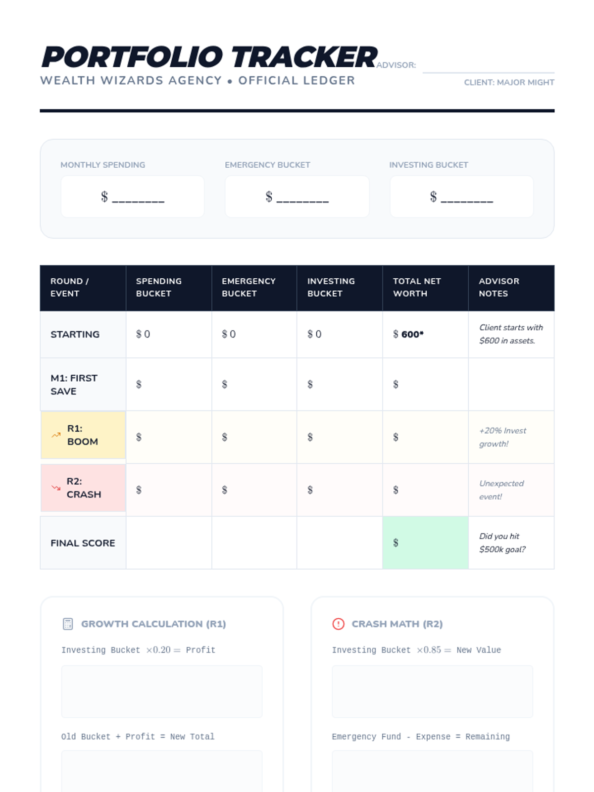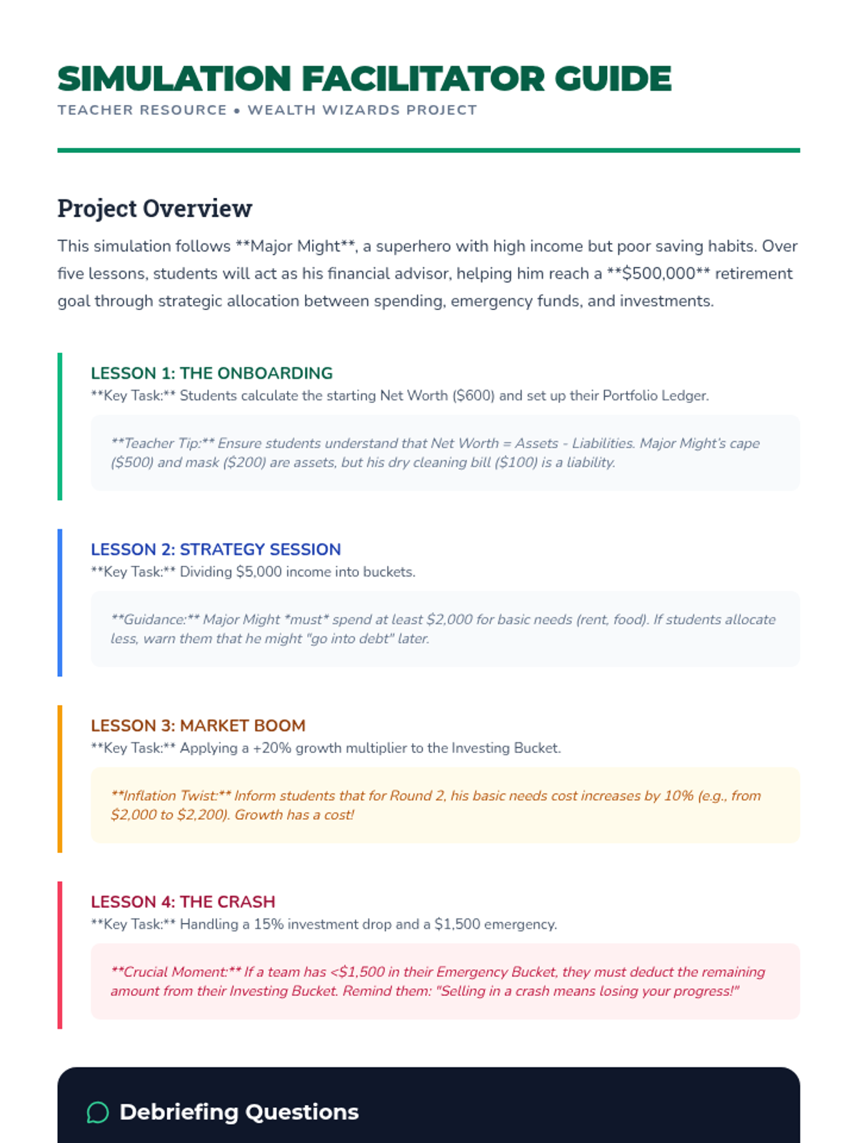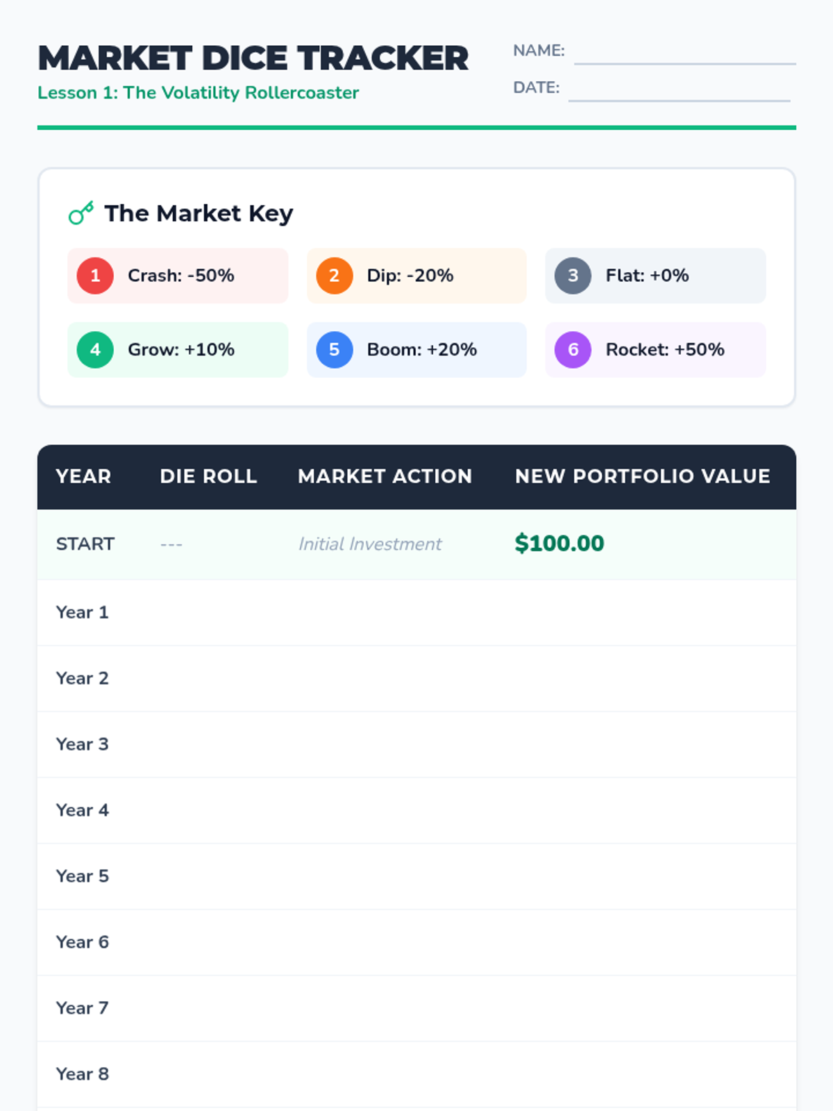 A game-based unit for 6th graders exploring asset allocation and diversification. Students simulate market volatility and learn strategic ways to protect investments through balanced portfolios.