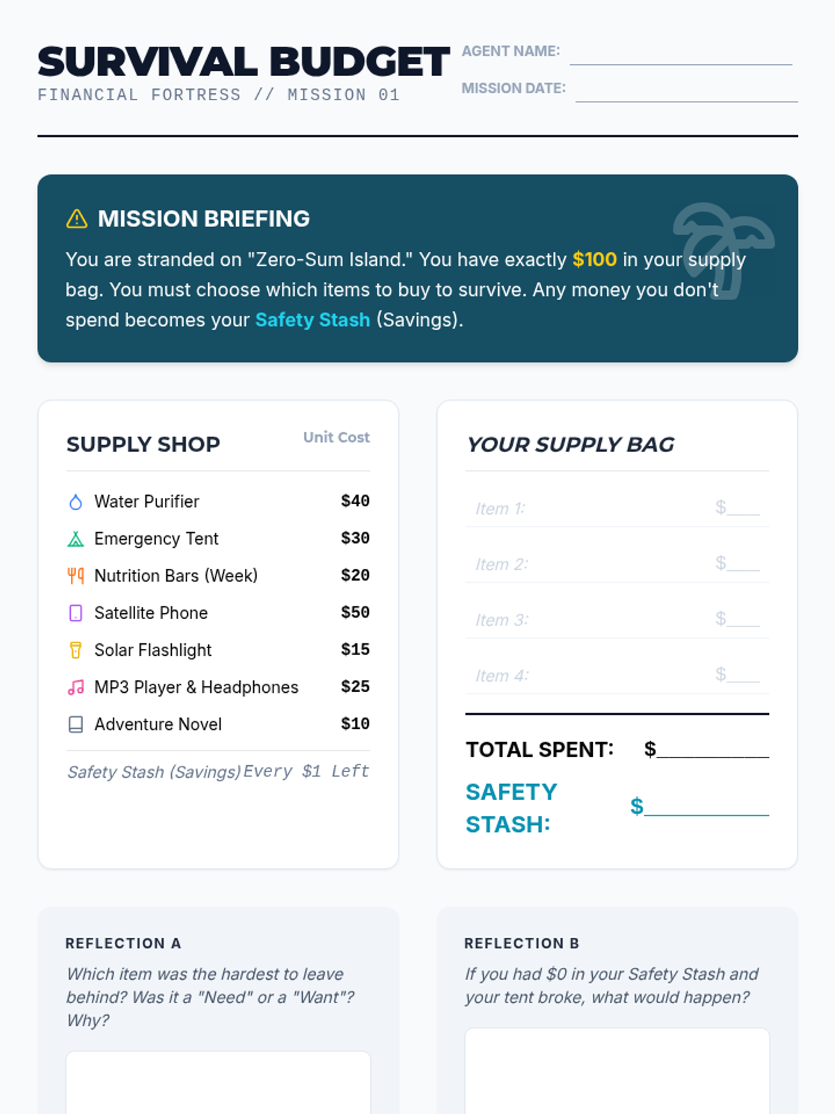 This sequence explores the psychology behind spending, focusing on impulse control, emotional triggers, and the economic concept of opportunity cost. Students move from basic needs/wants categorization to developing a personalized mindful spending plan.