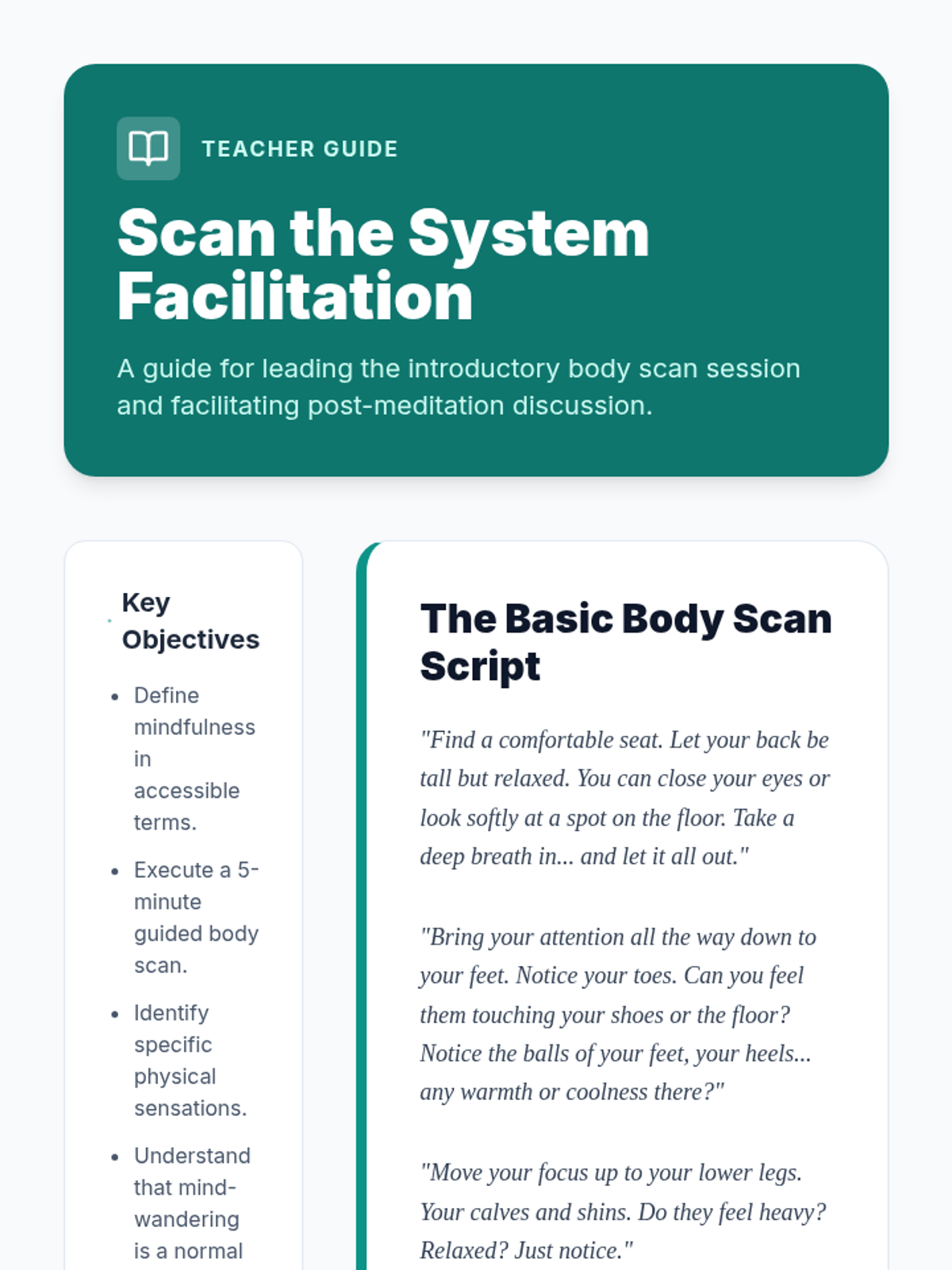 This sequence guides students through somatic awareness and Progressive Muscle Relaxation (PMR). Students learn to map emotions in their bodies, observe sensations without judgment, and use active relaxation techniques to manage stress and improve sleep.