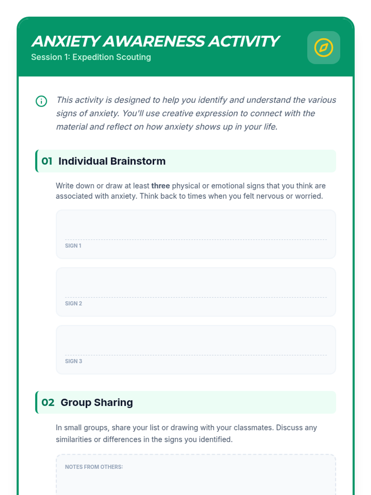 A 6-session counseling group designed to help students identify triggers, understand physical symptoms of anxiety, and build a personalized toolkit of coping strategies through a 'Calm Explorer' theme.