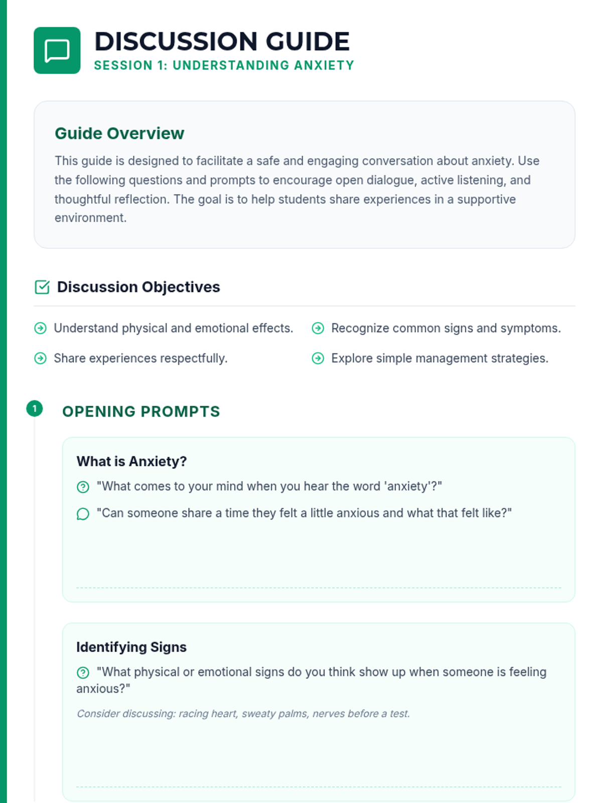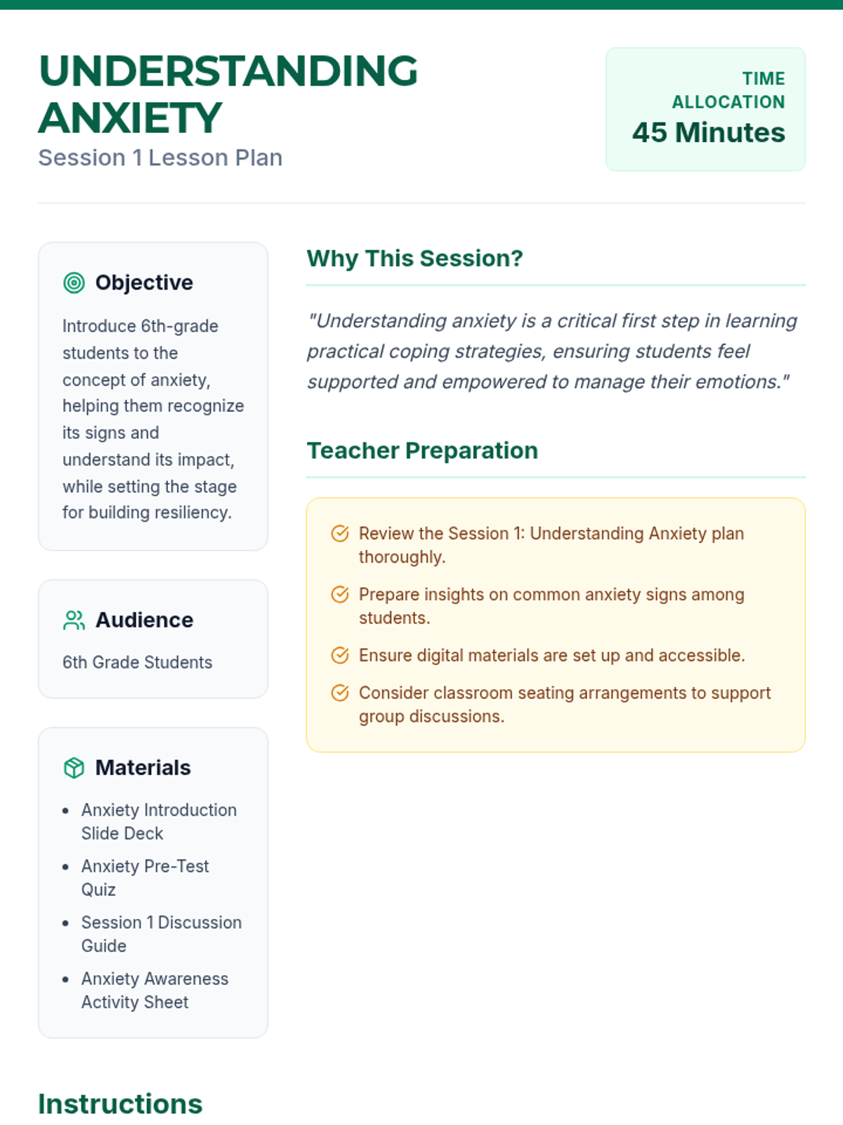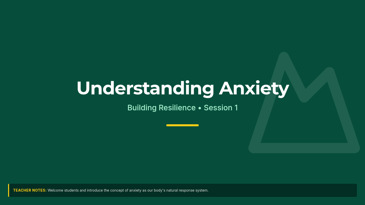 This 6-session series (4 sessions detailed here) is designed for 6th-grade students to develop anxiety management and resiliency skills. Students will learn to recognize signs of anxiety, practice coping strategies, build resilience through challenges, and increase emotional awareness.
