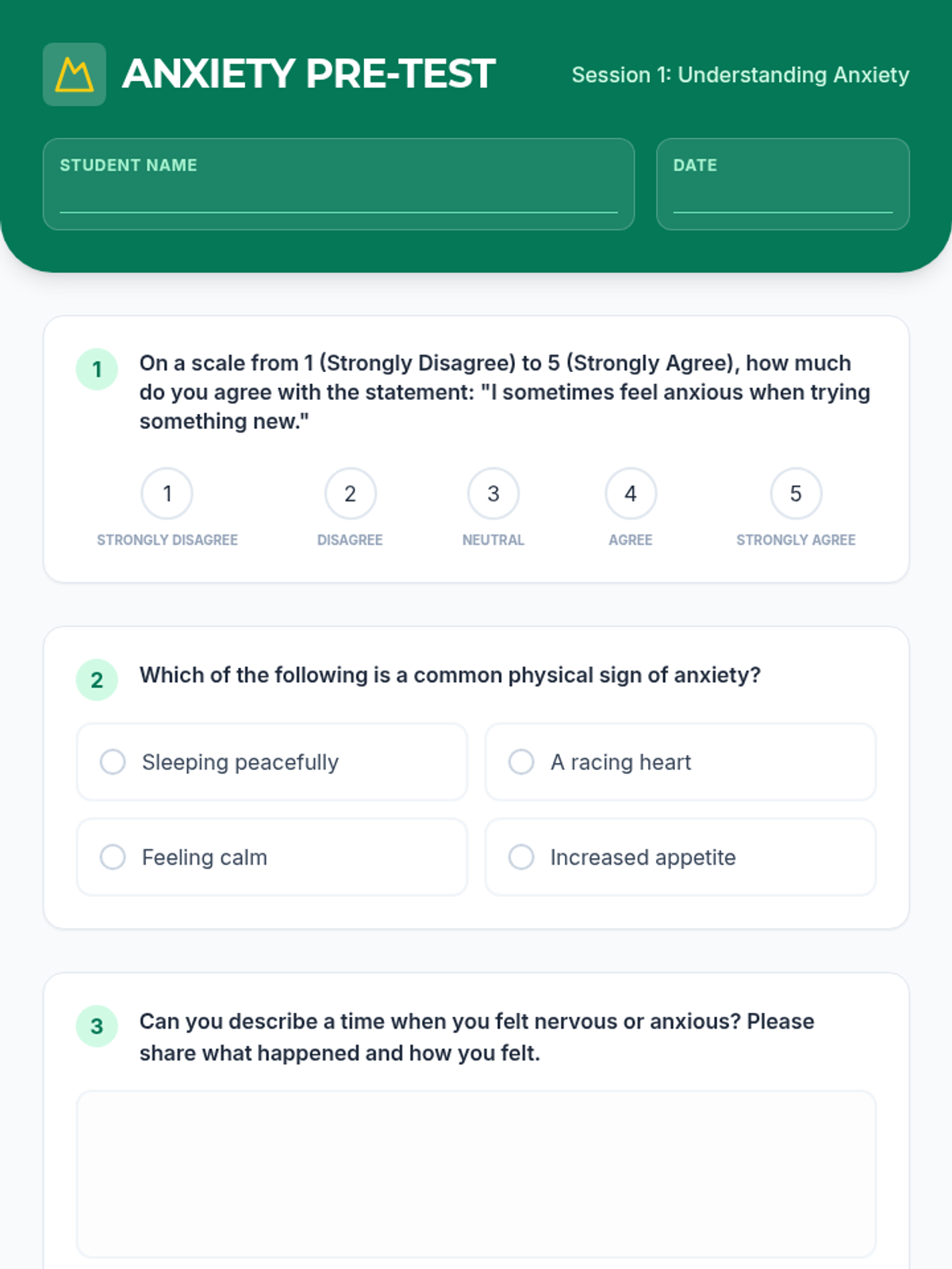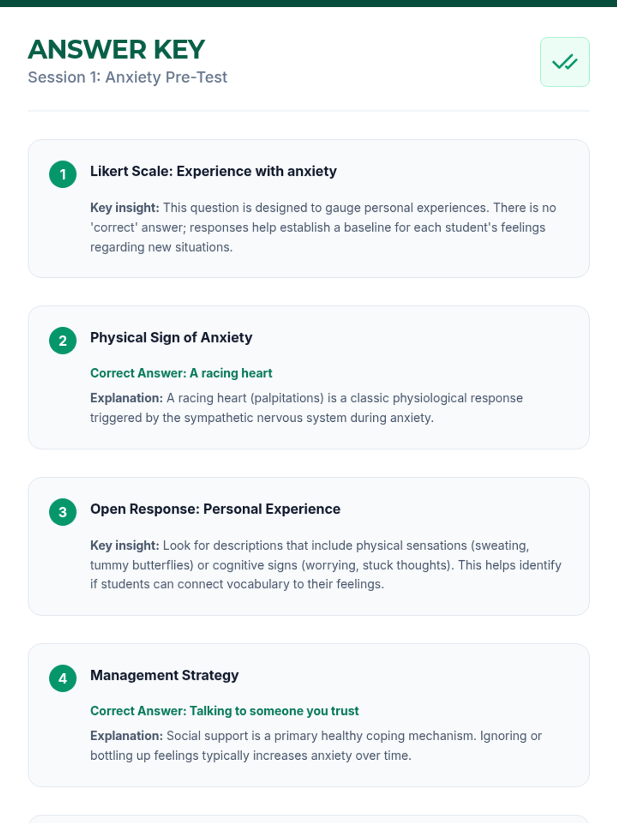 A 3-session emotional intelligence program for middle schoolers to identify, understand, and manage their emotions using the Zones of Regulation framework. Students move from basic identification to personalized self-regulation planning.