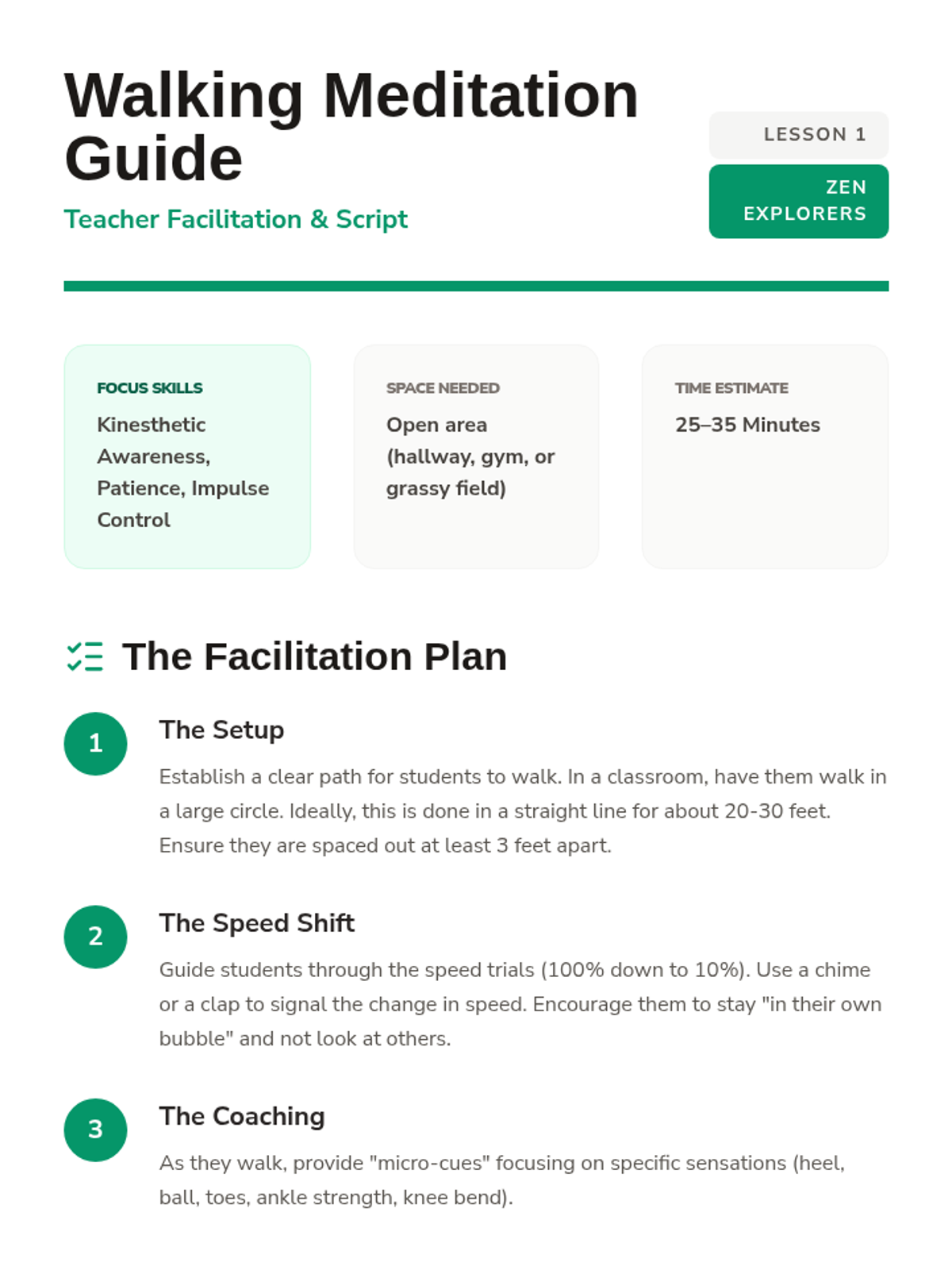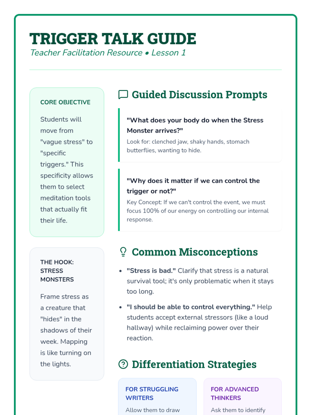 This middle school sequence reframes meditation as a 'performance tool' for academic and social success. Students explore case studies of peak performers, learn the STOP technique for impulse control, develop grounding strategies for test anxiety, and practice empathy through Loving-Kindness meditation, culminating in a real-world scenario challenge.