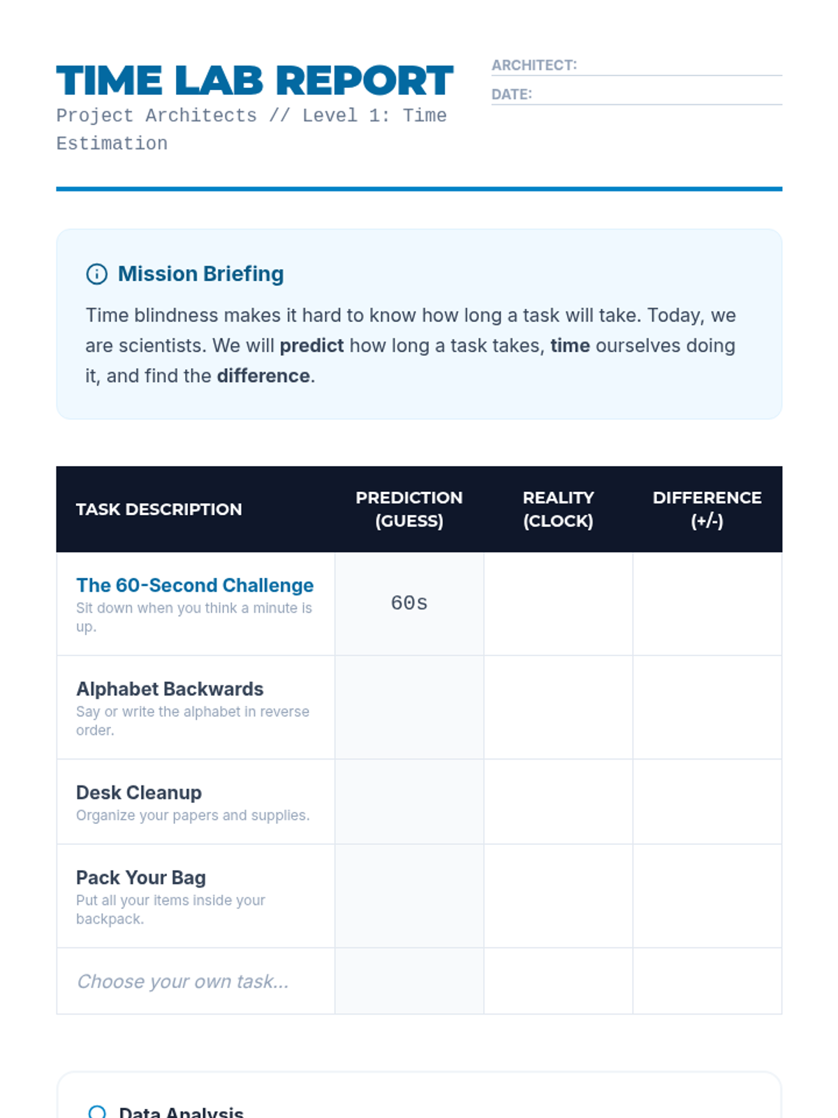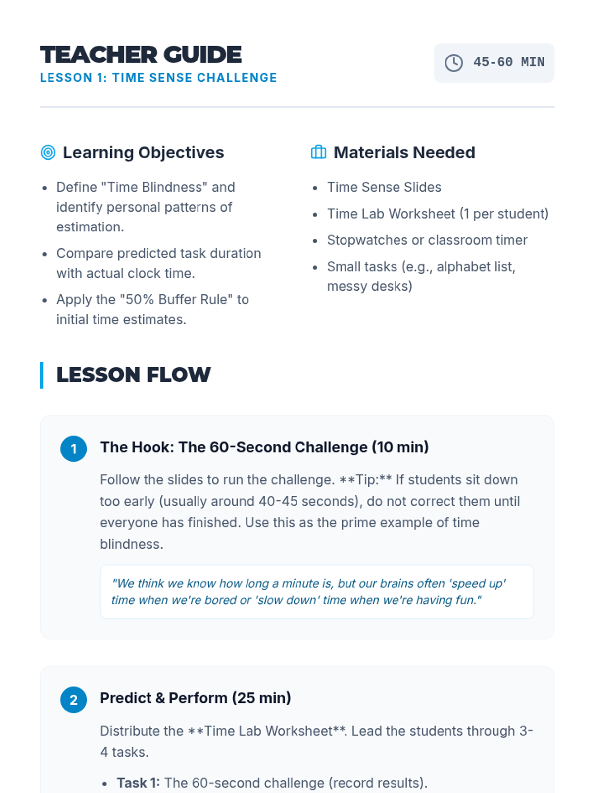 This sequence helps students overcome task initiation hurdles by combining visualization and verbal self-talk. Students learn to 'see' the finished product, reverse engineer the steps, estimate time accurately, and use micro-goals to take the first step.