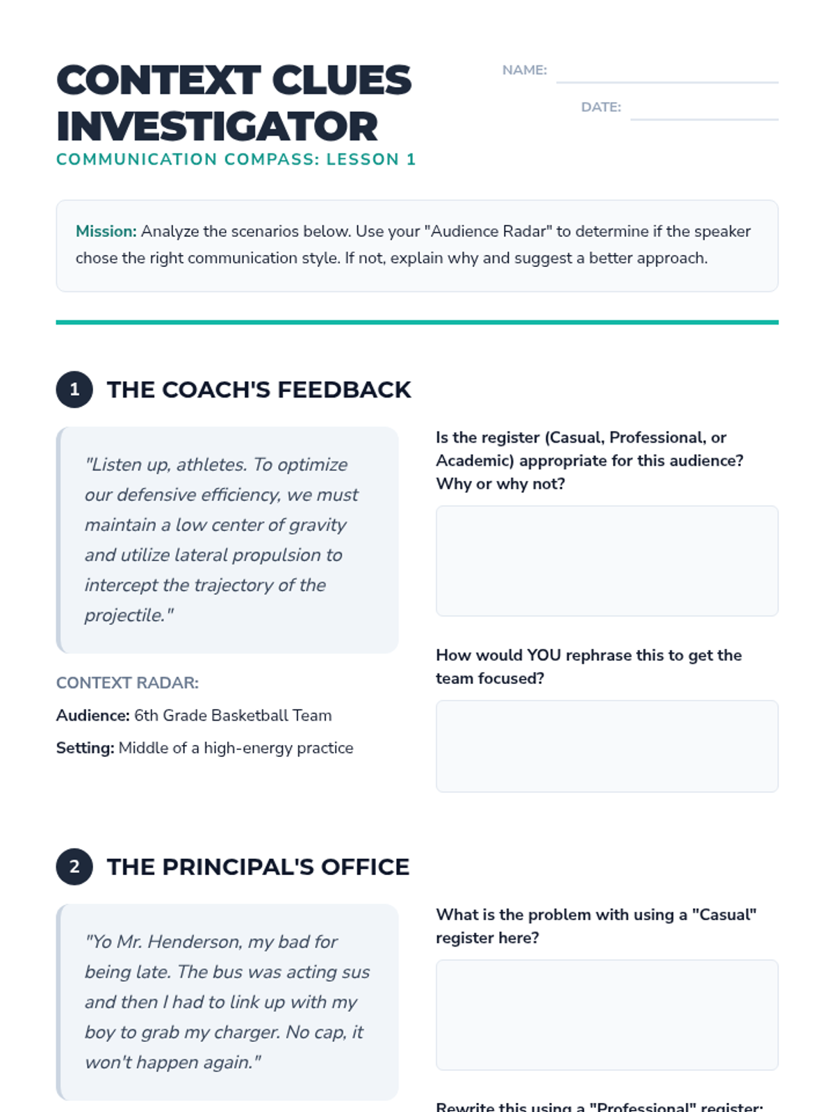 This 5-lesson sequence for 6th-grade Social Communication students focuses on distinguishing between formal and informal verbal registers. Students progress from defining social registers to mapping relationships and practicing context-specific greetings, culminating in a rapid-fire code-switching game.