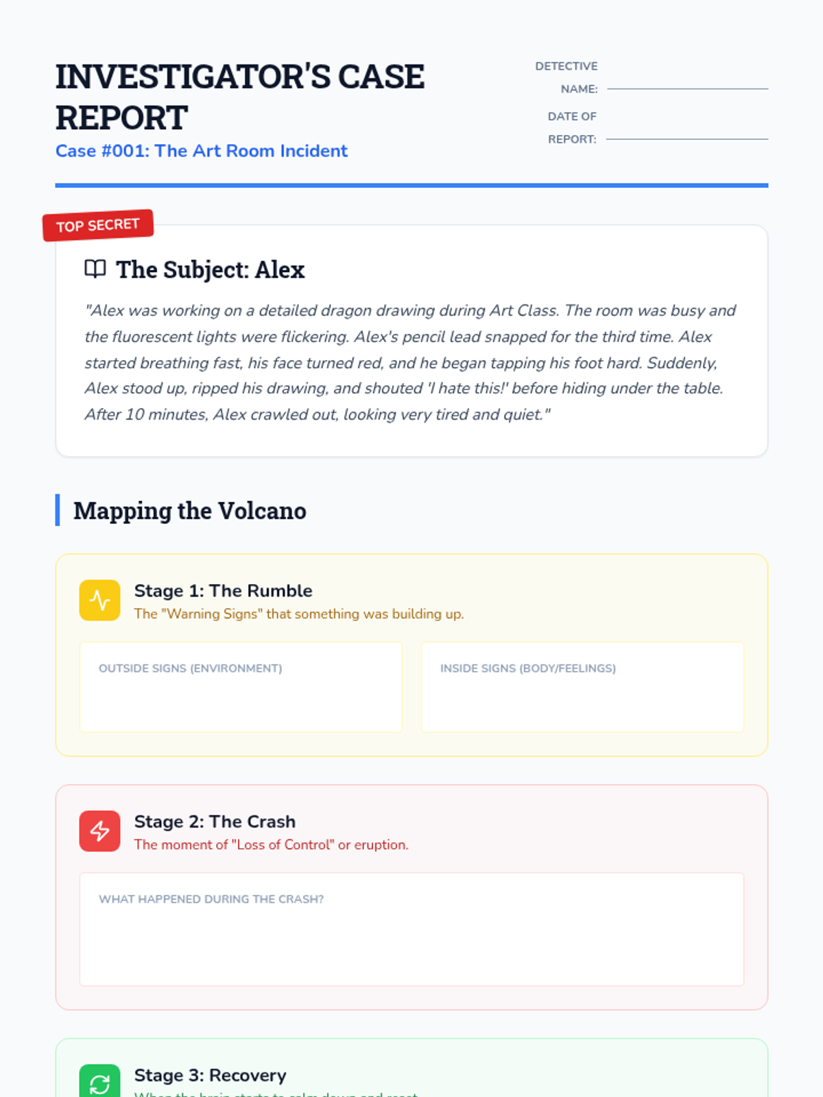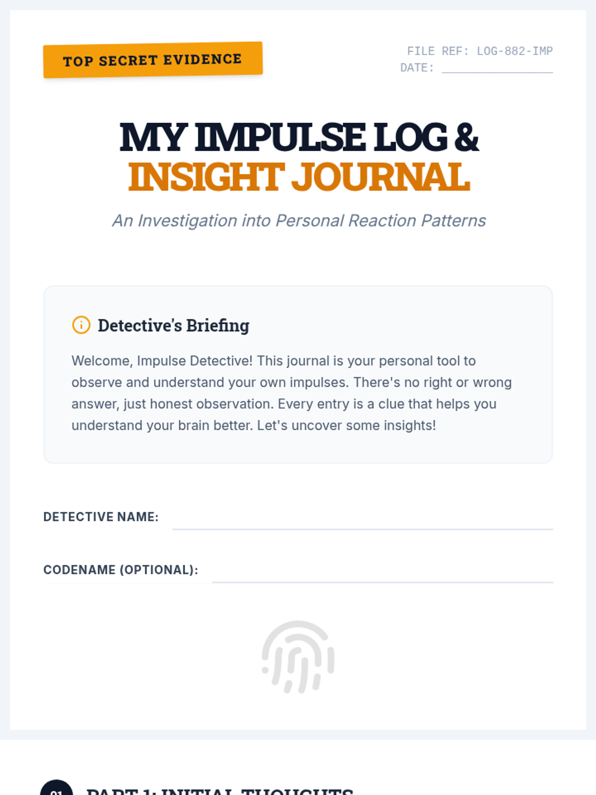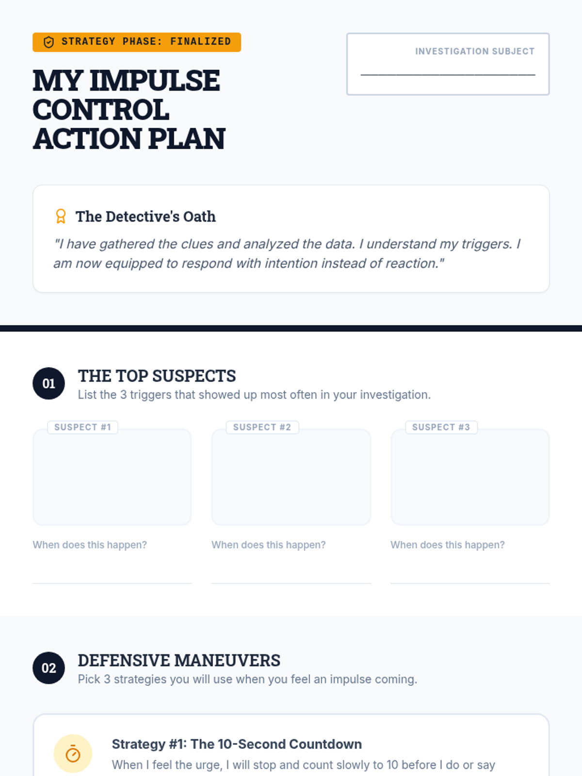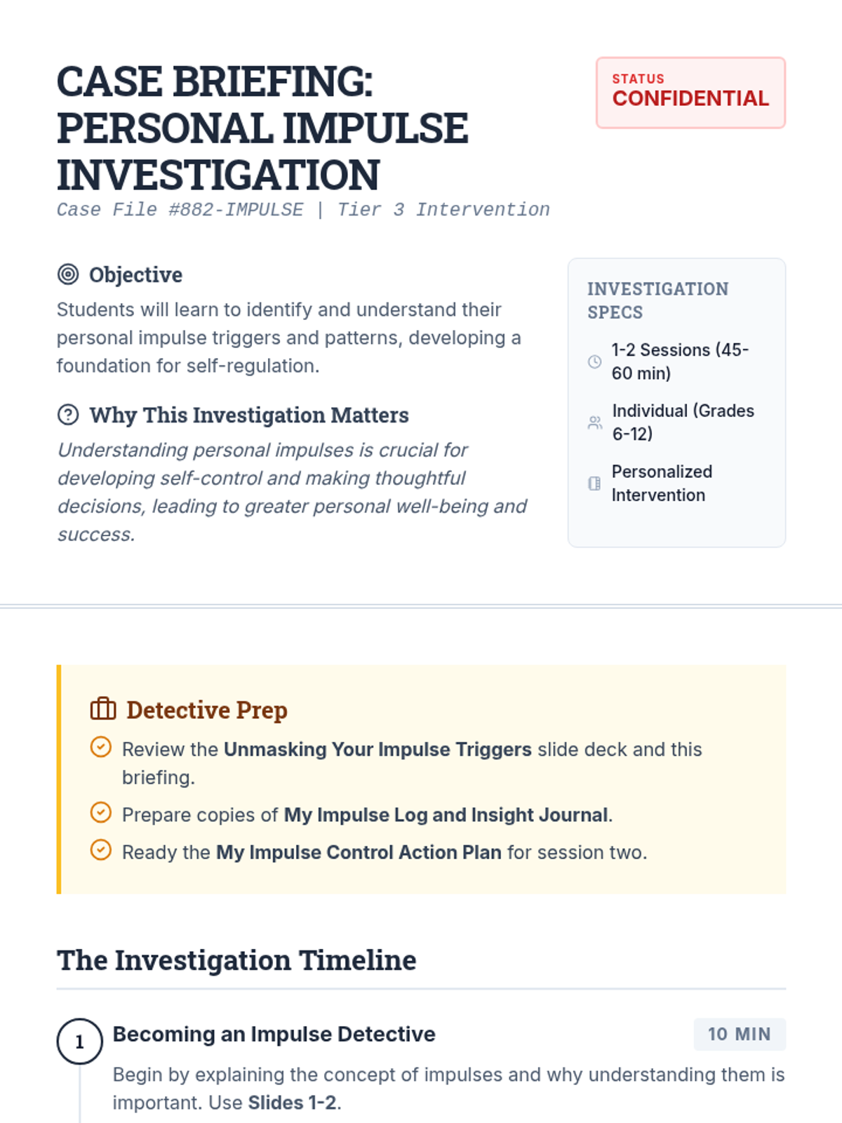 A Tier 3 intervention kit for individual students to investigate their impulses, identify triggers, and develop personalized self-regulation strategies through a detective-themed investigation.