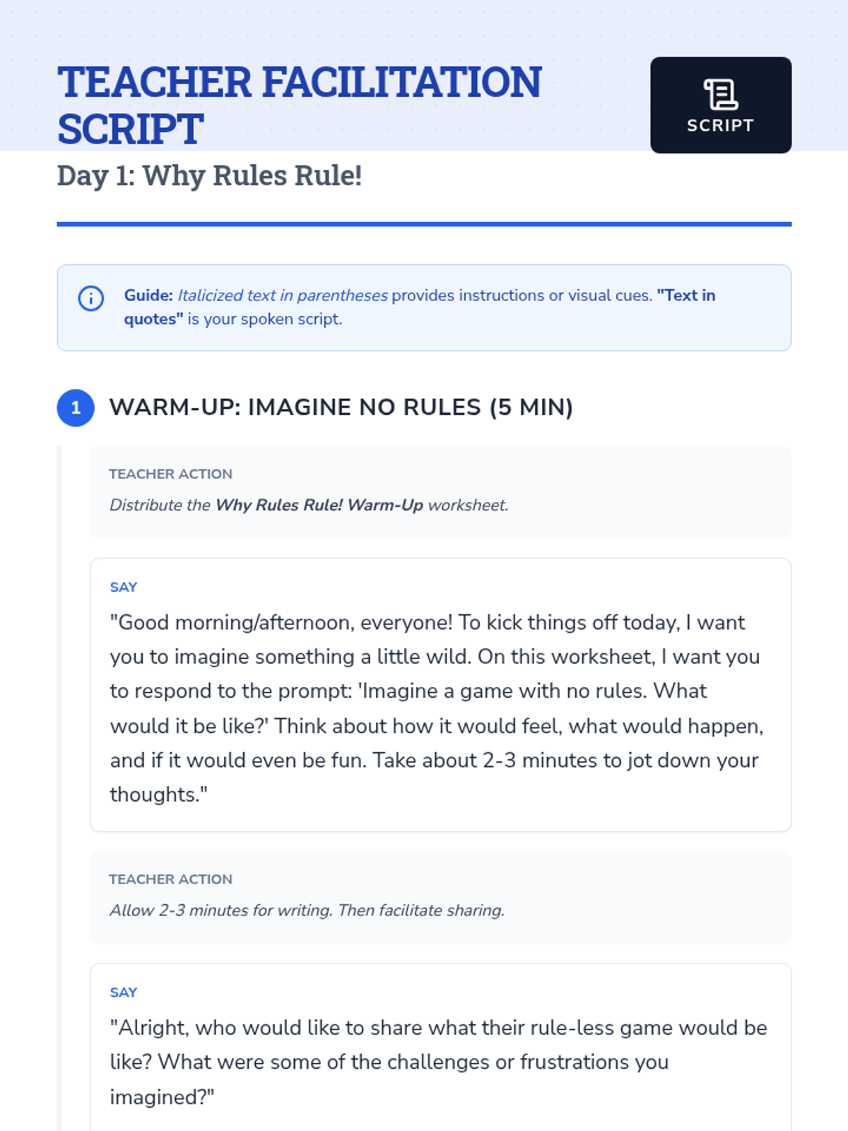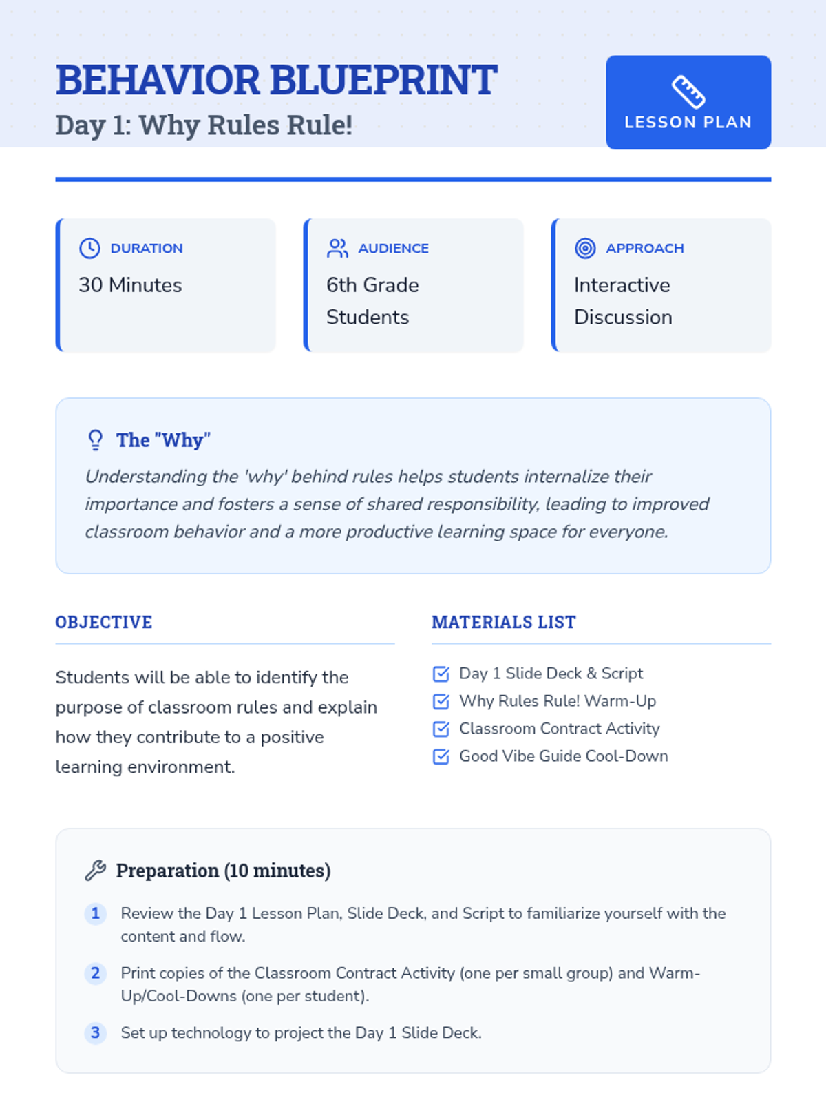 A 3-day guidance sequence for 6th-grade students to understand the purpose of rules, practice positive behaviors through scenarios, and build a cohesive classroom community.
