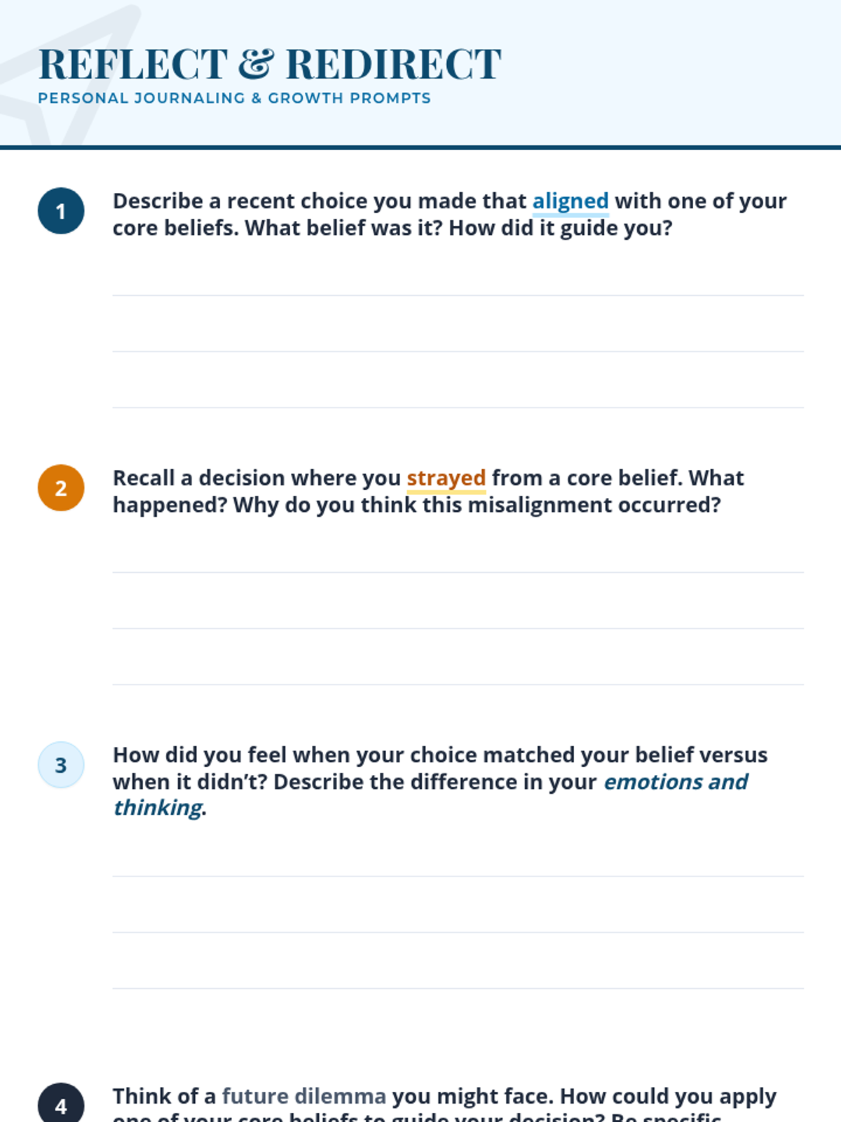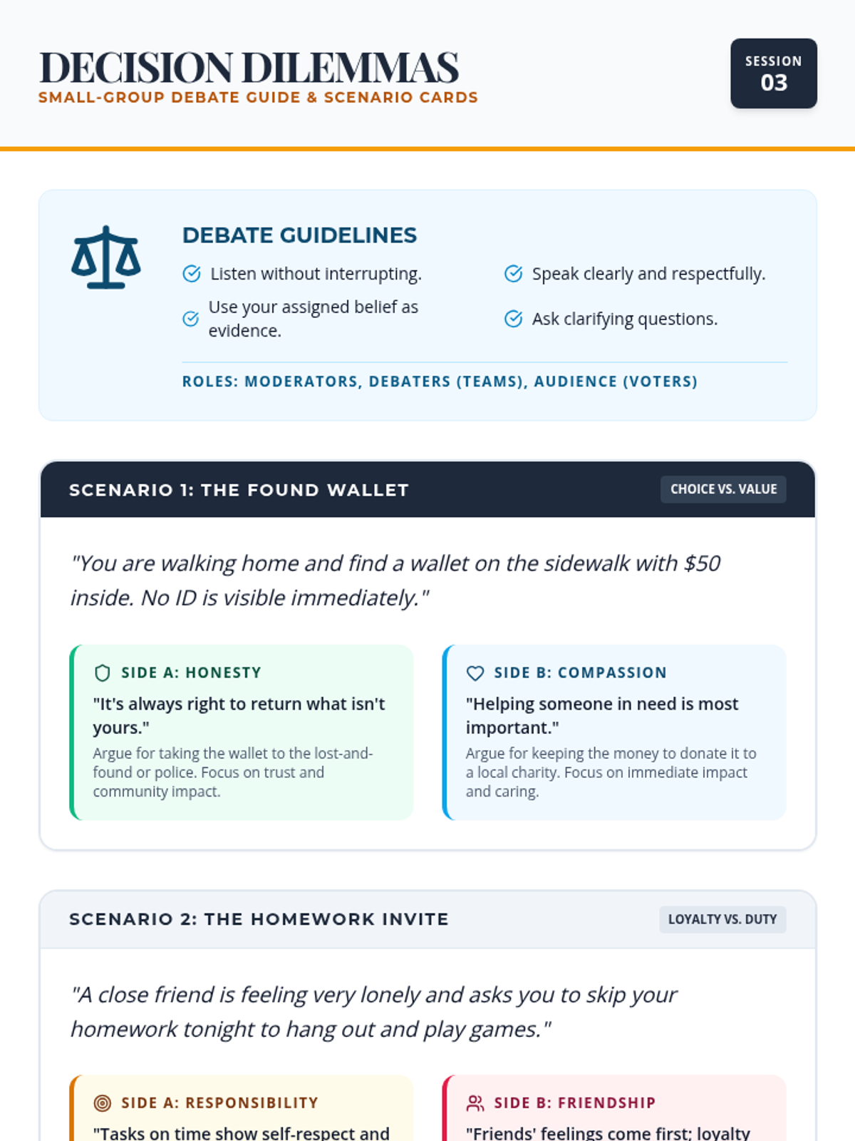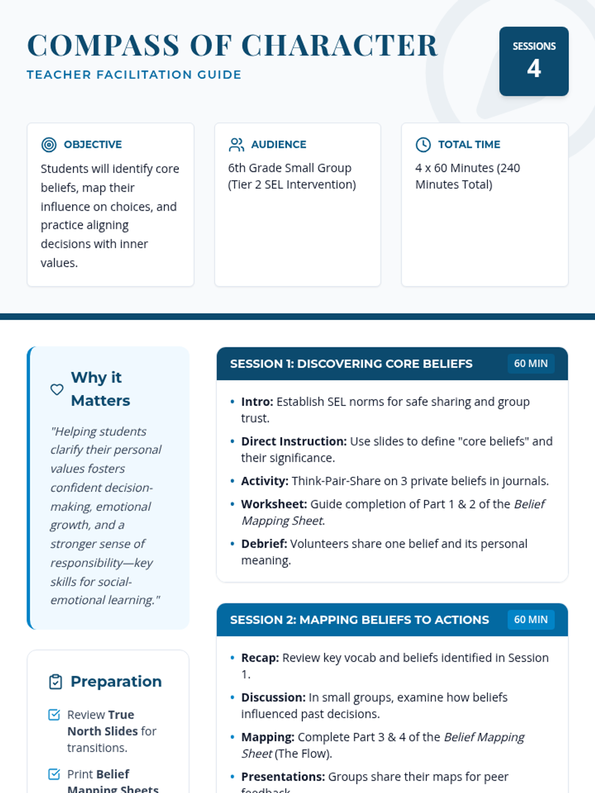 A 4-session small-group unit for 6th graders to explore core beliefs, map their influence on choices, and practice aligning decisions with personal values to foster confidence and responsibility.