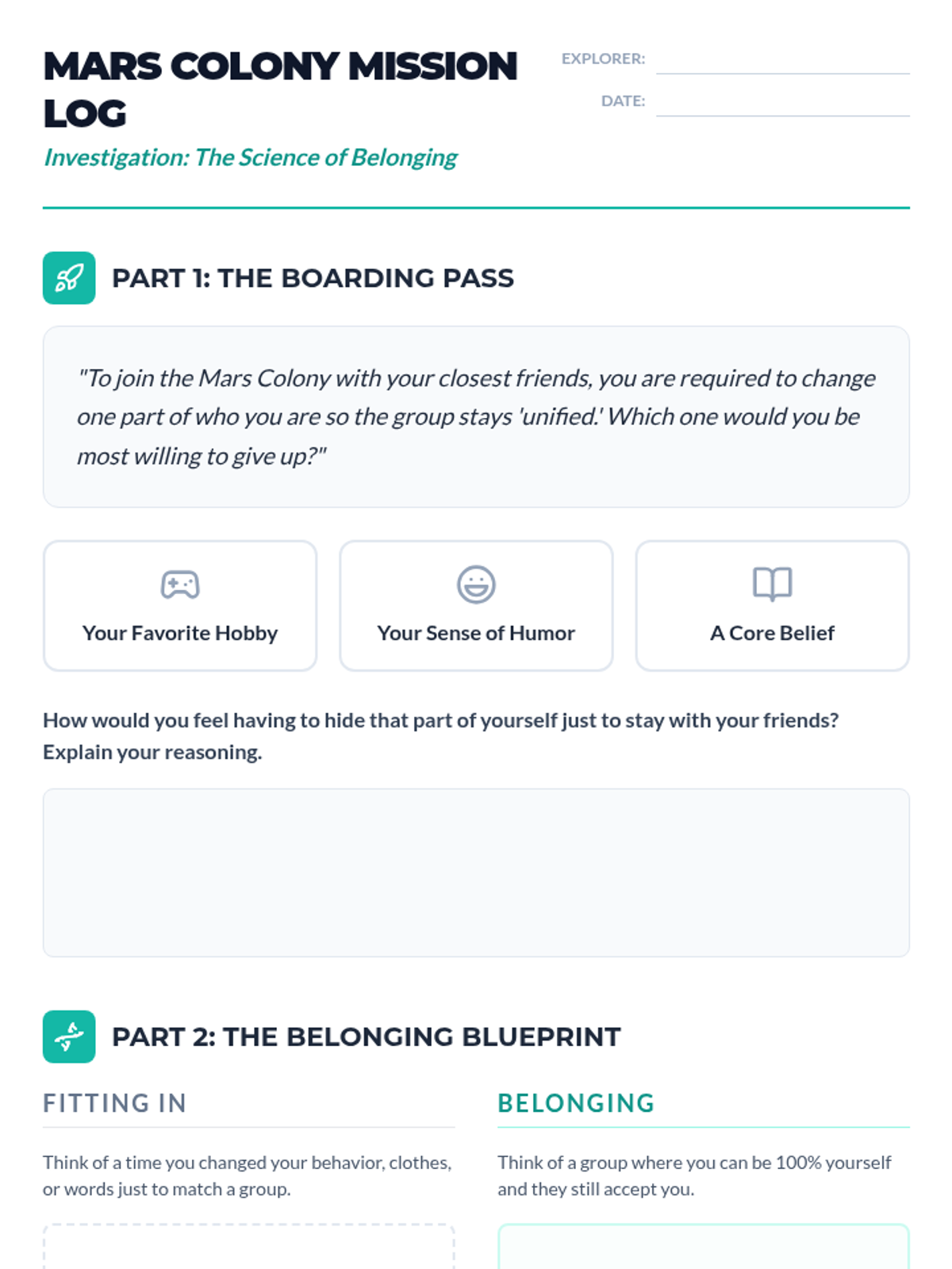 This project-based sequence explores emotional safety and decision-making in relationships. Students learn to balance friendships with romantic interests, trust their intuition, build resilience through rejection, and advocate for equality in their connections, culminating in a personal 'Relationship Rights' zine.