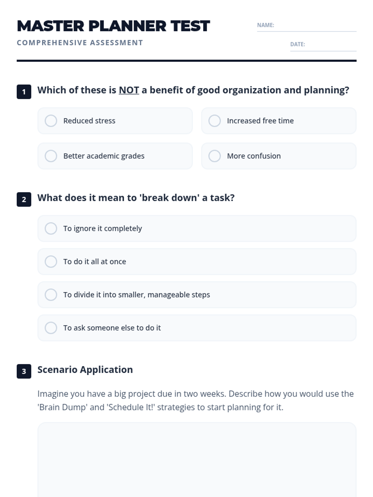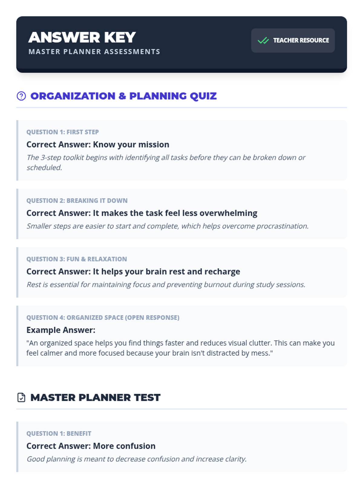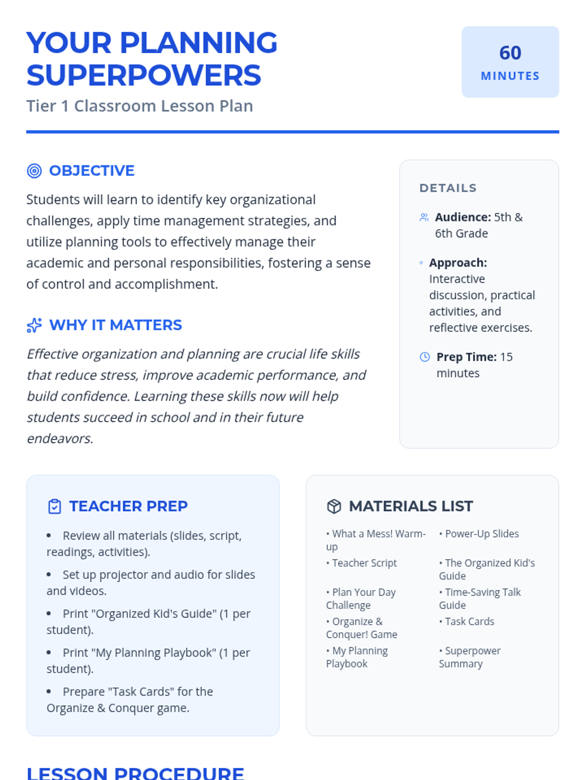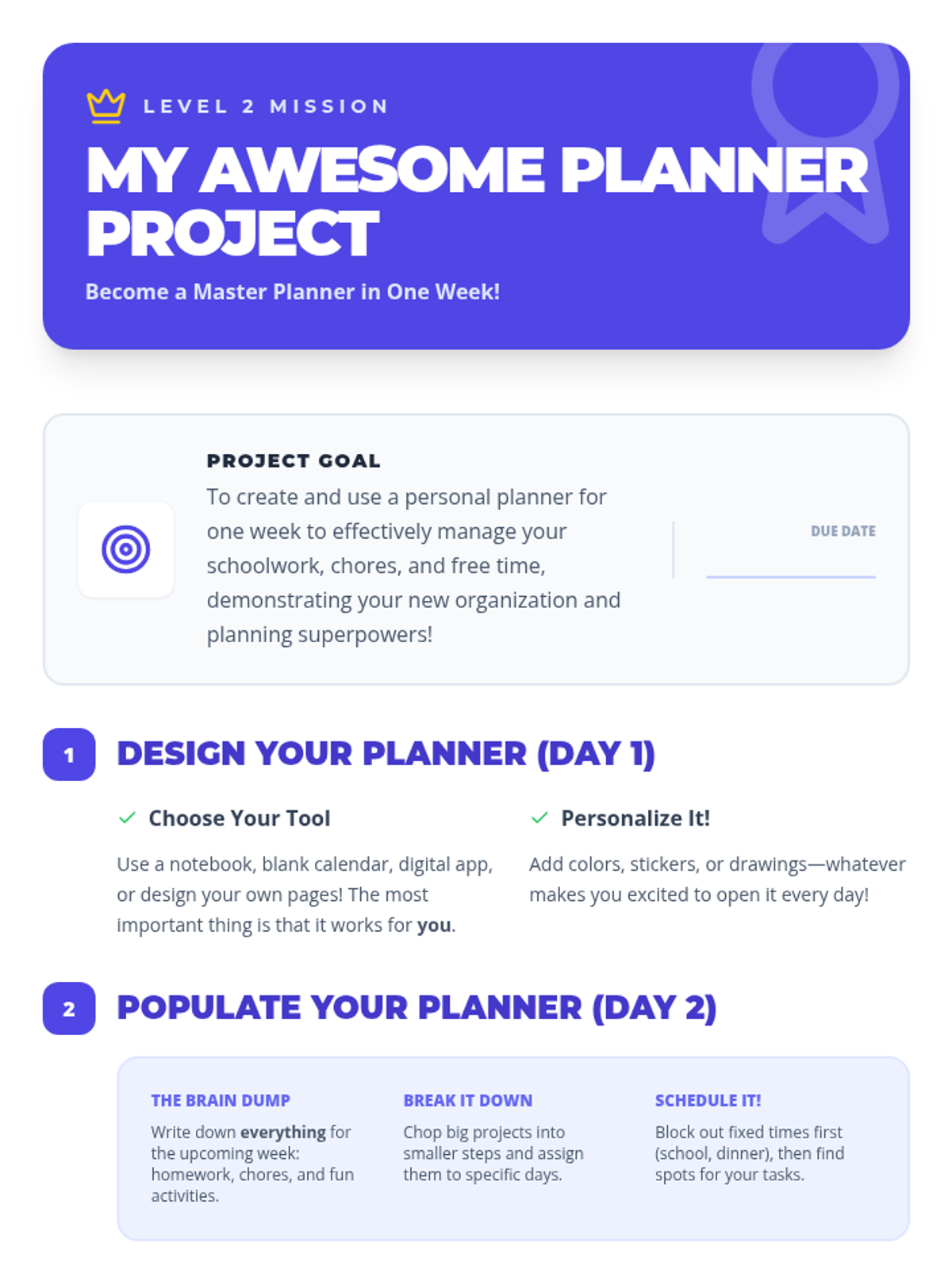 A two-part series for 5th and 6th graders designed to build foundational organization and planning habits. Students transition from learning the '3-Step Planning Toolkit' to applying advanced scheduling techniques, culminating in a week-long personal planner project.