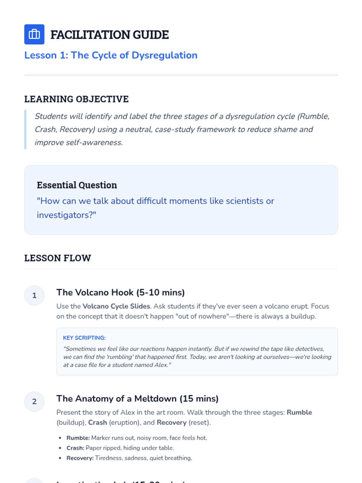 A comprehensive 5-lesson sequence designed for 4th-grade students to understand the cycle of emotional dysregulation, identify personal triggers, and learn the restorative process of repair. Using a 'Detective/Investigator' theme, students analyze a fictional case study to remove shame and treat behavioral incidents as valuable data for future growth.
