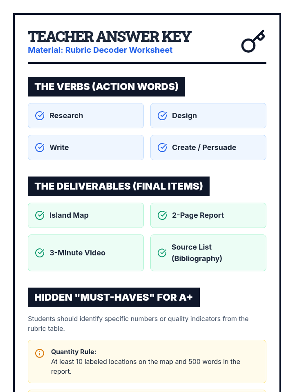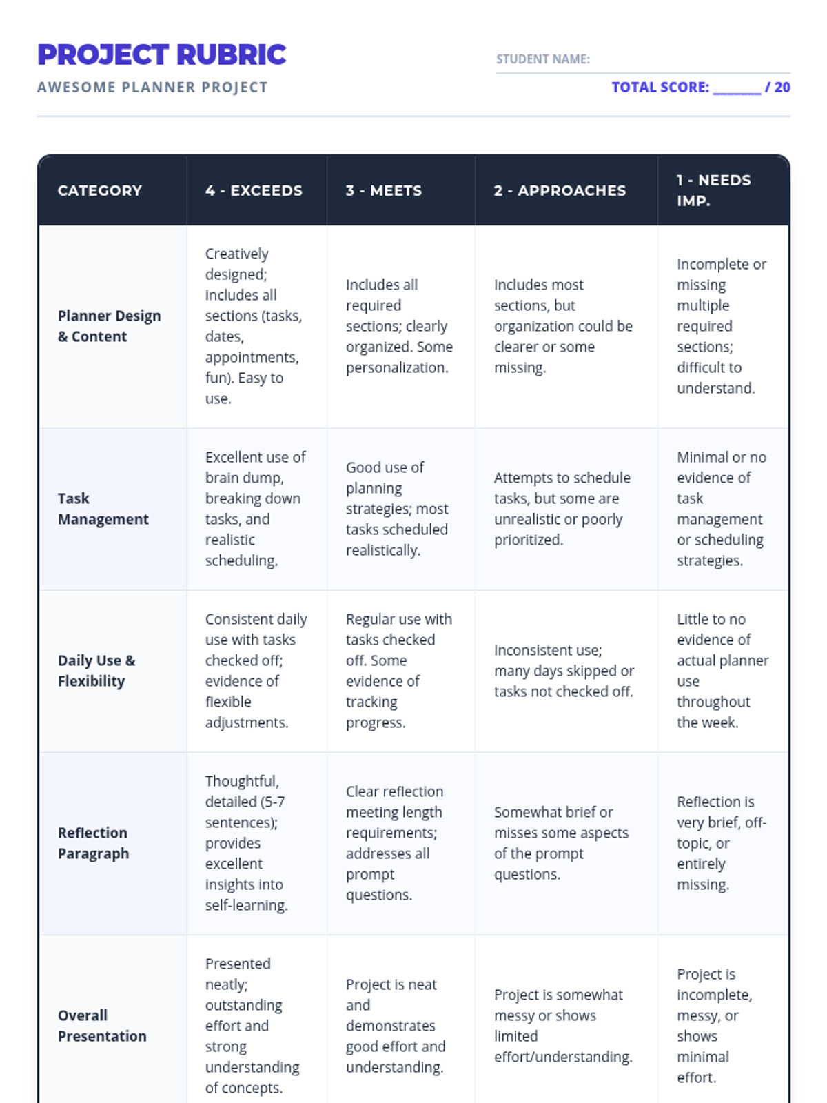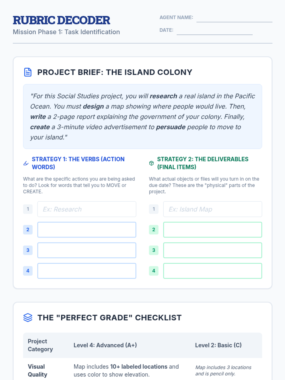 An executive function workshop for 6th-grade students focused on the mechanics of backward planning, task decomposition, and self-monitoring for long-term projects. Students learn to translate complex rubrics into actionable schedules and adapt to challenges along the way.