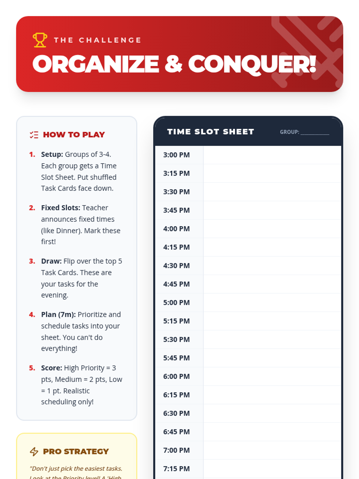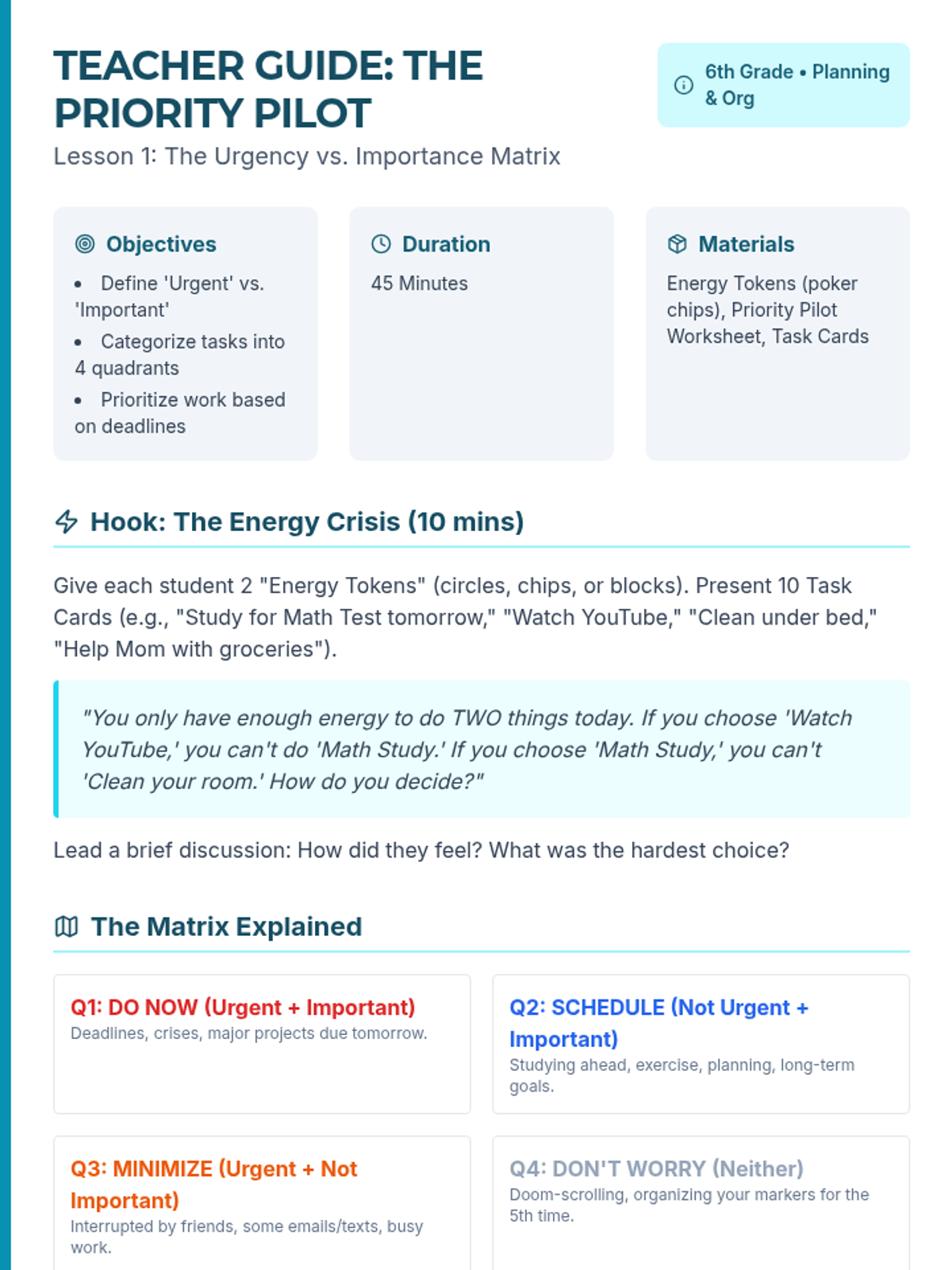 A comprehensive executive functioning unit for 7th grade students to master task prioritization using the Eisenhower Matrix. Students move from conceptual understanding to practical, daily application through simulations and personalized planning.
