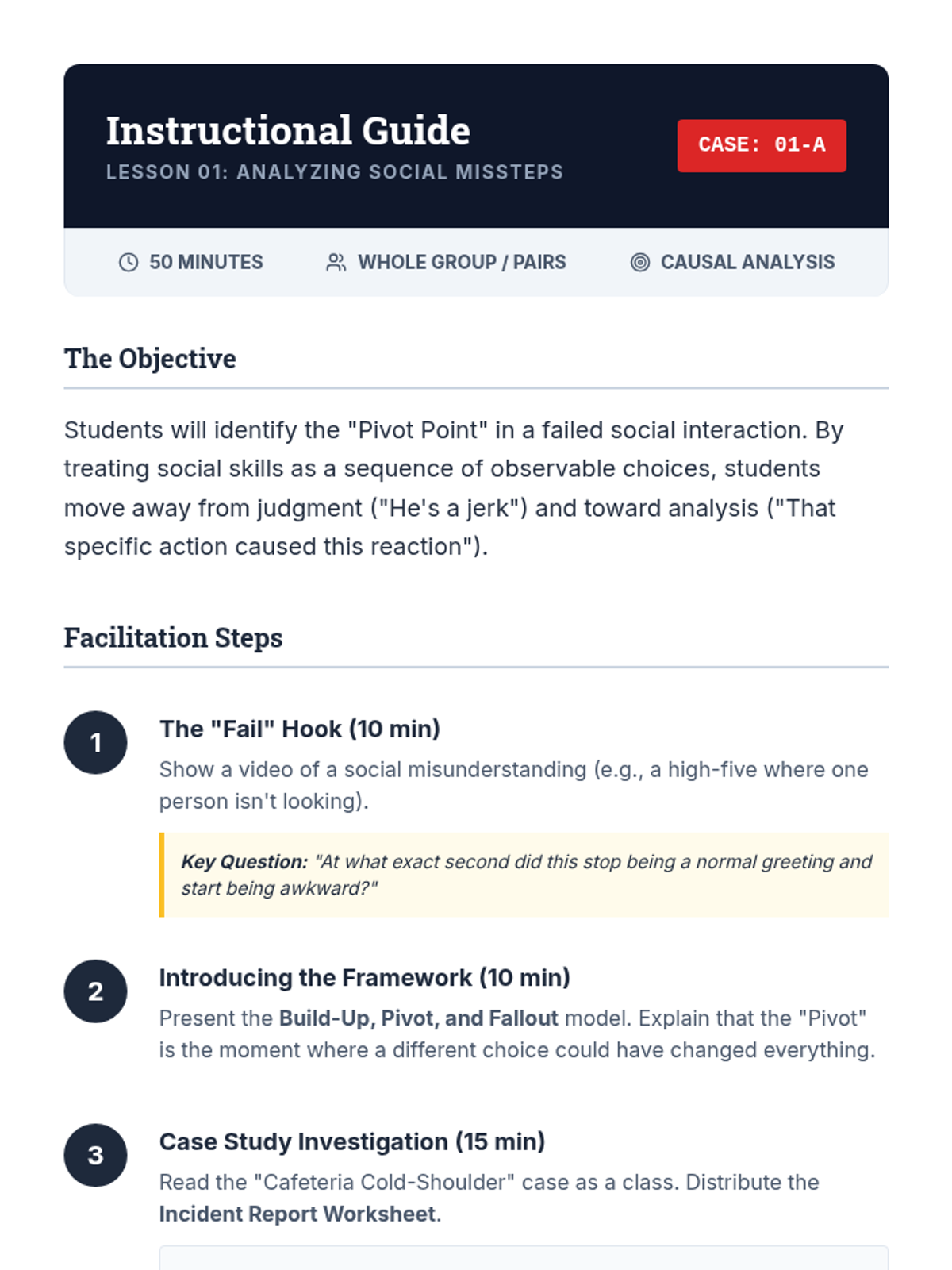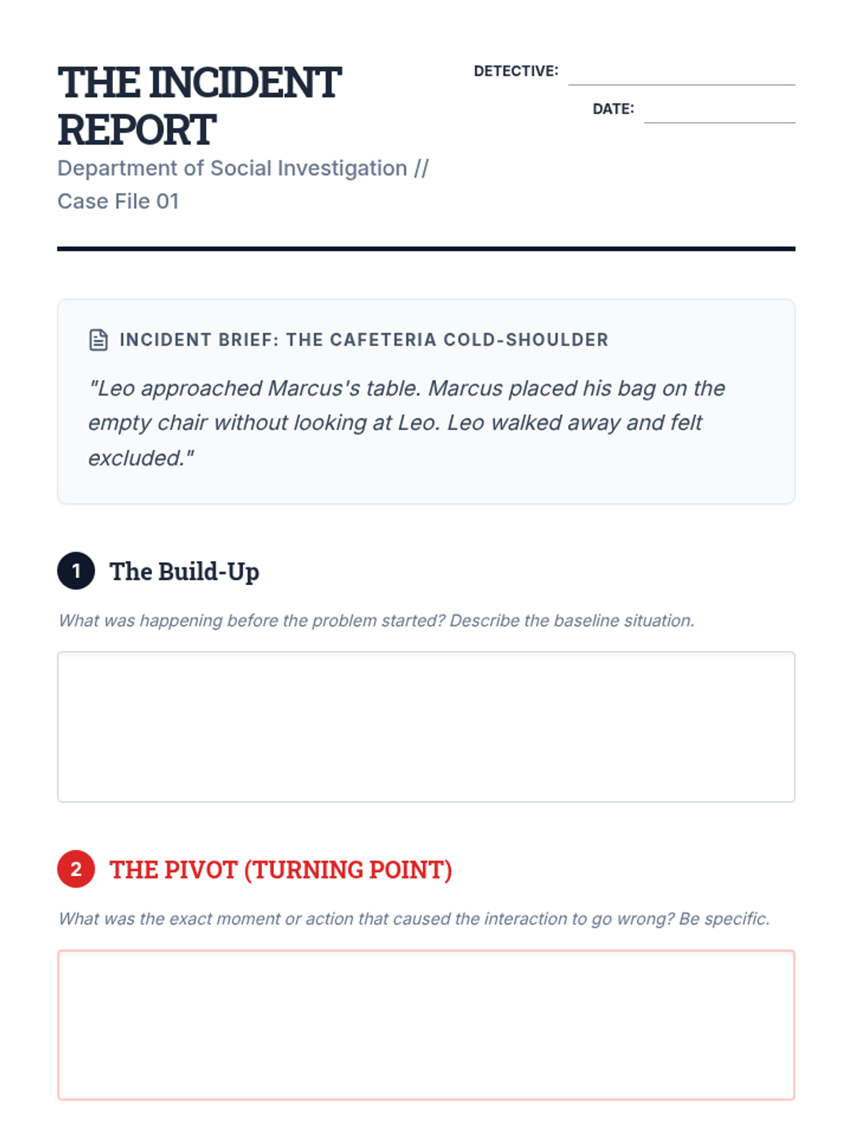 A case study-focused sequence where students act as social detectives to analyze failed interactions and rewrite narratives. By analyzing fictional characters first, students build empathy and causal reasoning before applying these skills to their own social challenges.