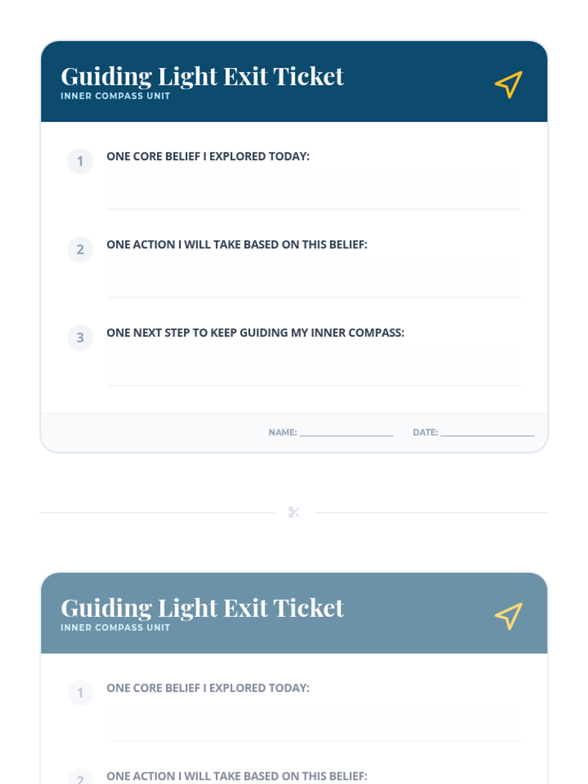 A Tier 2 small-group unit for 6th graders focused on building self-awareness and identifying core values to guide decision-making. Over four sessions, students navigate their 'inner compass' through strengths discovery, values mapping, and scenario-based practice.
