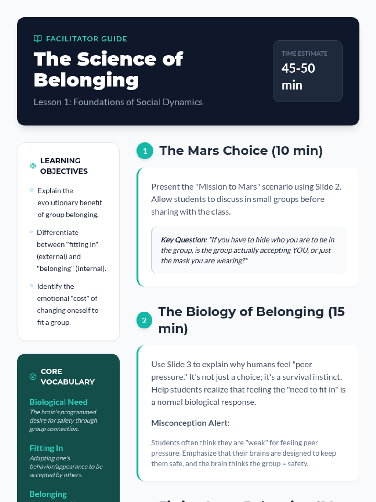 An inquiry-based sequence exploring the psychology of belonging, the nature of peer pressure, and the power of personal values. Students investigate social dynamics to build resilience and decision-making skills in high-risk situations involving substance use.