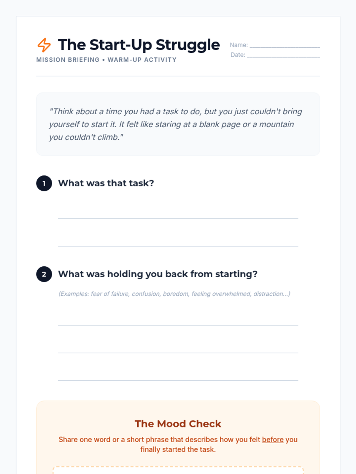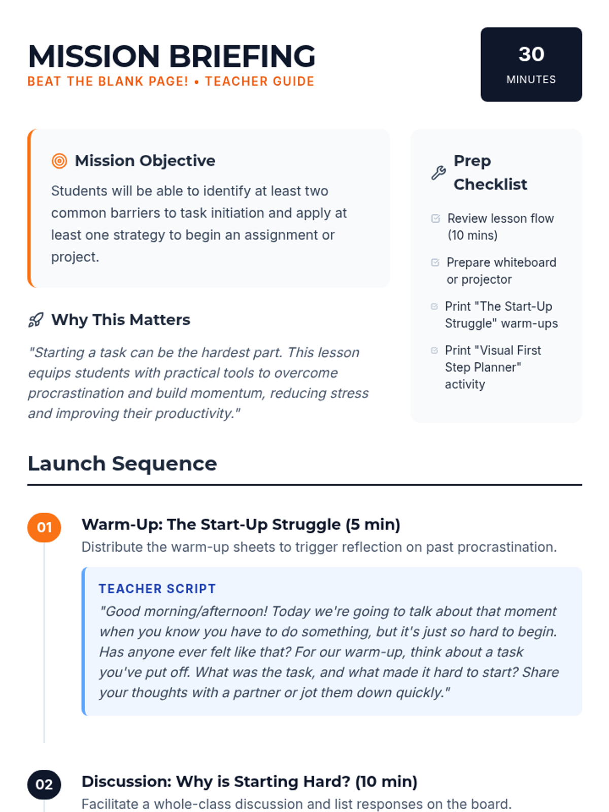 A 5-lesson executive function bootcamp for 7th-grade students, focusing on breaking down complex projects, backwards planning, and visual task management. Students learn to transition from reactive to proactive habits through hands-on activities and visual tracking systems.
