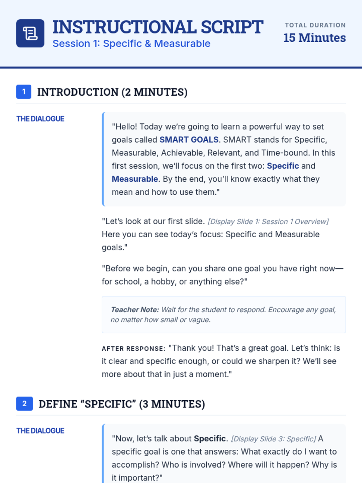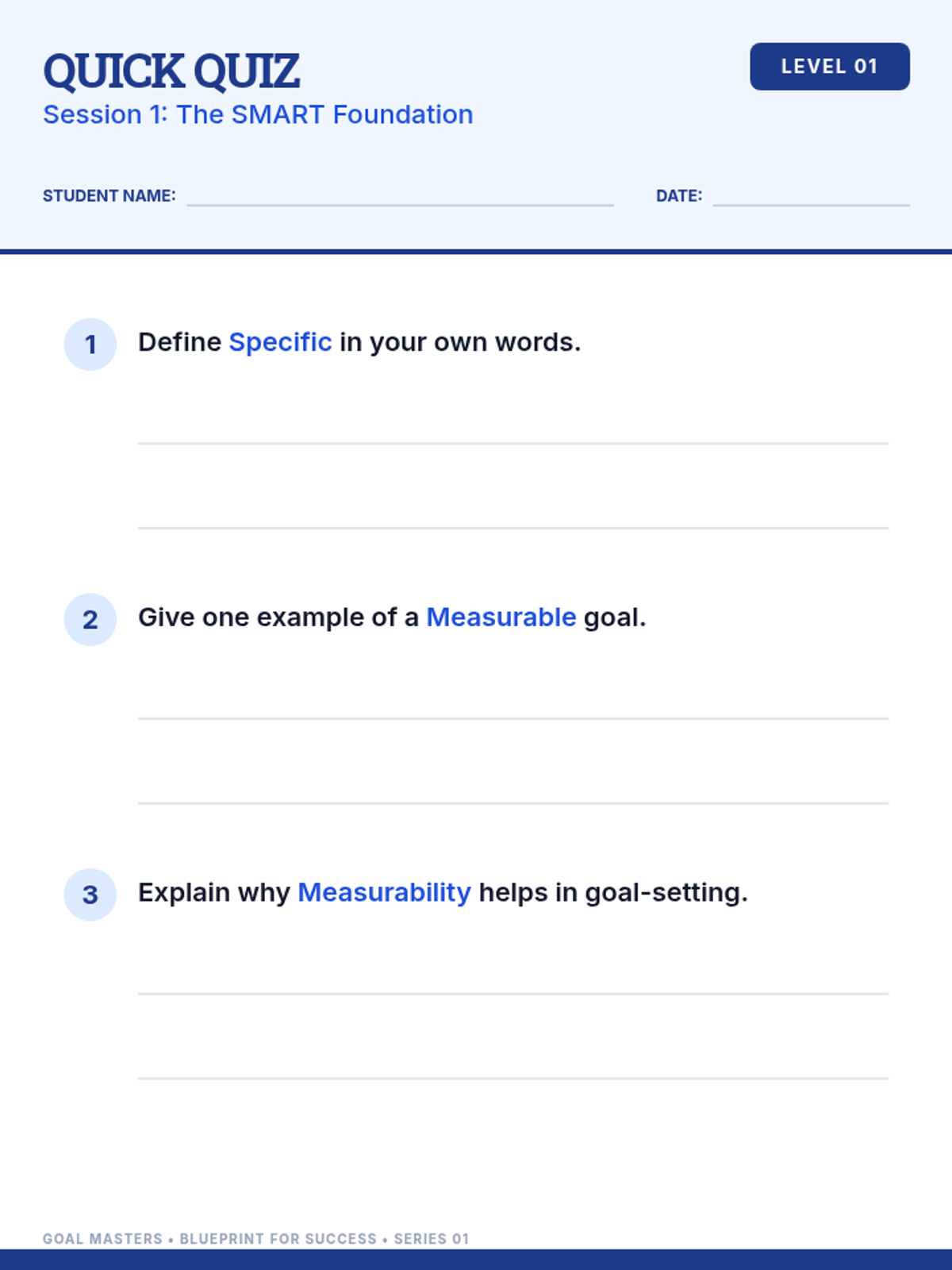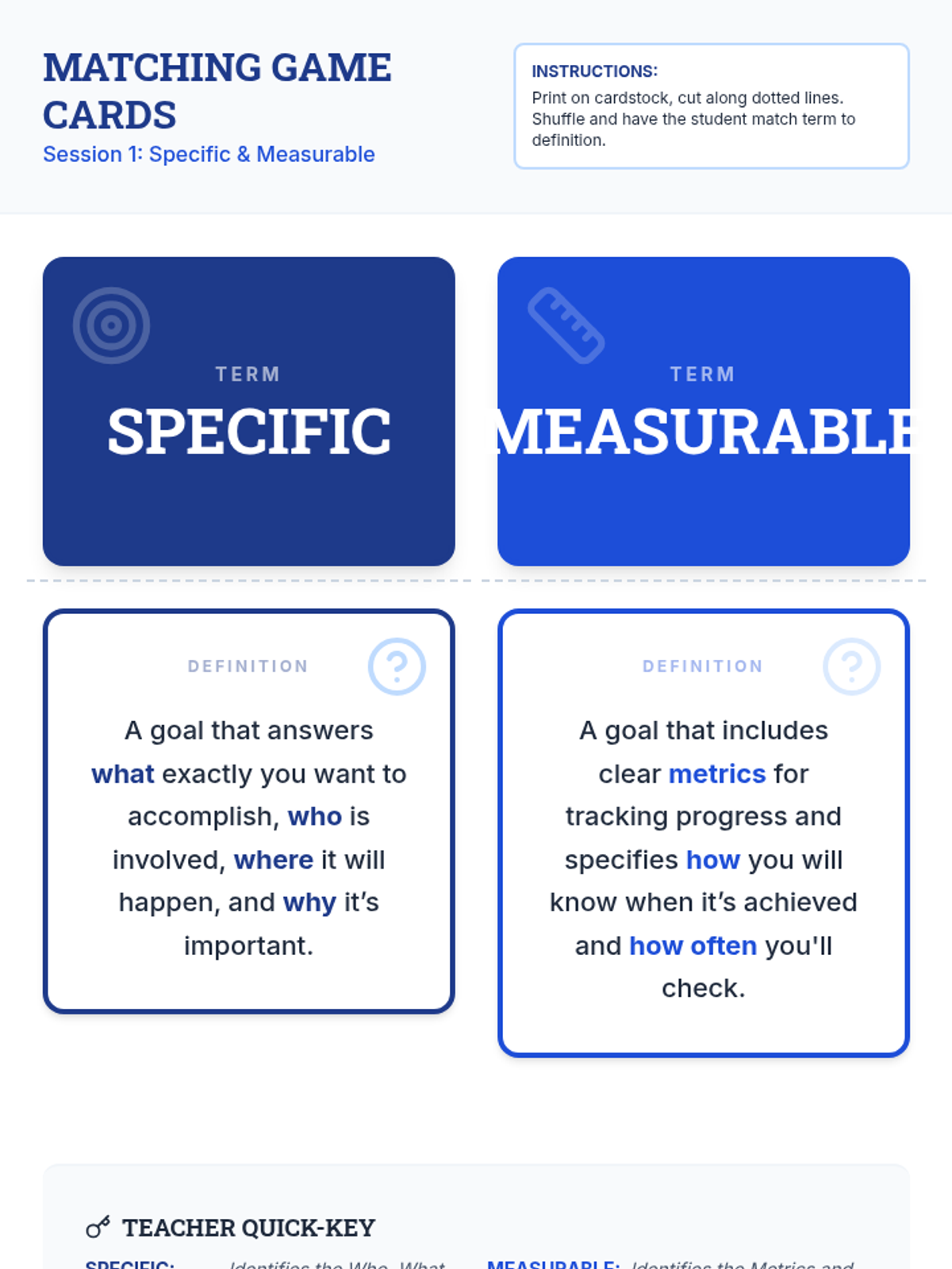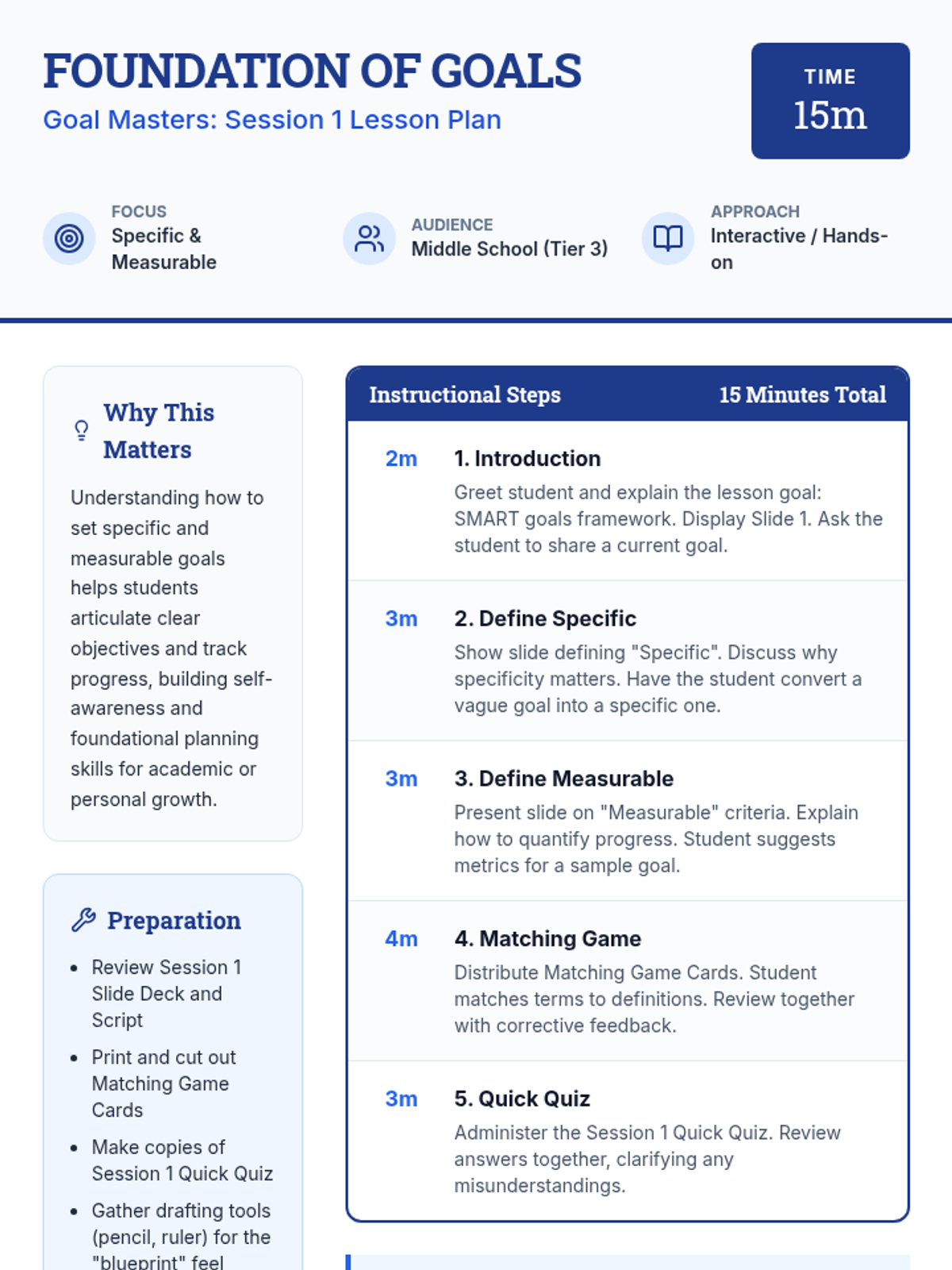 A 3-session individual Tier 3 lesson series for middle school students to master the SMART goal-setting framework. Students learn to refine vague intentions into Specific, Measurable, Achievable, Relevant, and Time-bound objectives through interactive matching games, guided scripting, and formative assessments.