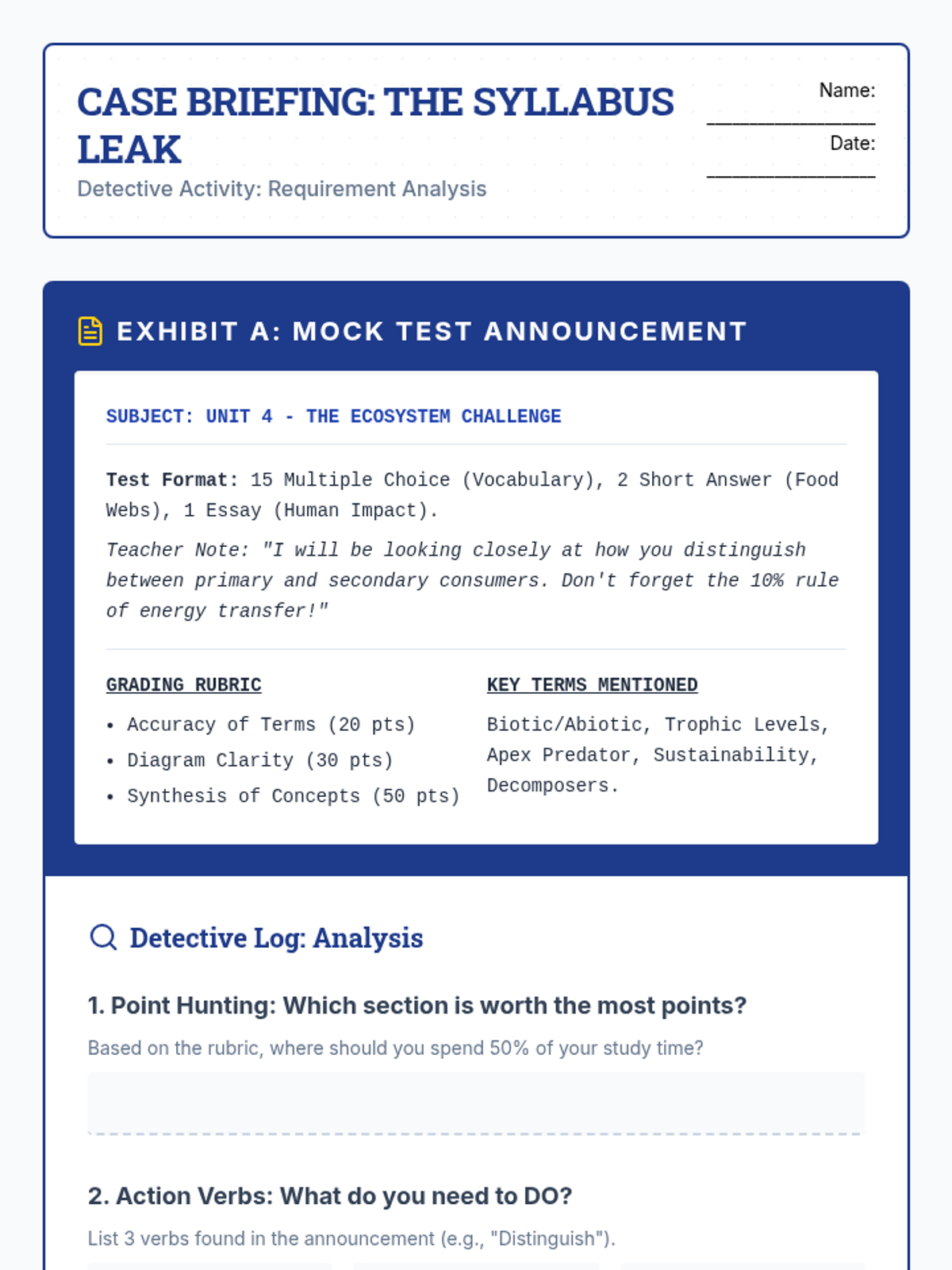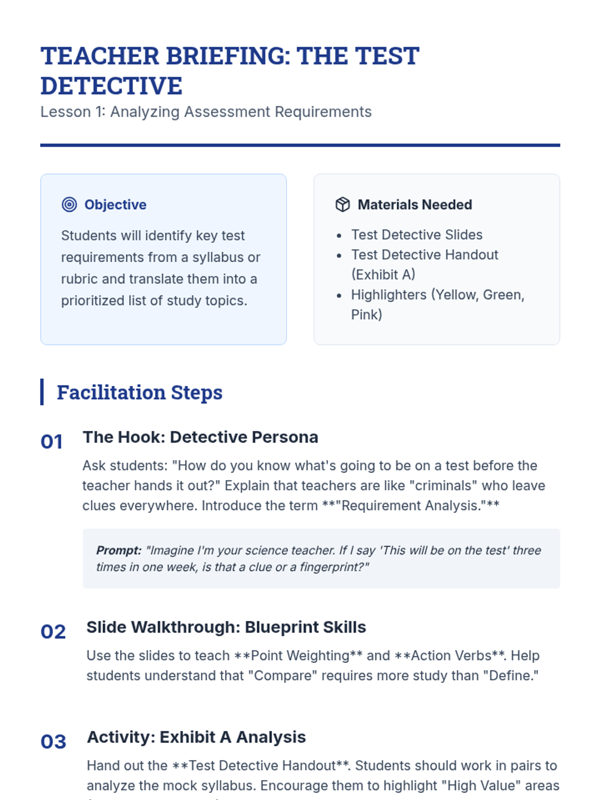 A project-based sequence for 6th graders to master the art of study guide creation. Students progress from deconstructing assessment requirements to synthesizing resources, drafting active recall questions, and physically assembling a review tool.