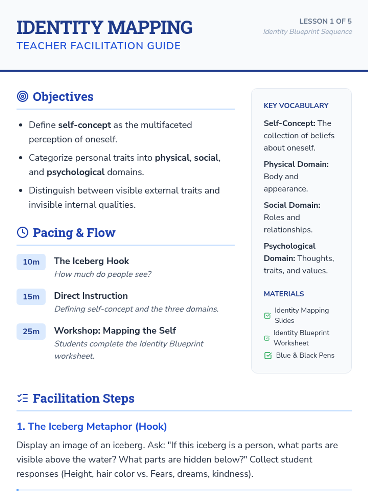 This sequence guides 6th-grade students through an exploration of self-concept, personality traits, and core values. Students move from mapping their identity to understanding mindset and synthesizing their findings into a personal narrative.