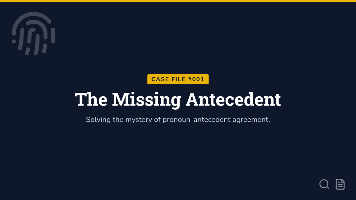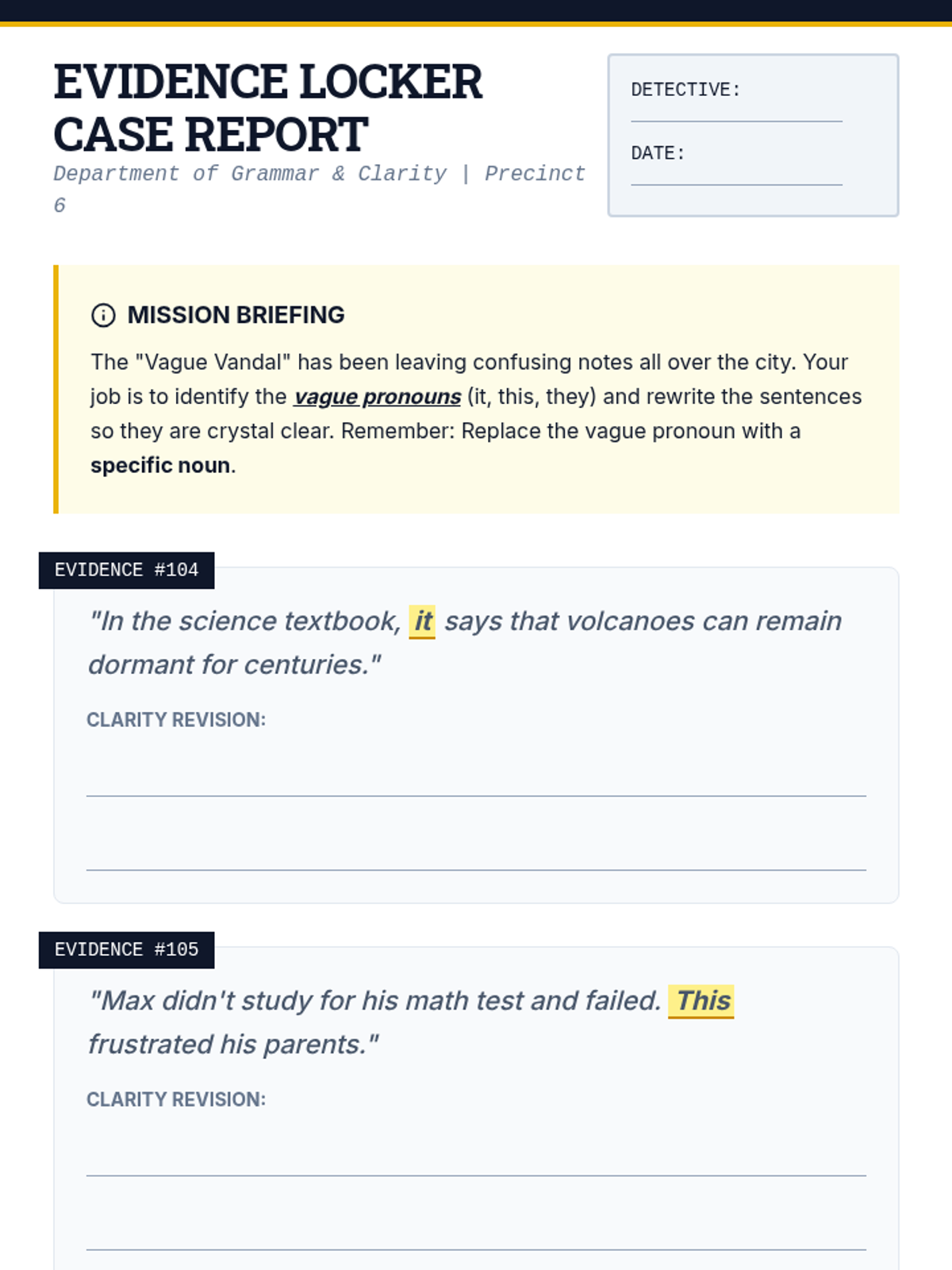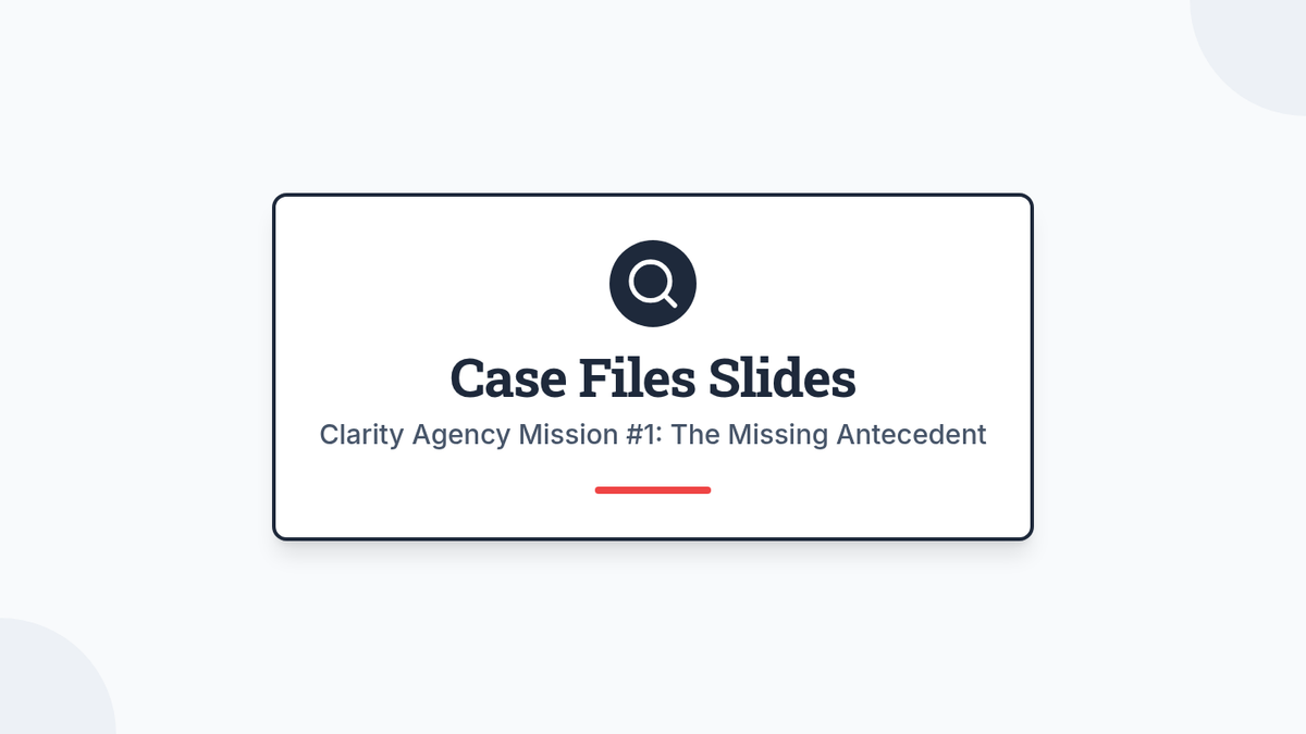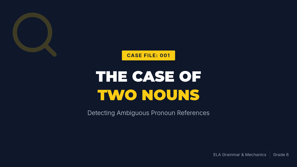 A case-study focused unit where students become 'Clarity Detectives' to identify and fix vague pronoun references in writing. Students move from diagnosing ambiguity to mastering specific strategies for clear communication.