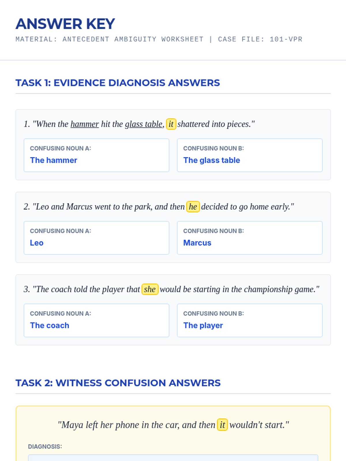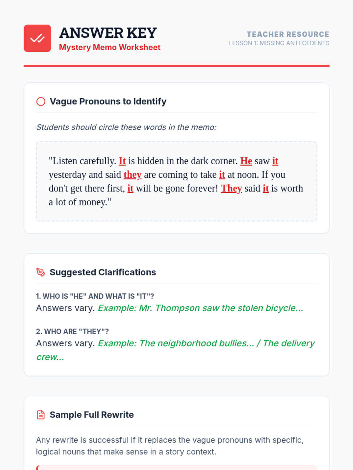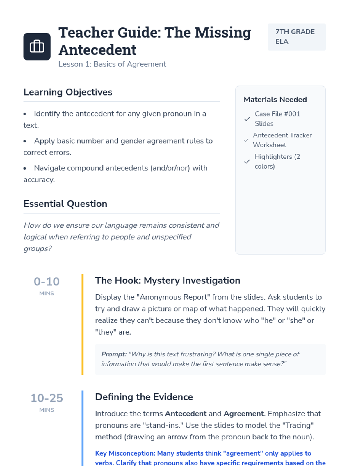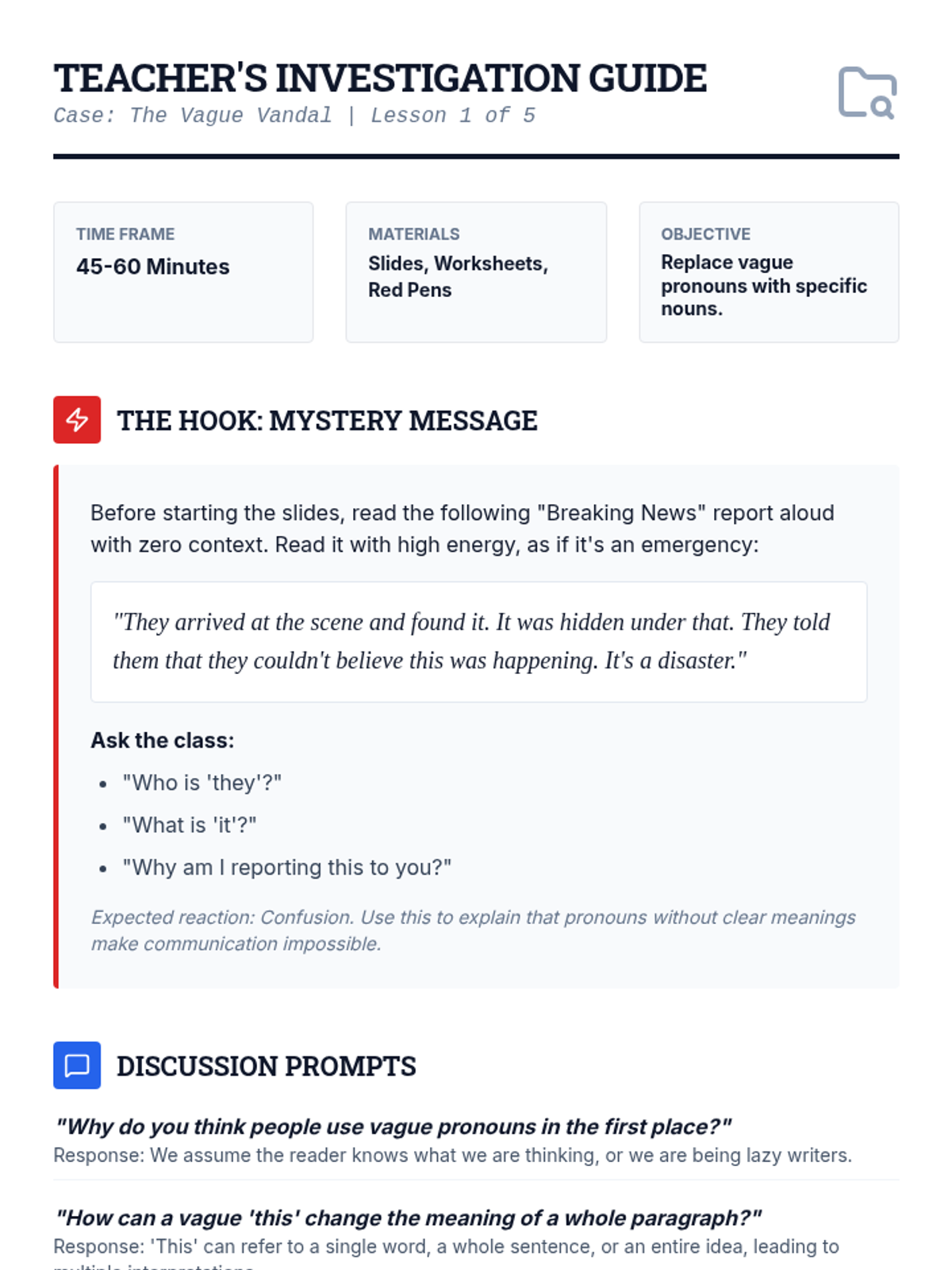 A case-study focused unit where students become 'Clarity Detectives' to identify and fix vague pronoun references in writing. Students move from diagnosing ambiguity to mastering specific strategies for clear communication.