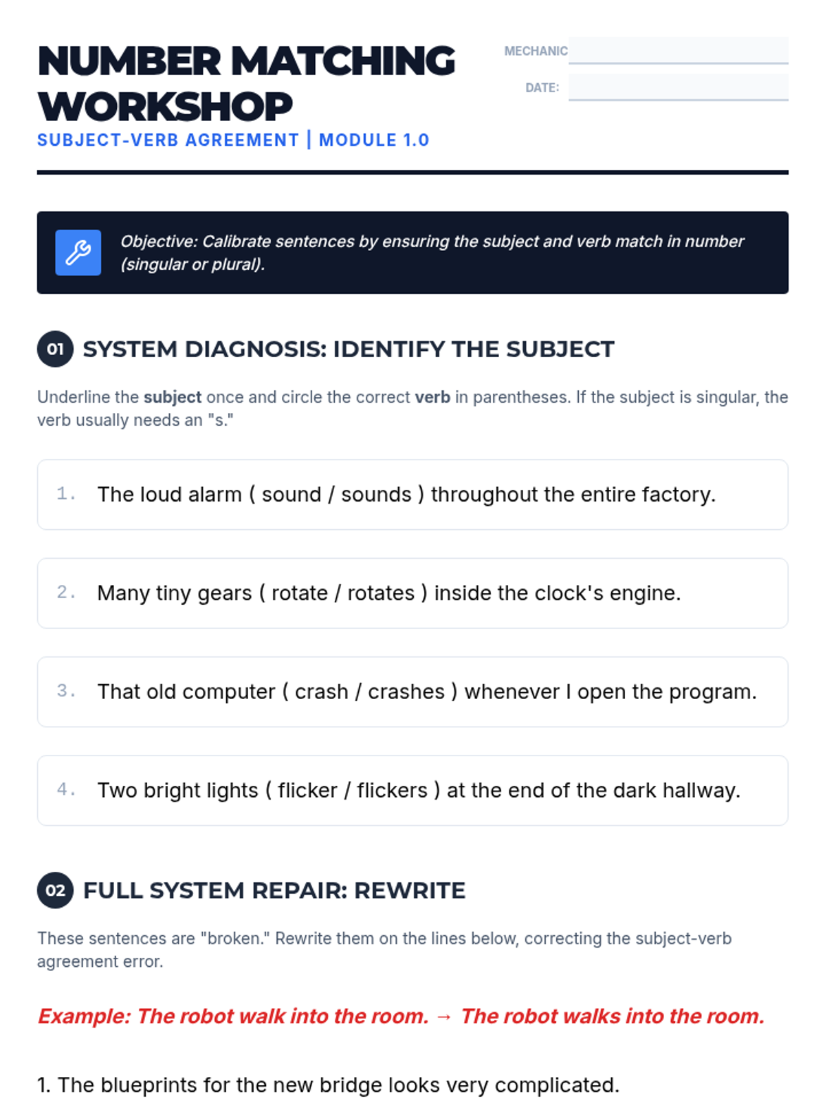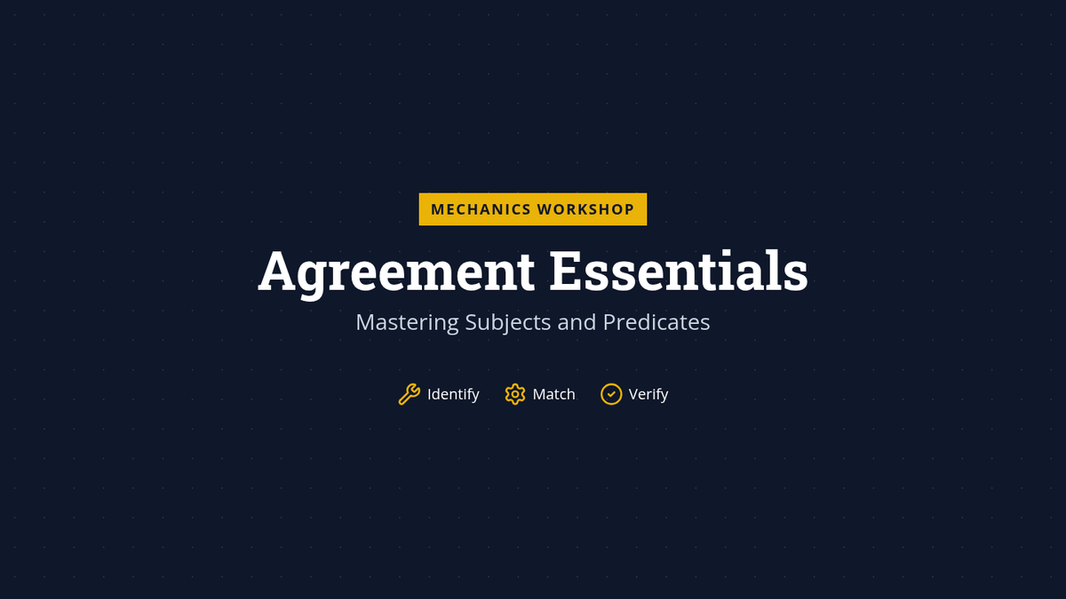 This workshop-style sequence transforms 6th-grade students into 'Grammar Mechanics' as they master subject-verb agreement in complex scenarios. Students progress from basic number matching to handling compound subjects, intervening phrases, and tricky indefinite pronouns, culminating in a comprehensive text-repair challenge.