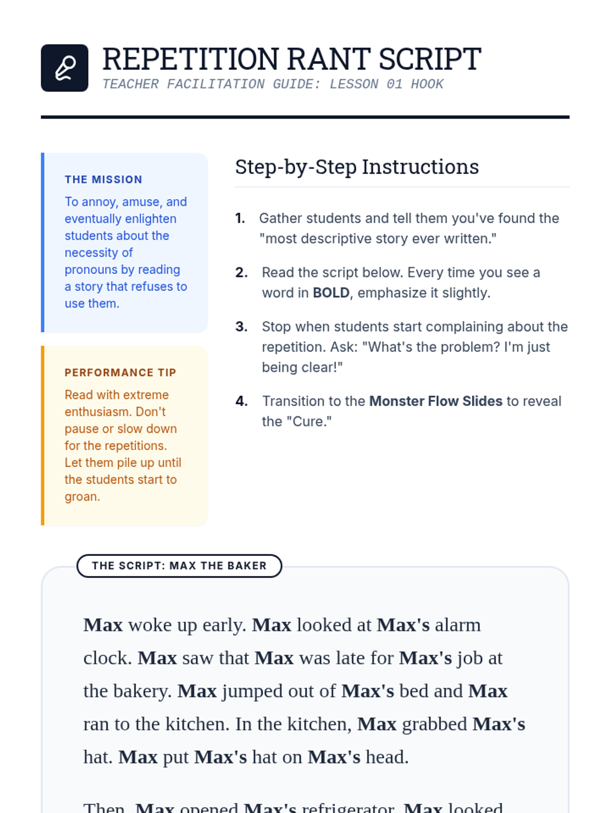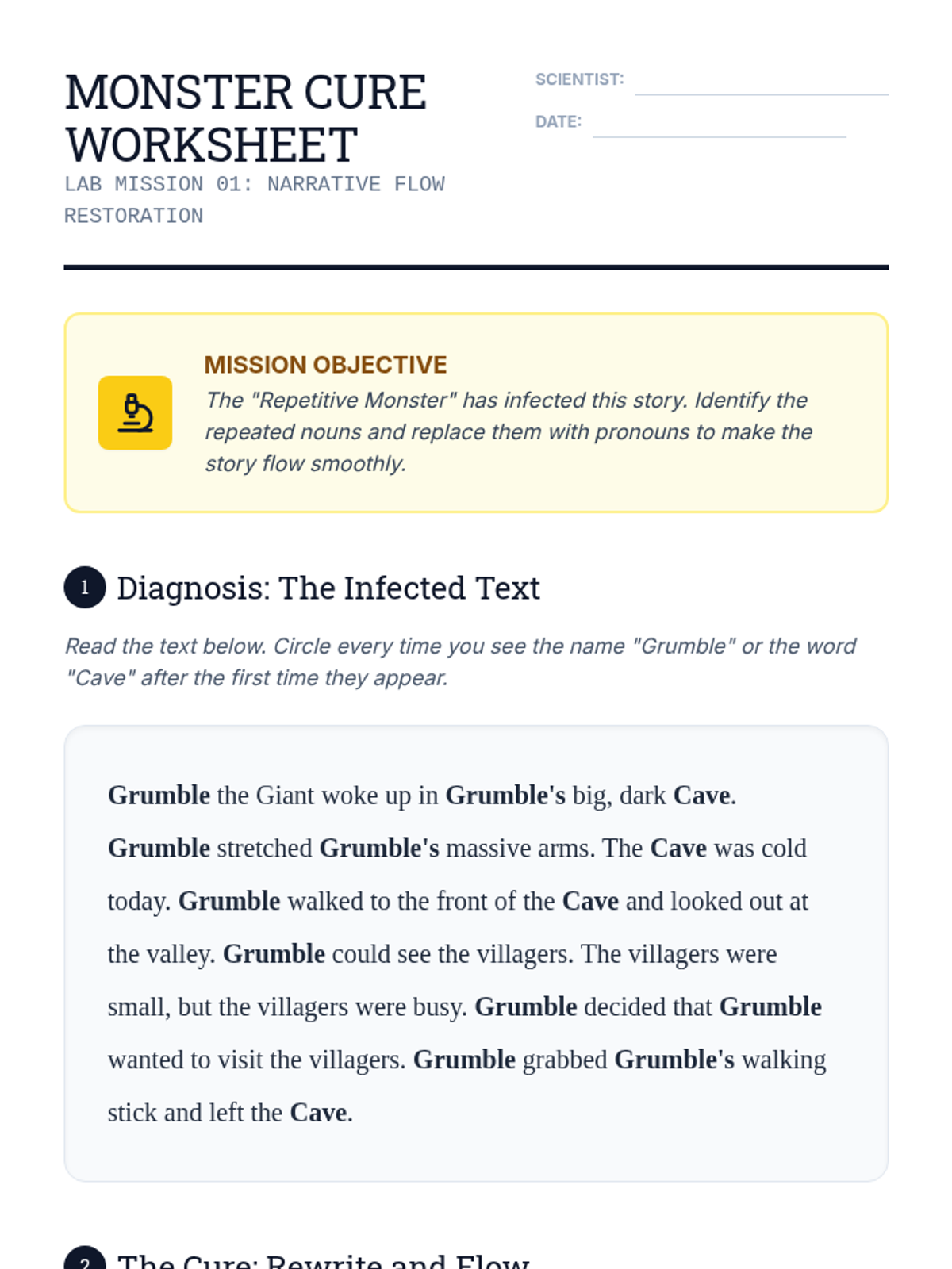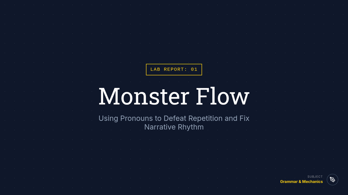 Students explore pronouns and antecedents as stylistic tools to improve narrative flow. They learn to replace repetitive nouns, manage multiple characters with clear pronoun references, and culminate in a polished character-driven story.