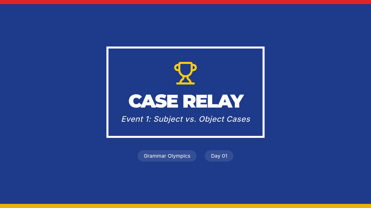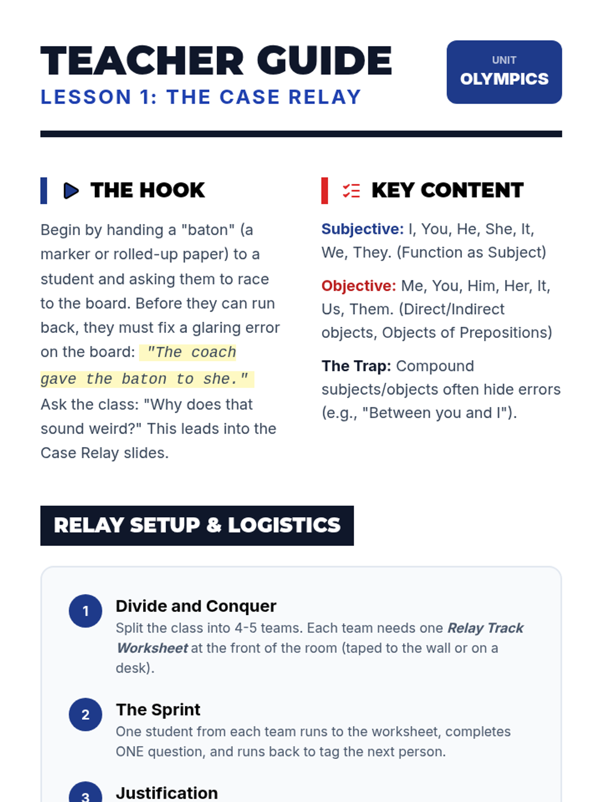 A gamified grammar unit where students compete in 'Olympic' events to master personal, possessive, indefinite, and relative pronouns. The sequence emphasizes speed, accuracy, and grammatical justification through a series of high-energy, collaborative challenges.